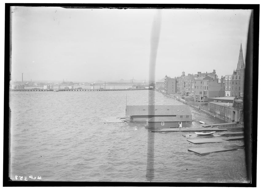The image shows a view of Back Bay in Boston, Massachusetts, with water in the foreground. A building, likely a boathouse, is situated on the water with several docks extending from it. In the background on the right, there is a row of buildings along the waterfront, and additional structures are vi...