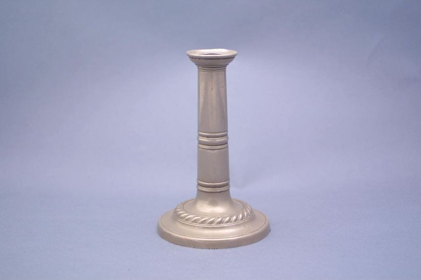 Rounded pewter candlestick with broad base decorated with braided band; concave bobeche; double fillets slightly above base; triple fillets in the middle of the stem with center fillet slightly larger than the surroundding two.