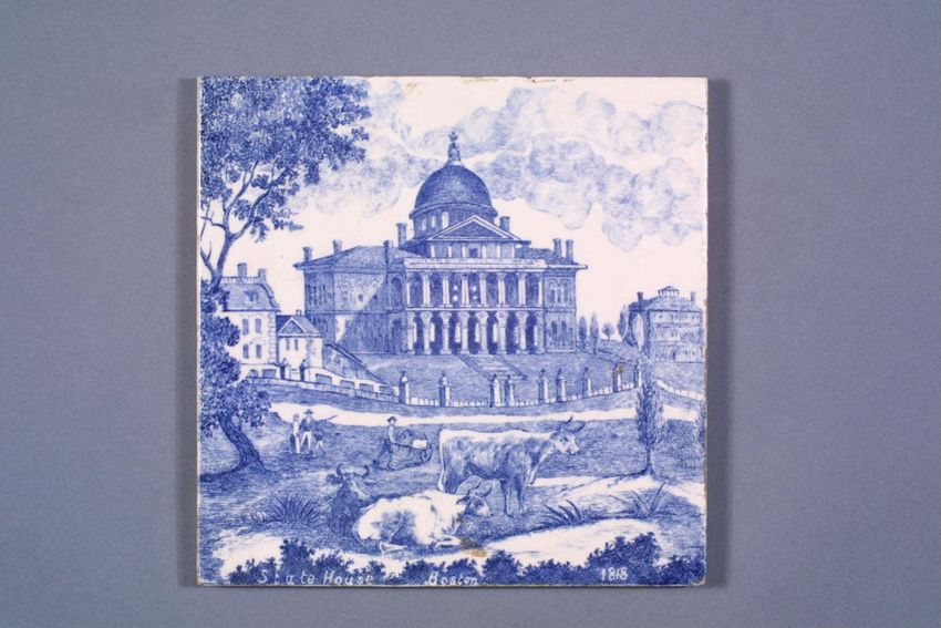 Square, decorative ceramic tille; white background, blue print of the Massachusetts State House in 1818, cows in foreground, men and a man with a wheelbarrow in the midground.