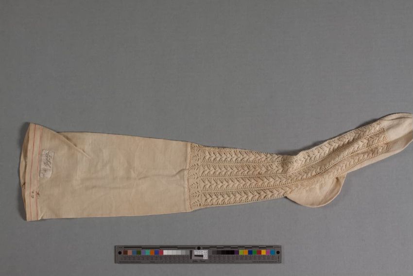 Single cream-colored knit stocking, possibly fine cotton with openwork vertical herringbone pattern at the front ankle area. Sewn in tag with handwritten "LW Plympton No 2".