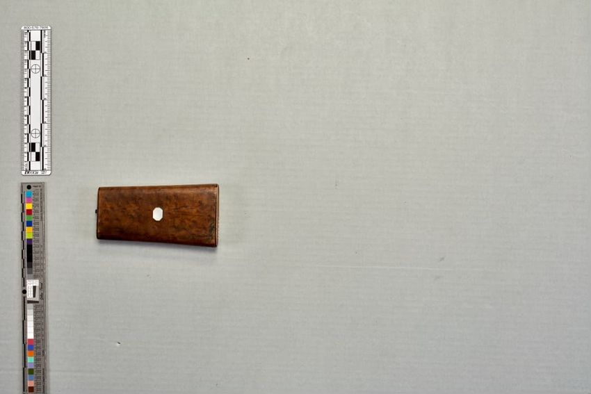 Brown wooden trapezoidal case with an inlaid pearl design.