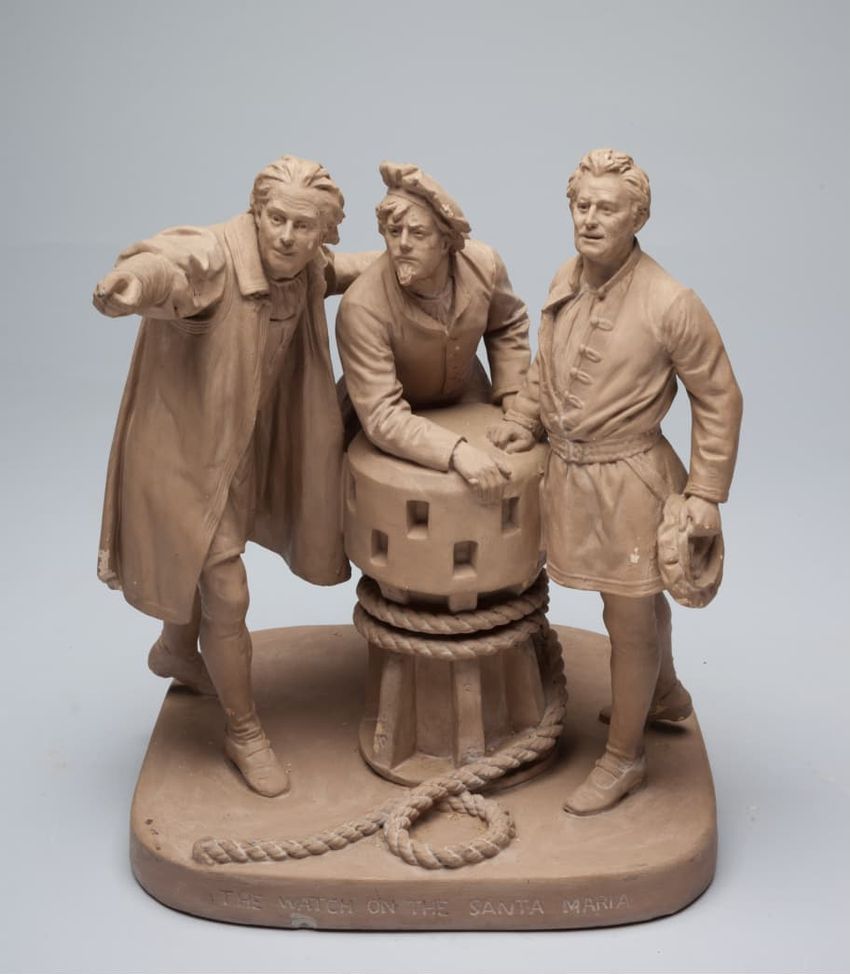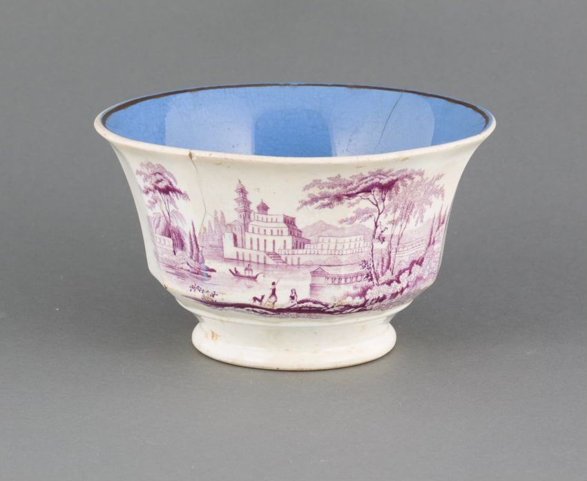 Earthenware waste bowl with mulberry-colored transfer-print pattern depicting large building on a waterway. A couple with a dog is in the foreground and a gondola-like boat floats on the water. A part of the scene is repeated in the interior base of the bow. A broad blue band outlined in black is pa...