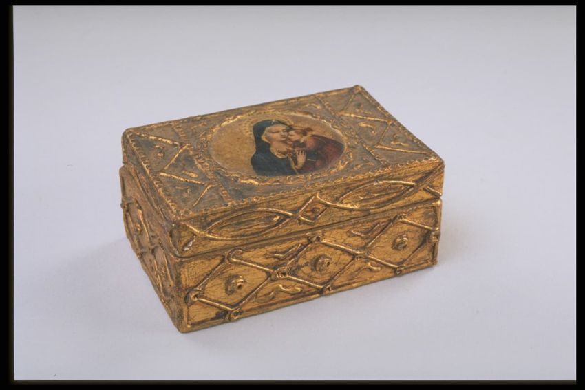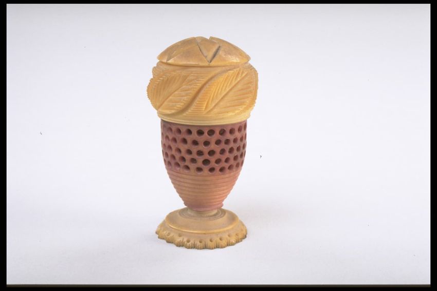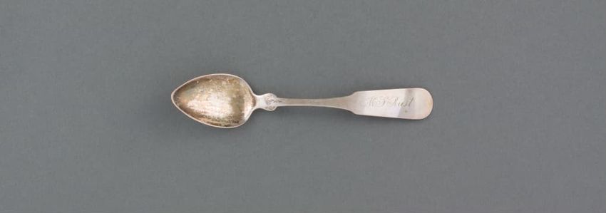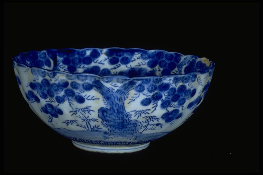 An octagonal pitcher with a square handle. The pitcher has a transfer print decoration of a Chinoseire pattern of buildings, fences, and a large vase with a border of leaves, vines and a building, "The Temple".