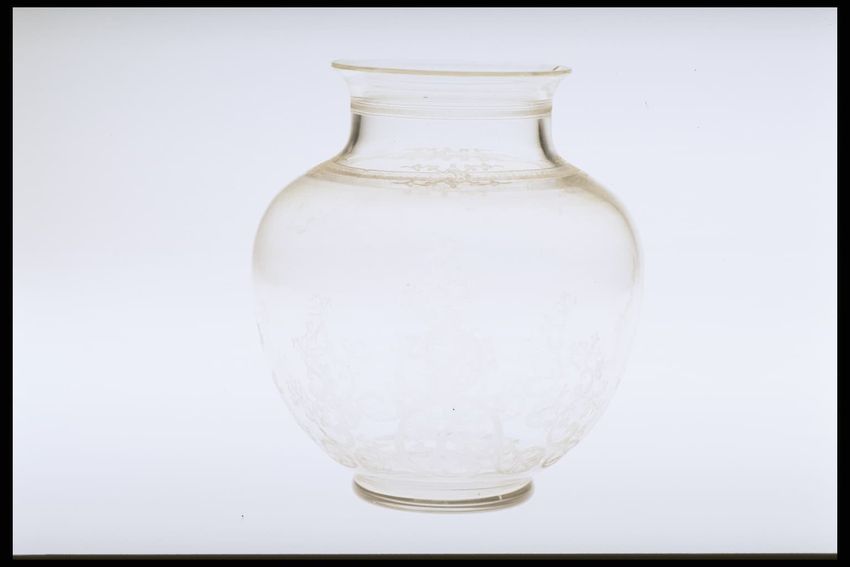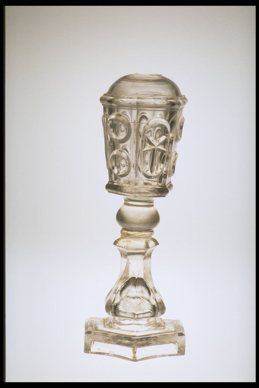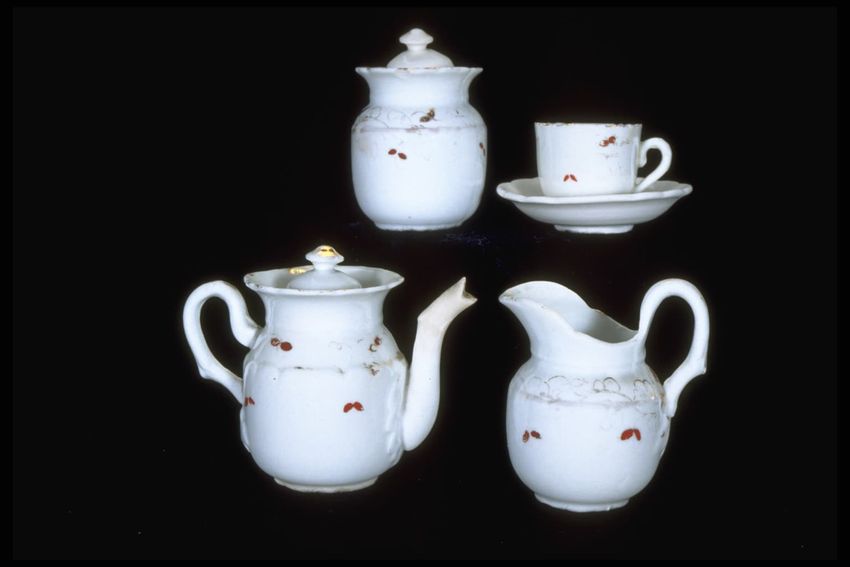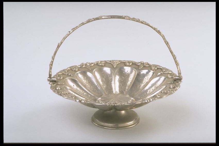 Square-shaped trunk. Pine, leather, metal, brass. Black leather covered form with waterfall-edged flat top; metal strapping with brass bosses, sides, and center. Leather straps at sides. Remains of leather straps. Leather tooled with geometric pattern. Lined with linen. Tray with cotton toupe(?) b...