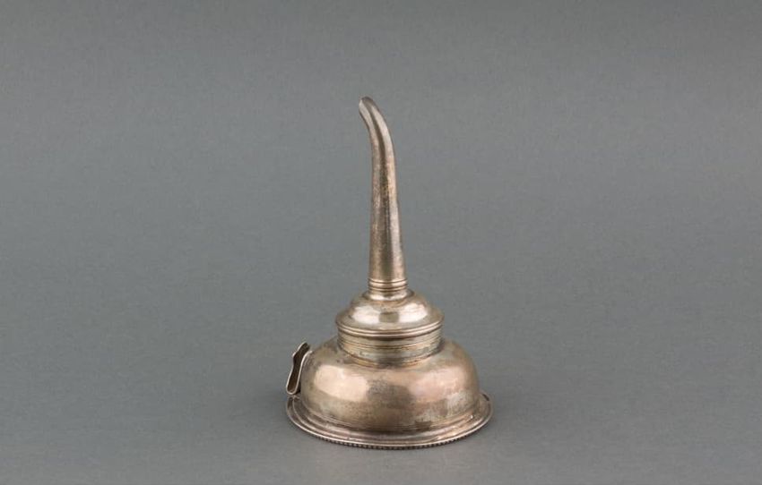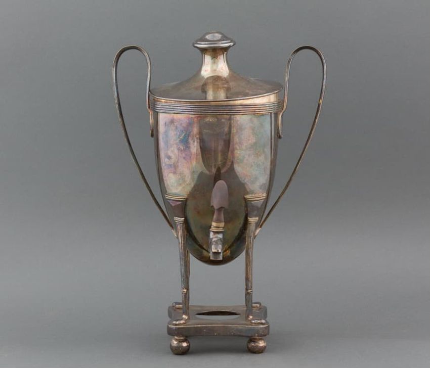 Straight tapering sides, flat bottom, band on bottom forming foot. Scrolled wooden handle with scroll handle sockets. Top, hinged to handle socket, domed with incised lines and acorn-like finial. Curved spout with incised lines and leaf at spout opening.