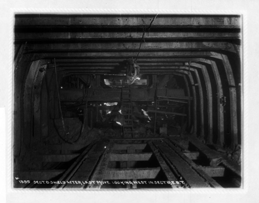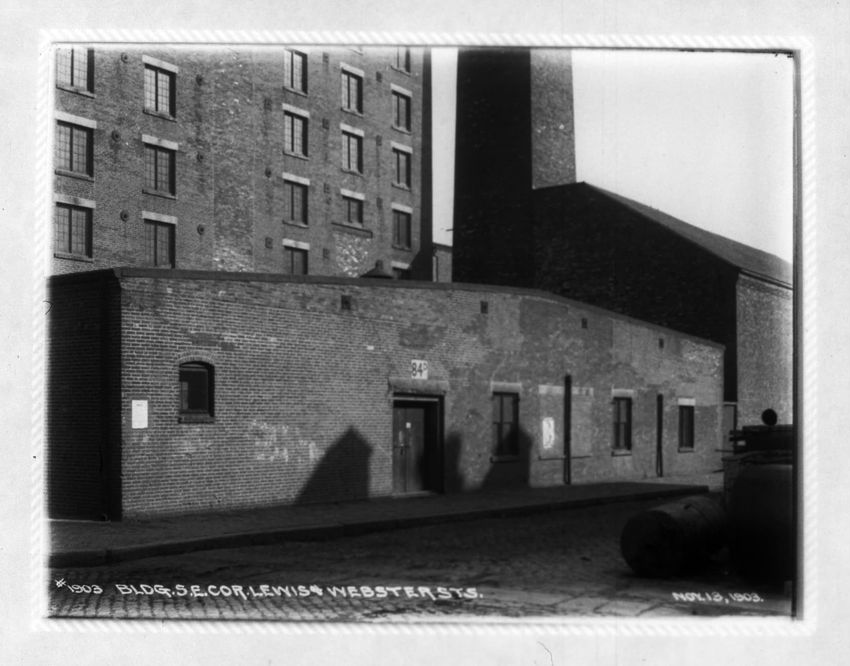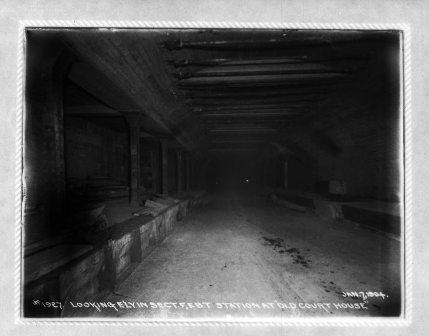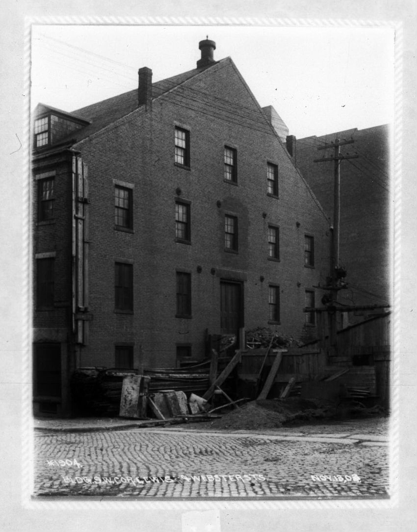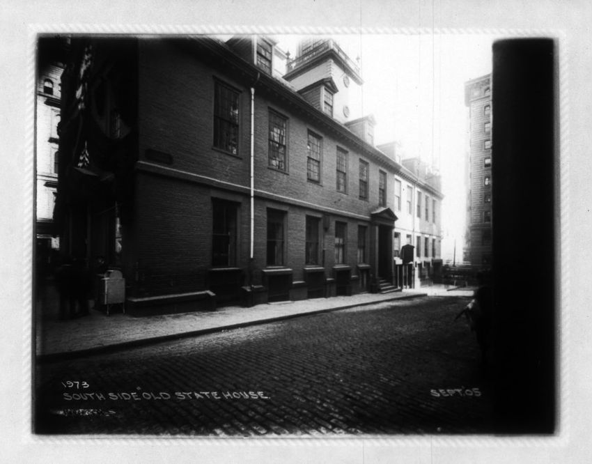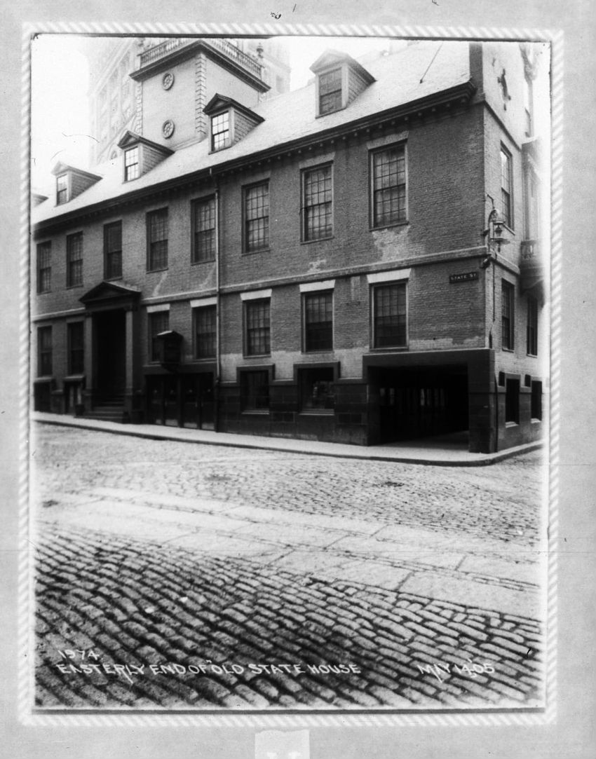 The sign reads "East Boston Tunnel" and is the State Street Station subway entrance in the Old State House. The Devonshire Street corner, below the decorative lamppost, is the subway station exit. The second Brazer Building can be seen on the right side of the image. The East Boston Tunnel sign for ...
