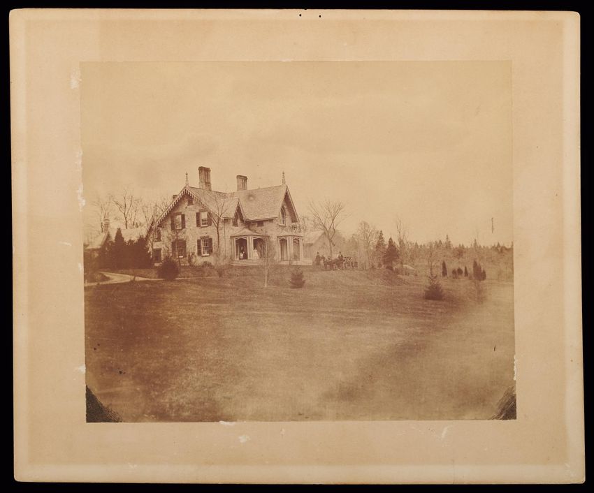 Albumen print depicting exterior view of William Appleton Thomas's house in Kingston, Rhode Island. Two unidentified women and an unidentified child are pictured on the porch of the house. Two unidentified men are pictured standing near the house with a horse and open carriage.
