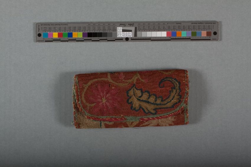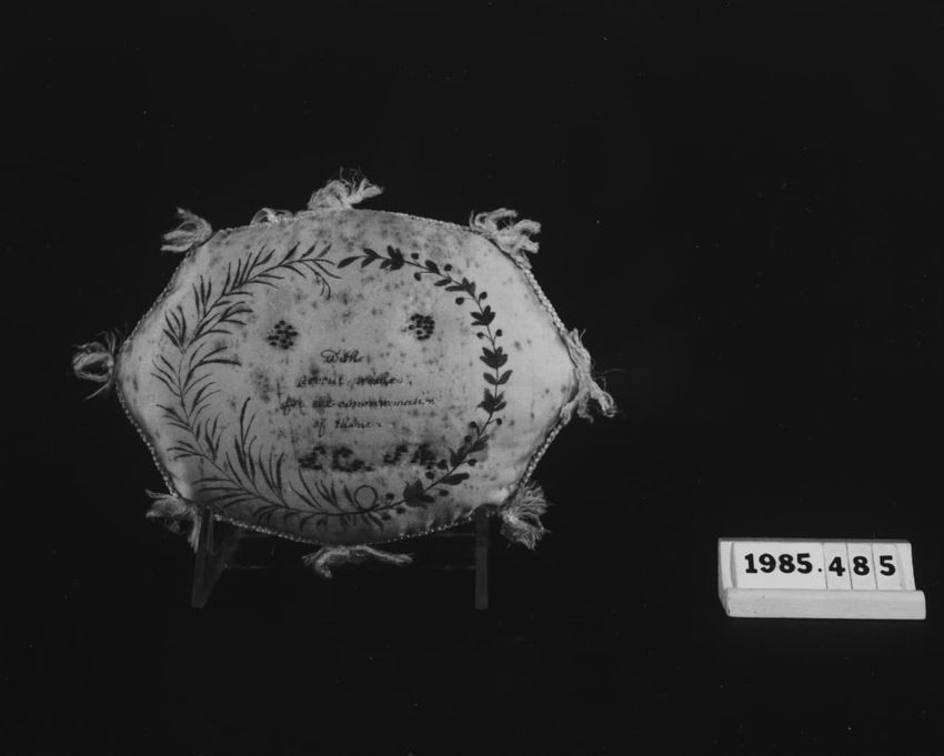 The fabric is printed red on white with many figural vignettes showing Don Quioxote, dancing girls, wild boars, fountains, fences and trees, and is formed to fit a square backed arm chair with a ruffle about the entire skirt. It is machine sewn, but homemade.