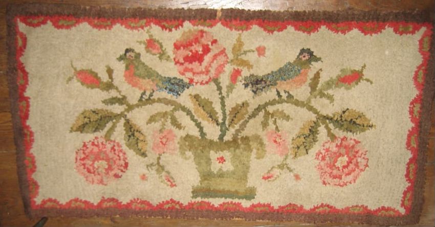 Square rug with striped outer border; two inner borders of boxed "X"s and short diagonal stripes and square field of four flowerheads; worked in shades of brown, red, pink, blue, beige, and green in wool and cotton burlap foundation.