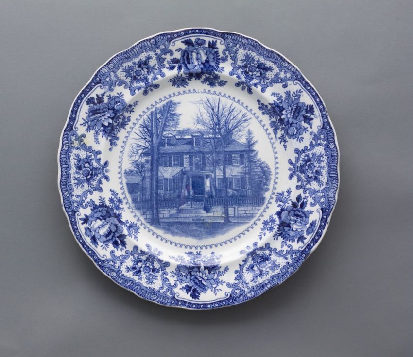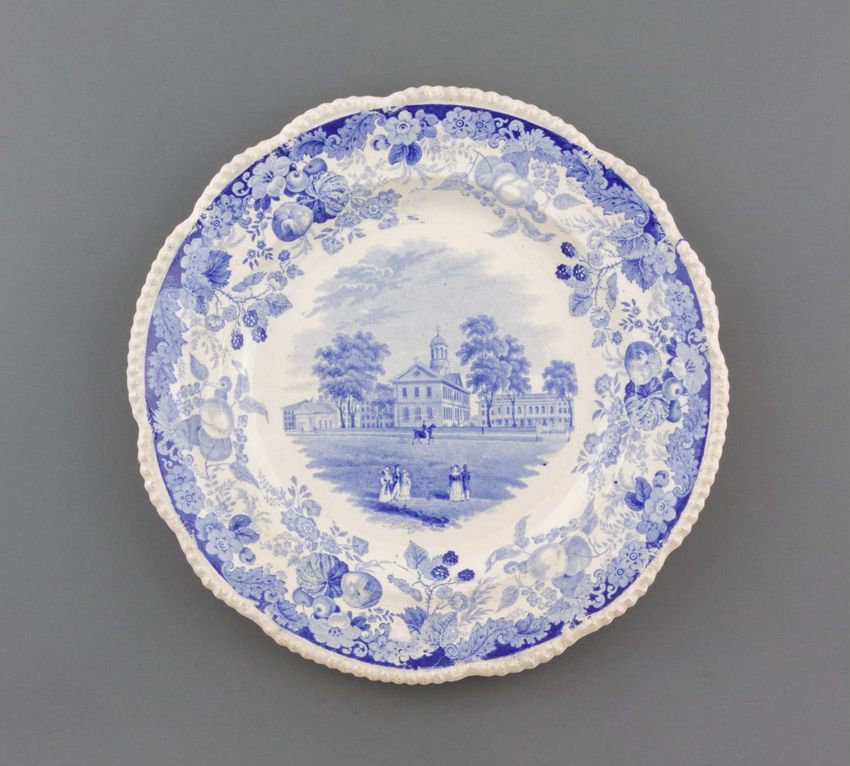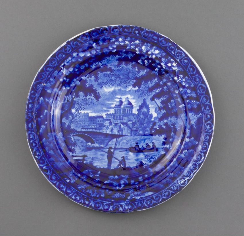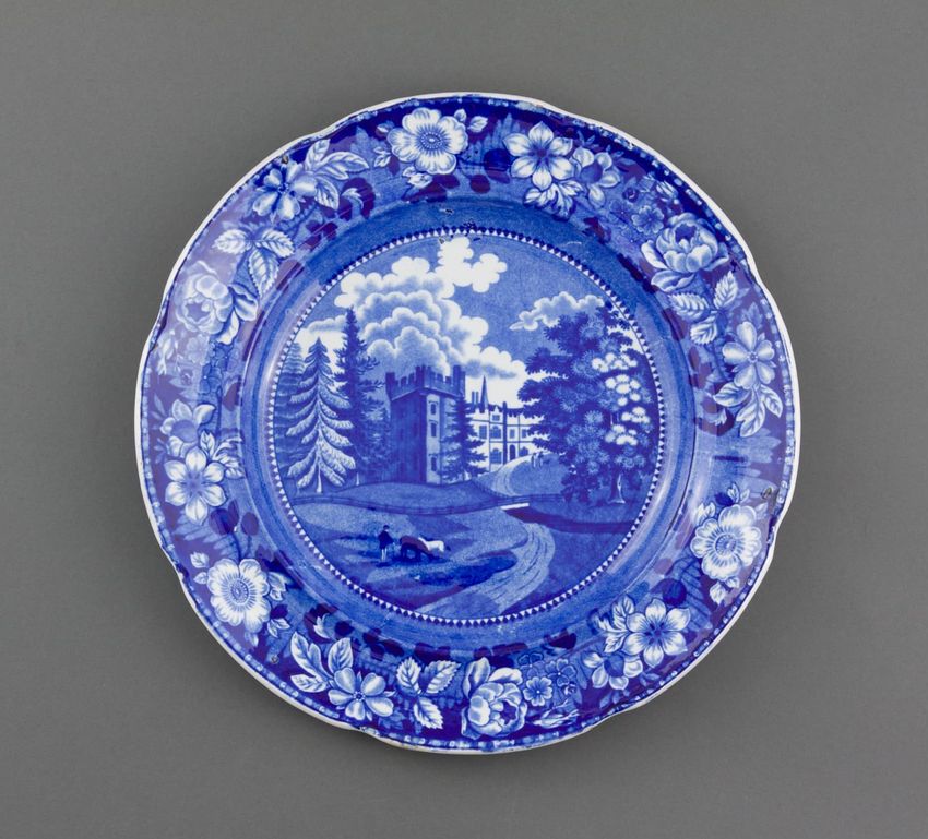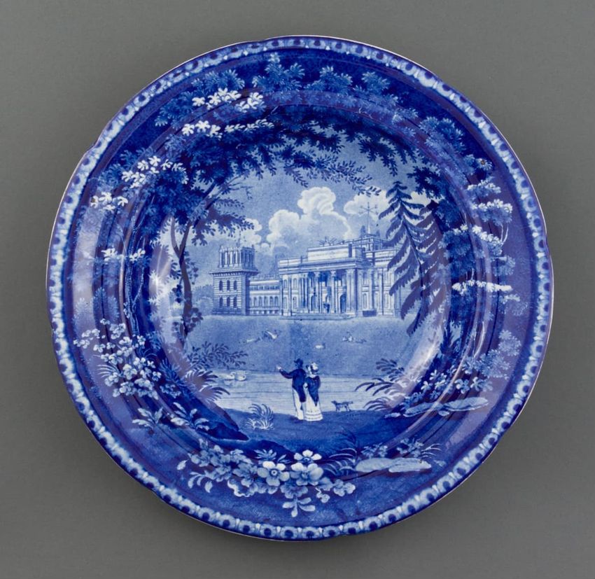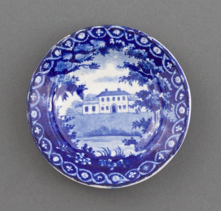 Blue transfer-printed pearlware dish with a molded bead edge. The interior has a floral, foliate, and scroll border that surrounds a central scene depicting Kingweston House. The exterior body is adorned by a floral, foliate, and scroll band.
