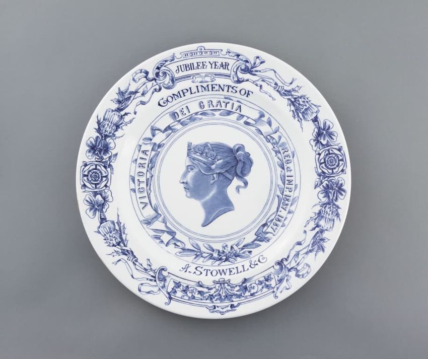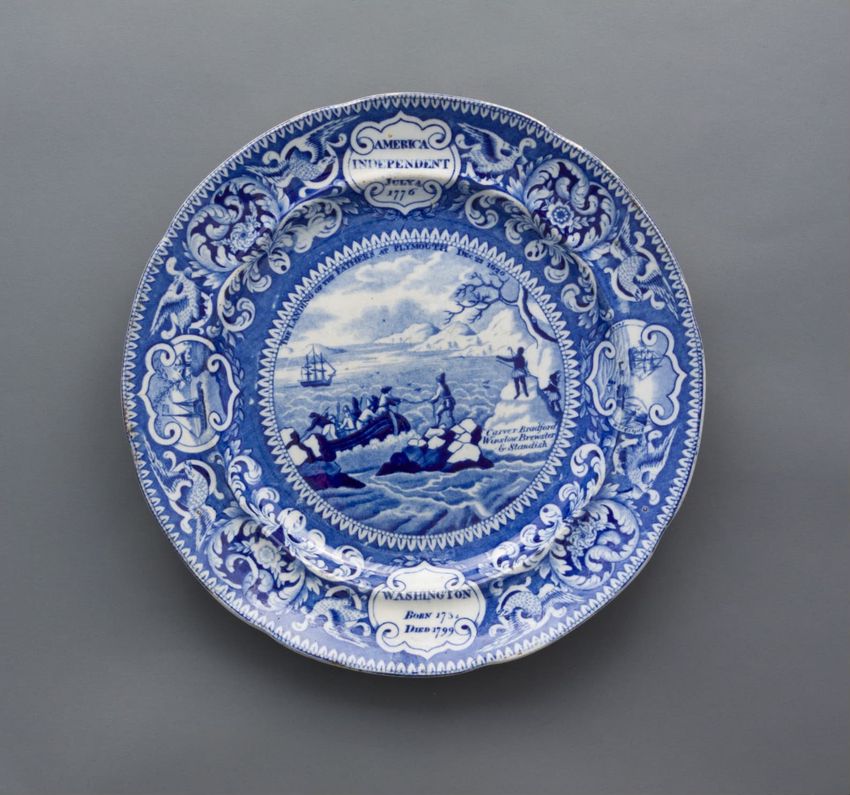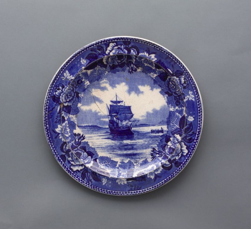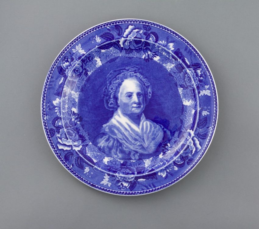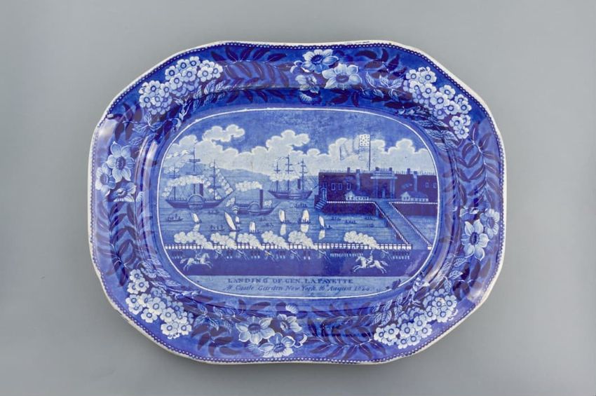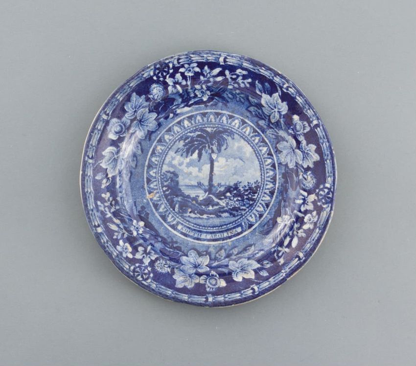 Blue transfer-printed pearlware dish with a molded bead edge. The interior has a floral, foliate, and scroll border that surrounds a central scene depicting Kingweston House. The exterior body is adorned by a floral, foliate, and scroll band.