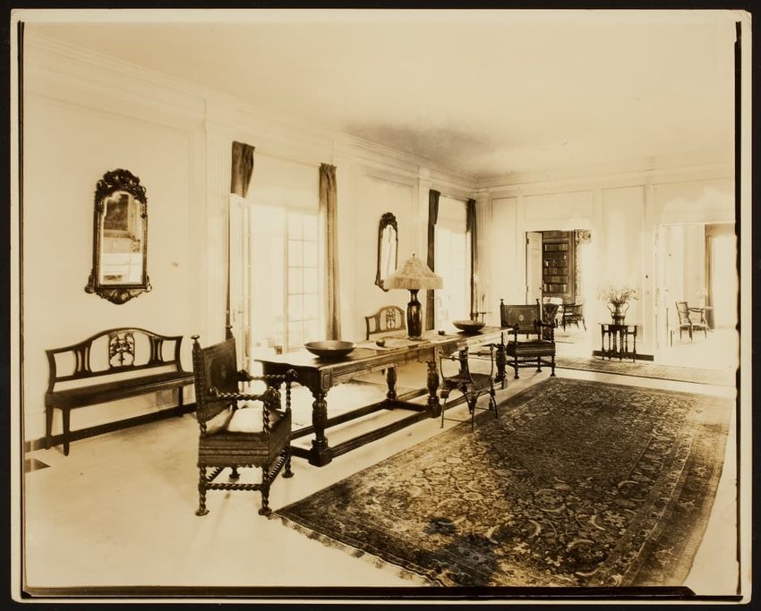 This interior view shows a room, possibly a living room, of the F. L. Higginson House in Wenham, Massachusetts. Chairs, tables, settees, and a large rug are arranged throughout the room.