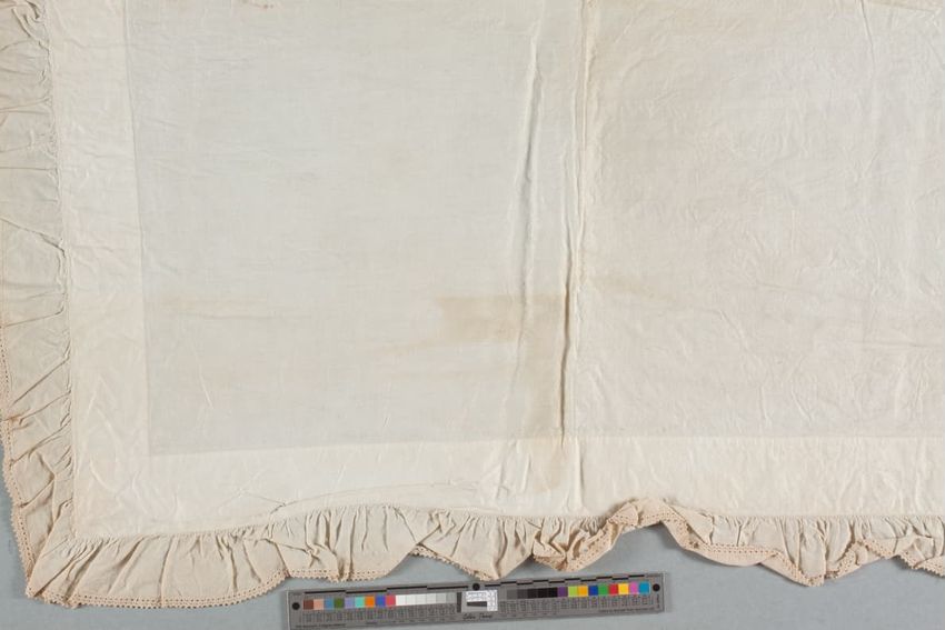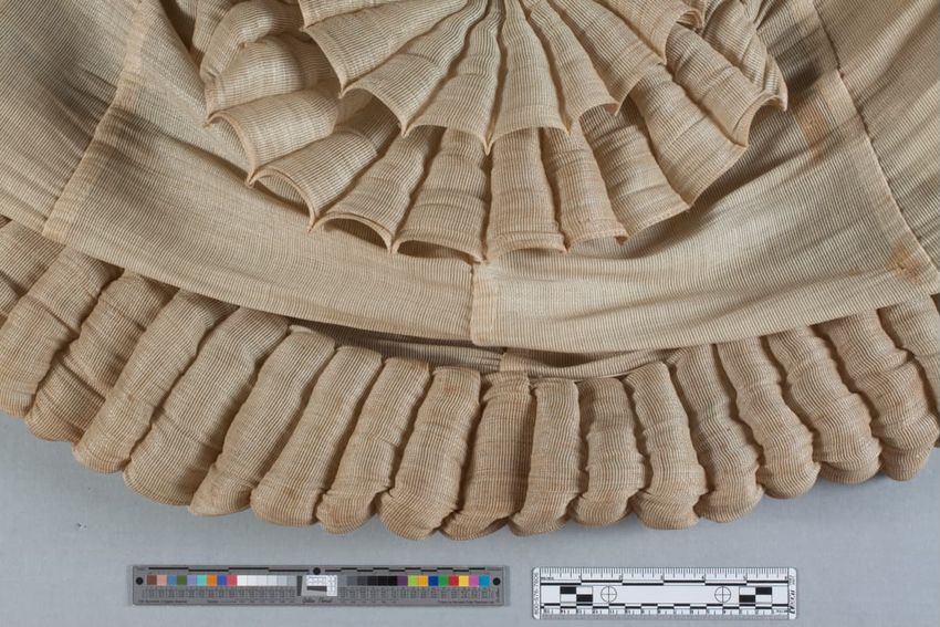 Sandalwood sticks and guards, densely carved with flowers and Oriental figures; wide, short paper leaf, hand-painted (probably gouache and watercolor), one side depicting the Emperor and his court, reverse the Empress and her court; faced of appliqued ivory, robes of appliqued silk; primarily blue, ...