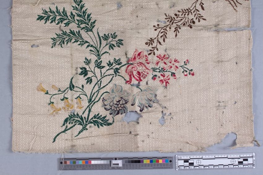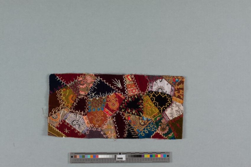 appliqué (technique), paint (coating), hand-painted, ivory (tooth component), paper (fiber product), sandalwood (wood), silk (textile)