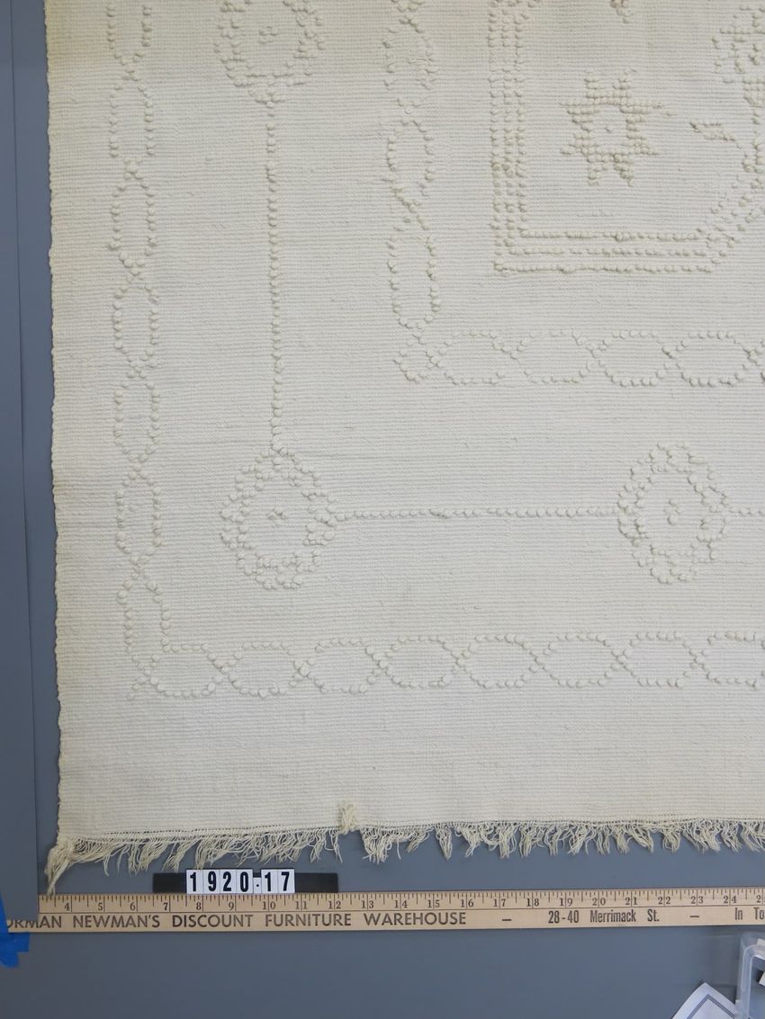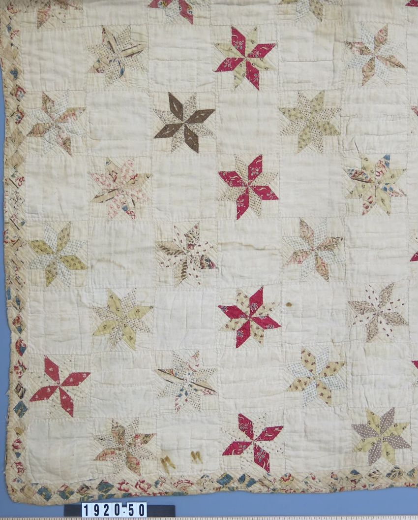 Quilt with fifteen rows of ten blocks. Each row of alternating plain white blocks, one with pieced eight point star of various printed cottons. Fill between points of dimity. Border of running diamonds of printed cottons, dimity fill.