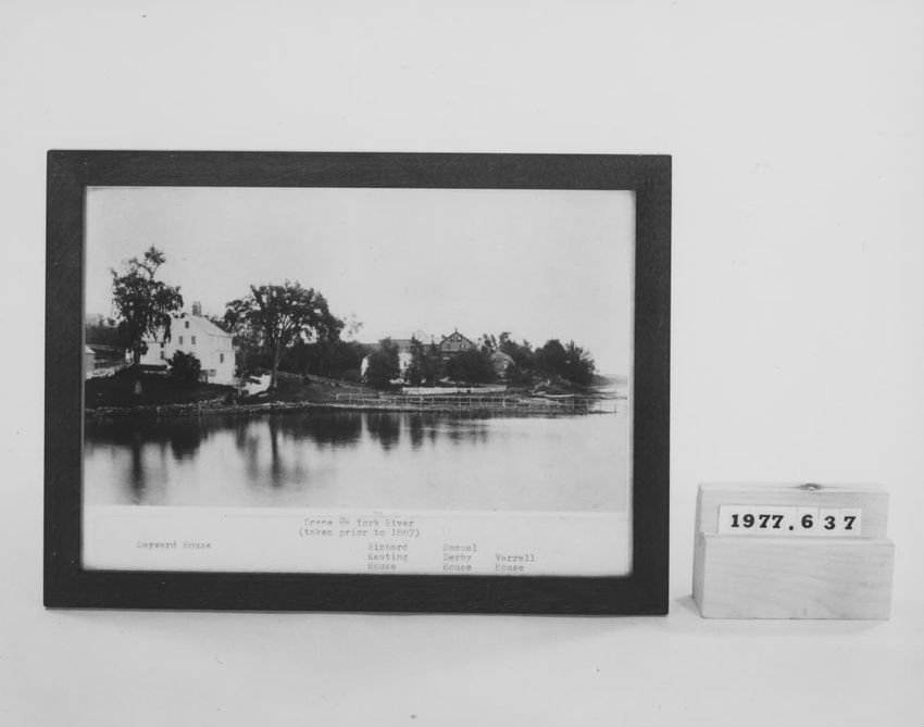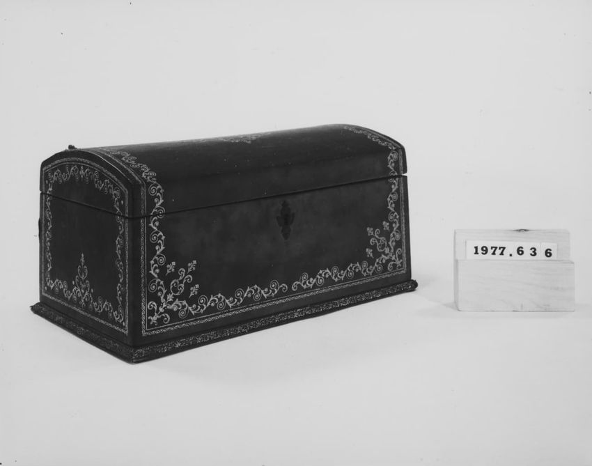 Squared mahogany veneered body with yellow painted diamond shaped escutcheon, fitted with a mirror in lid, shelf and pin cushion; interior lined with pink, orange and red paper; contains assorted sewing accessories, needles in packages, thread, pins, thimbles, beeswax, fasteners; also contains thimb...