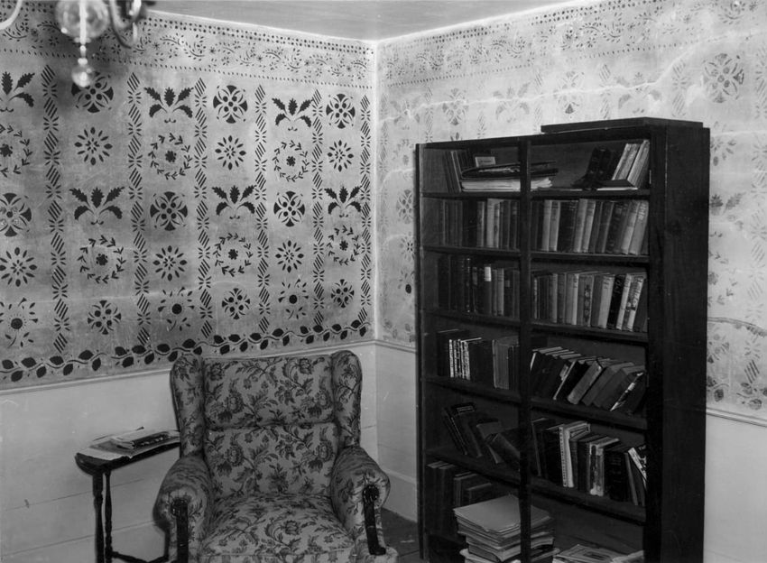 Interior photograph of a room with stenciled walls in the Mrs. Jay Hilton House, South Merrimac, N.H..