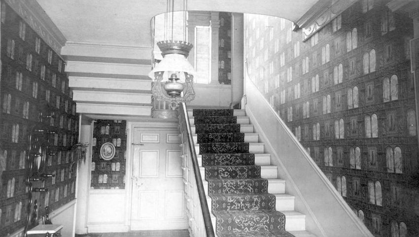 Interior photograph of the front stairwell in the J.H. Morison House, "Bleakresidence," Peterborough, N.H..
