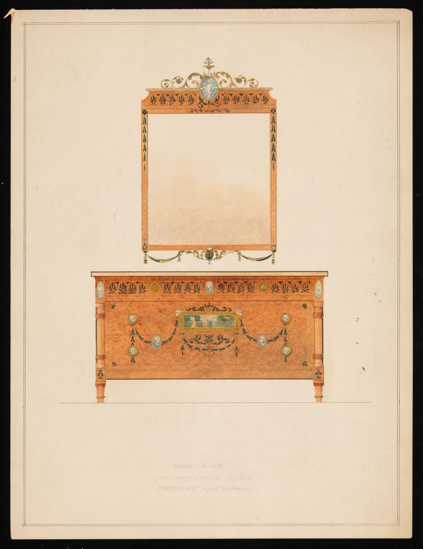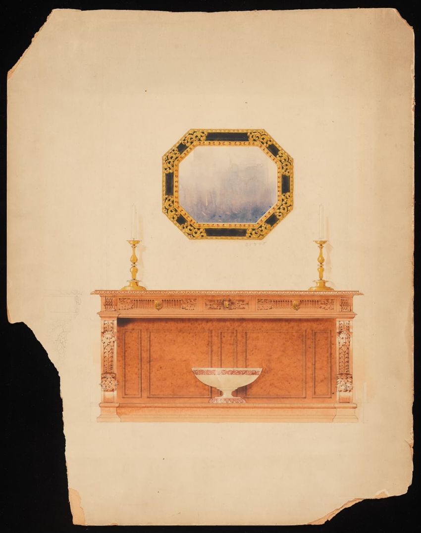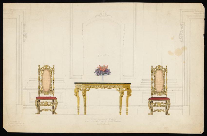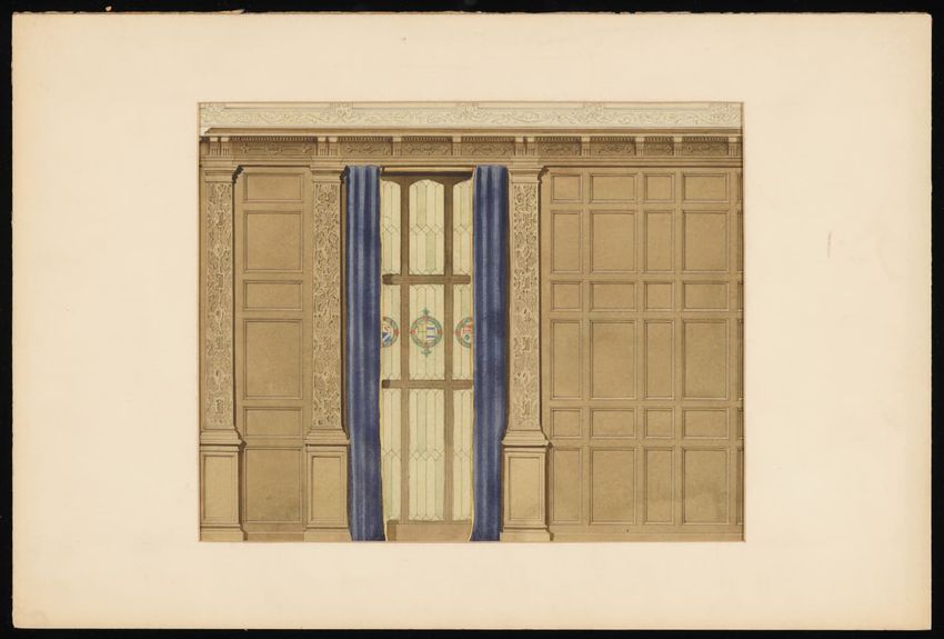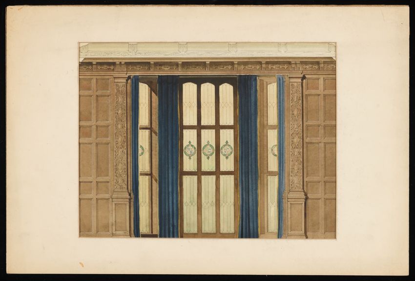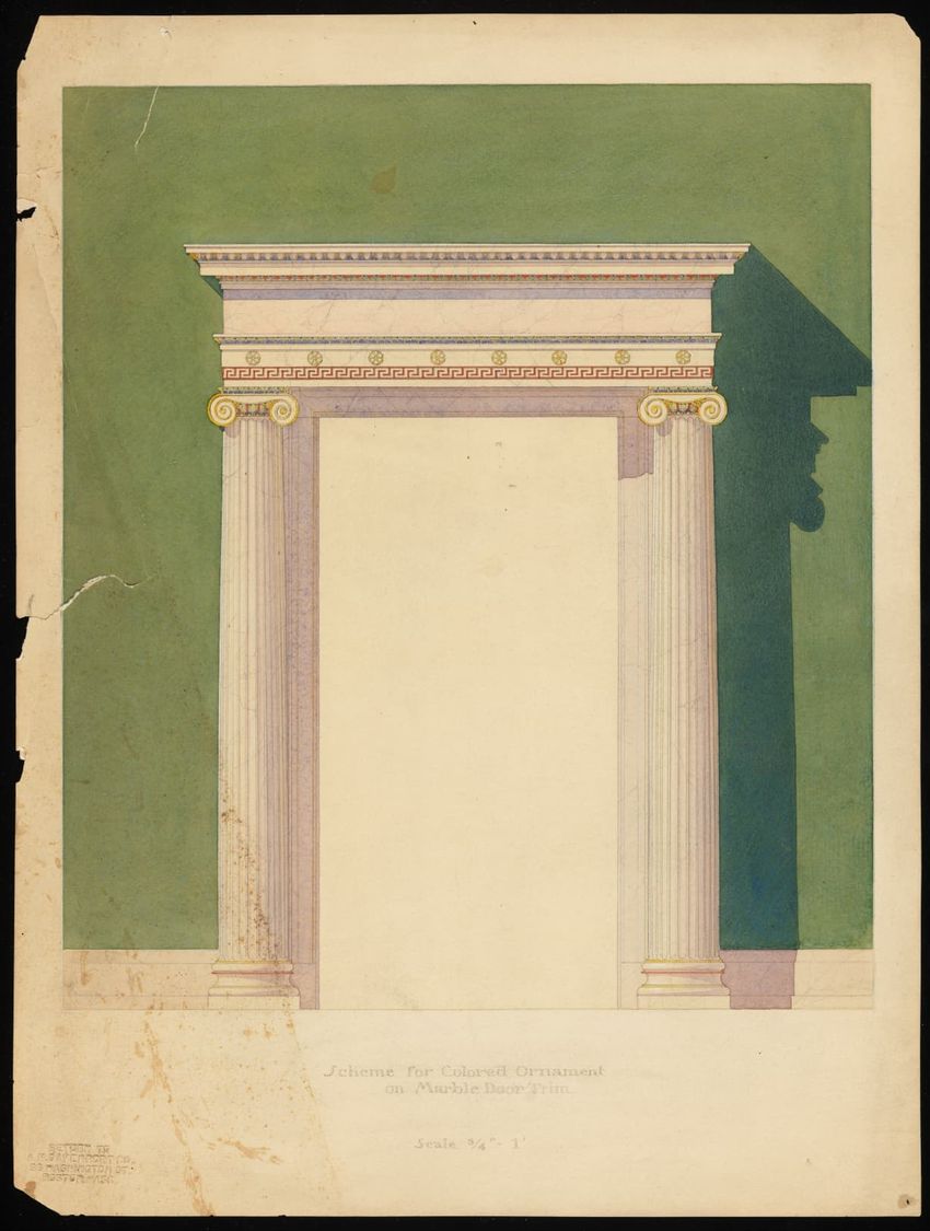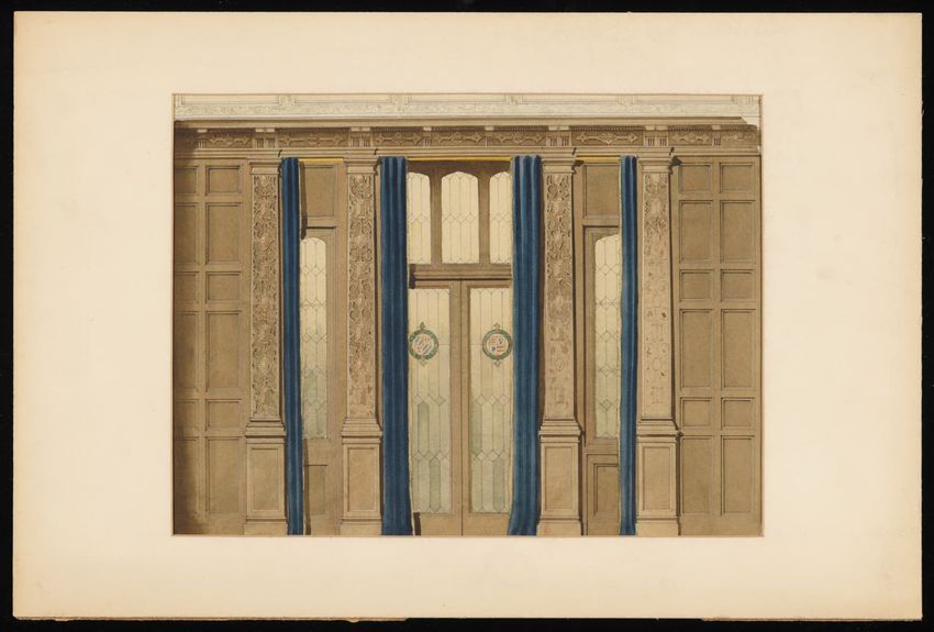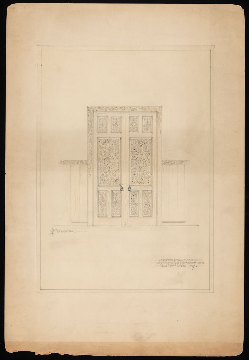 Untitled design drawing rendered in pencil on trace. Front elevation is shown. Drawing depicts an interior door frame, double doors and a portion of the adjacent chair rail. Door frame and chair rail have densely carved garlands and foliage. Each door has a top tier of two small vertical rectangular...