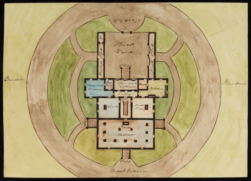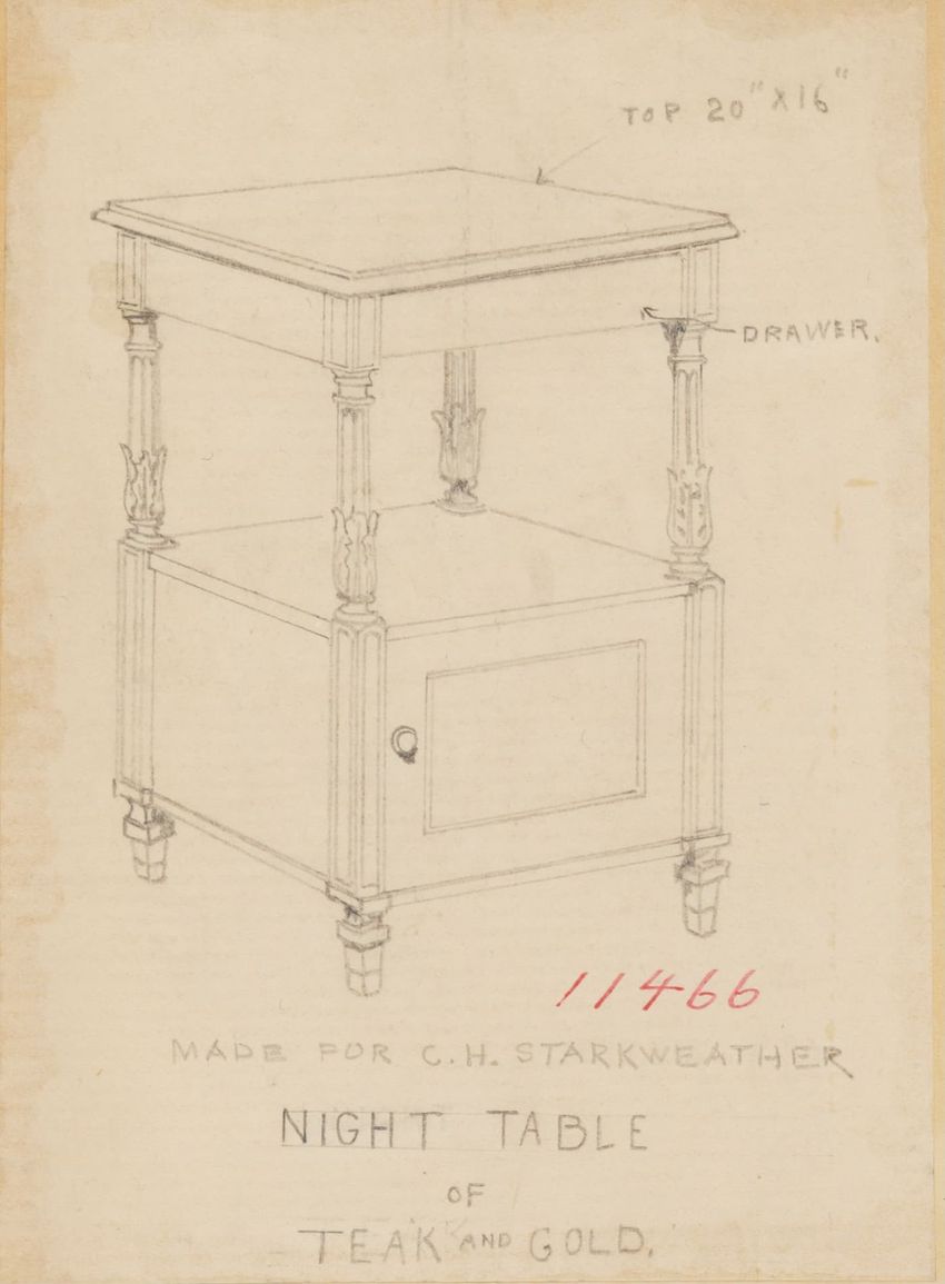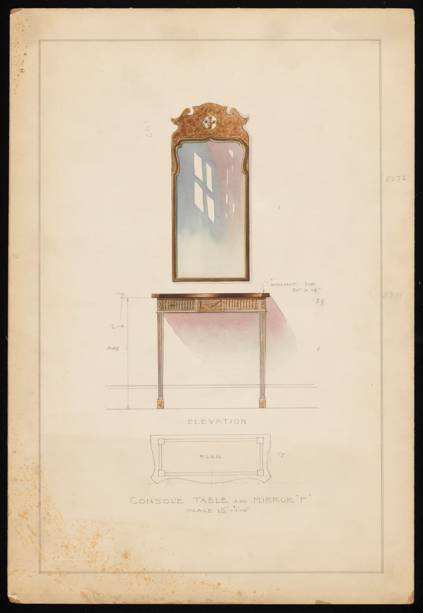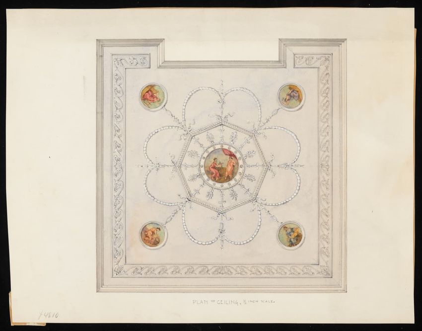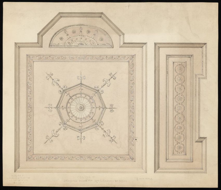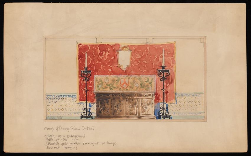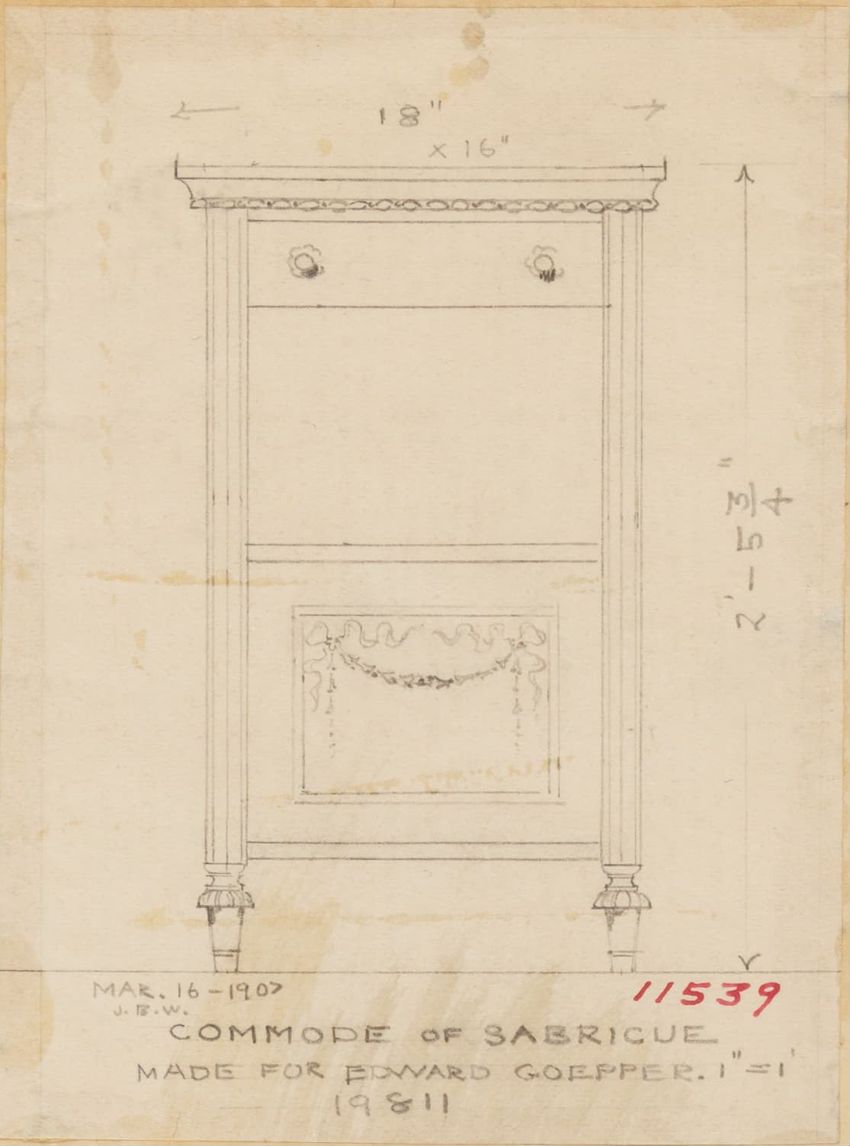Untitled design drawing rendered in pencil on trace. Front elevation is shown. Drawing depicts an interior door frame, double doors and a portion of the adjacent chair rail. Door frame and chair rail have densely carved garlands and foliage. Each door has a top tier of two small vertical rectangular...