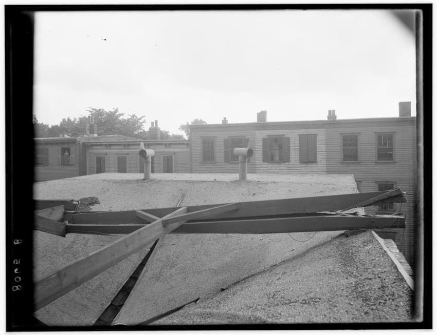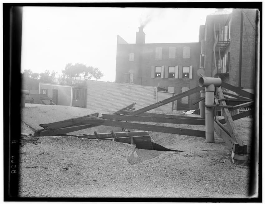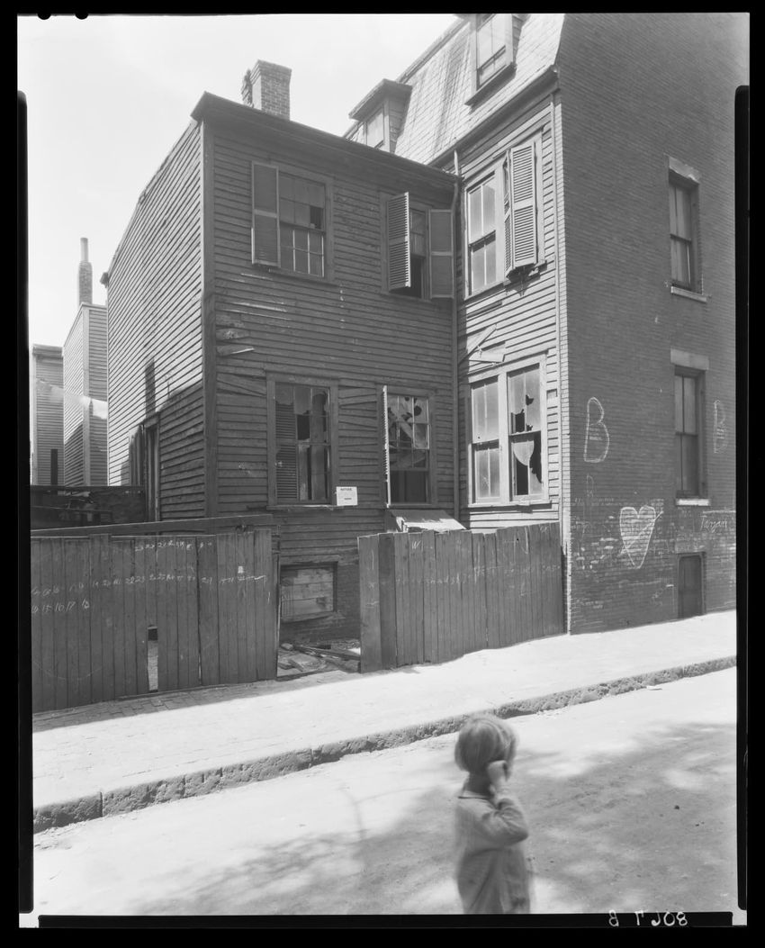 The image depicts the exterior of stores located at 7-15 Eustis Street in Roxbury, Boston, Massachusetts. A street runs past the wooden buildings, with signs mentioning "Iron, Metals, Machinery, Boilers, Motor" visible. An early automobile and a streetcar on tracks are present on the right side. A f...