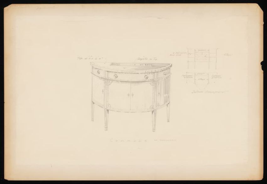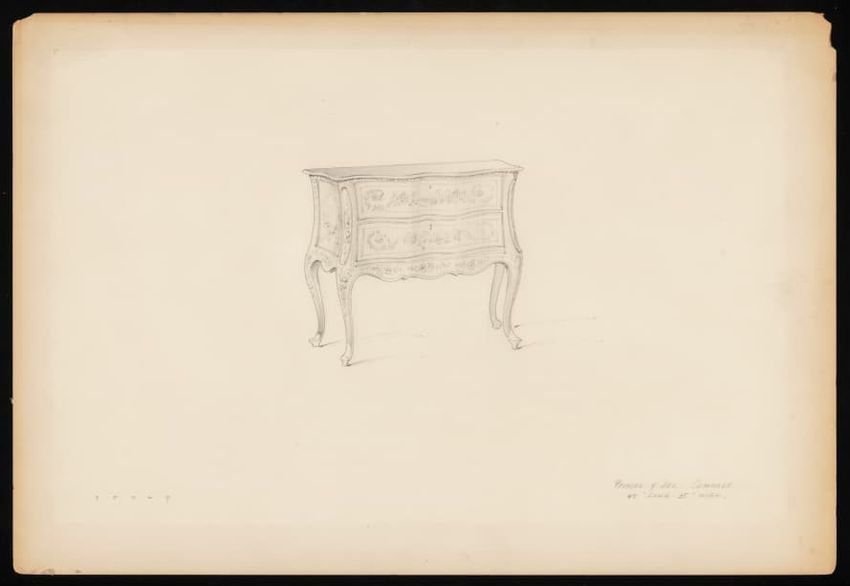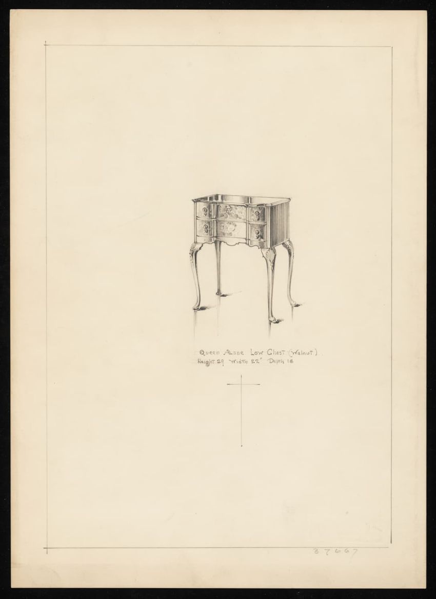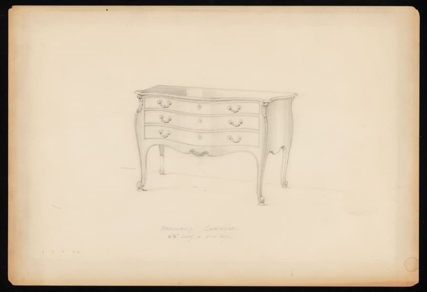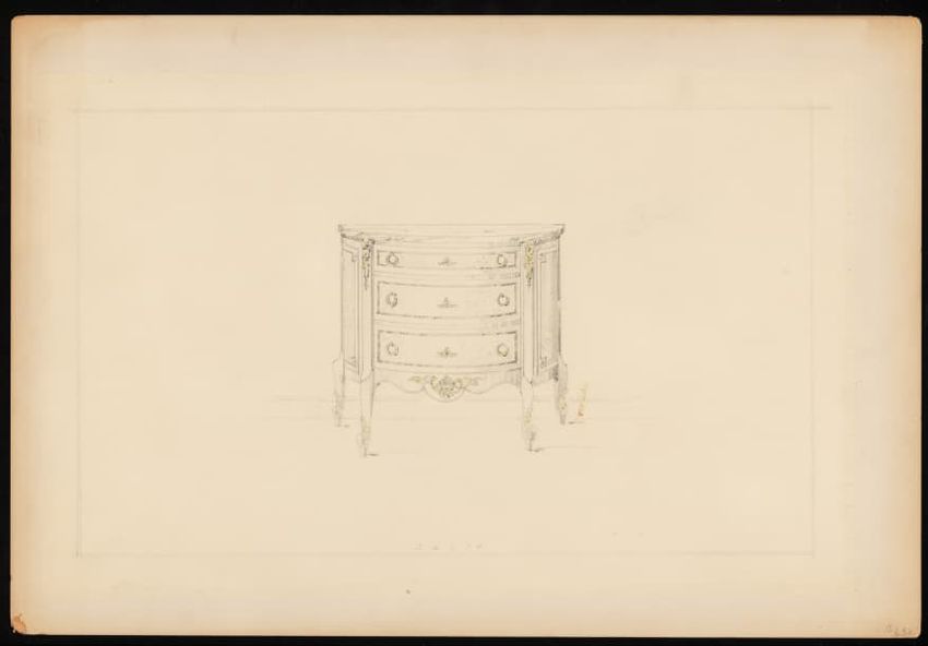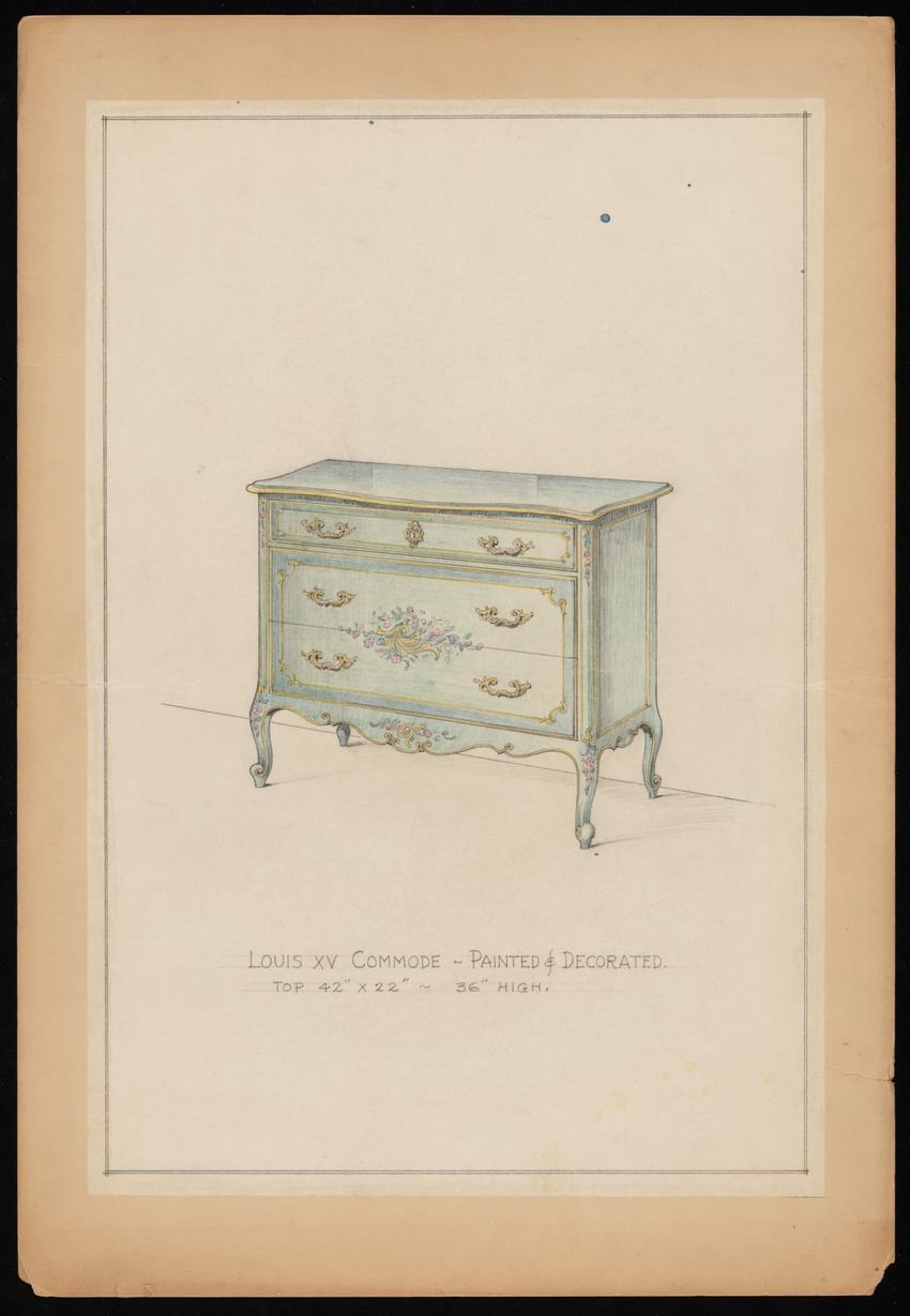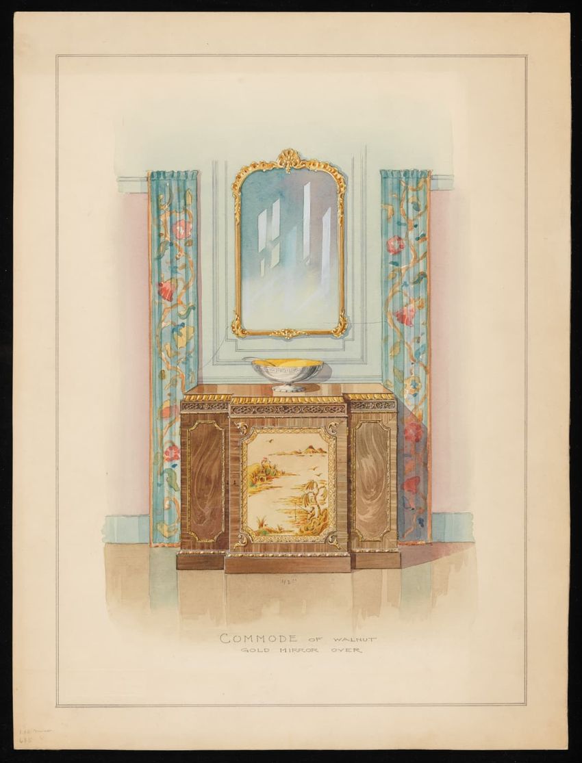 Design drawing titled "Kidney Desk" rendered in watercolor and pencil on board. Perspective view is shown. Double pedestal kidney-shaped desk has overhanging top with molded edge; one tier of three shallow drawers; two supporting pedestals with three drawers each; bail handles on all drawers; and ba...