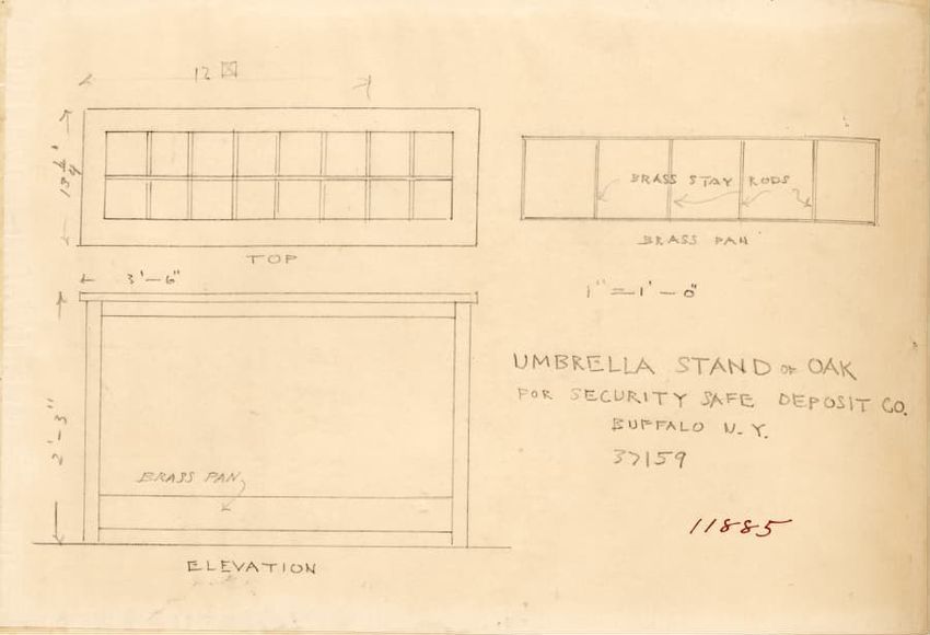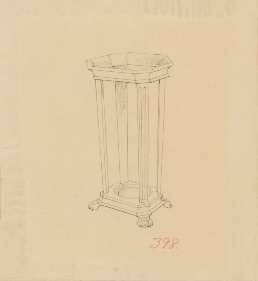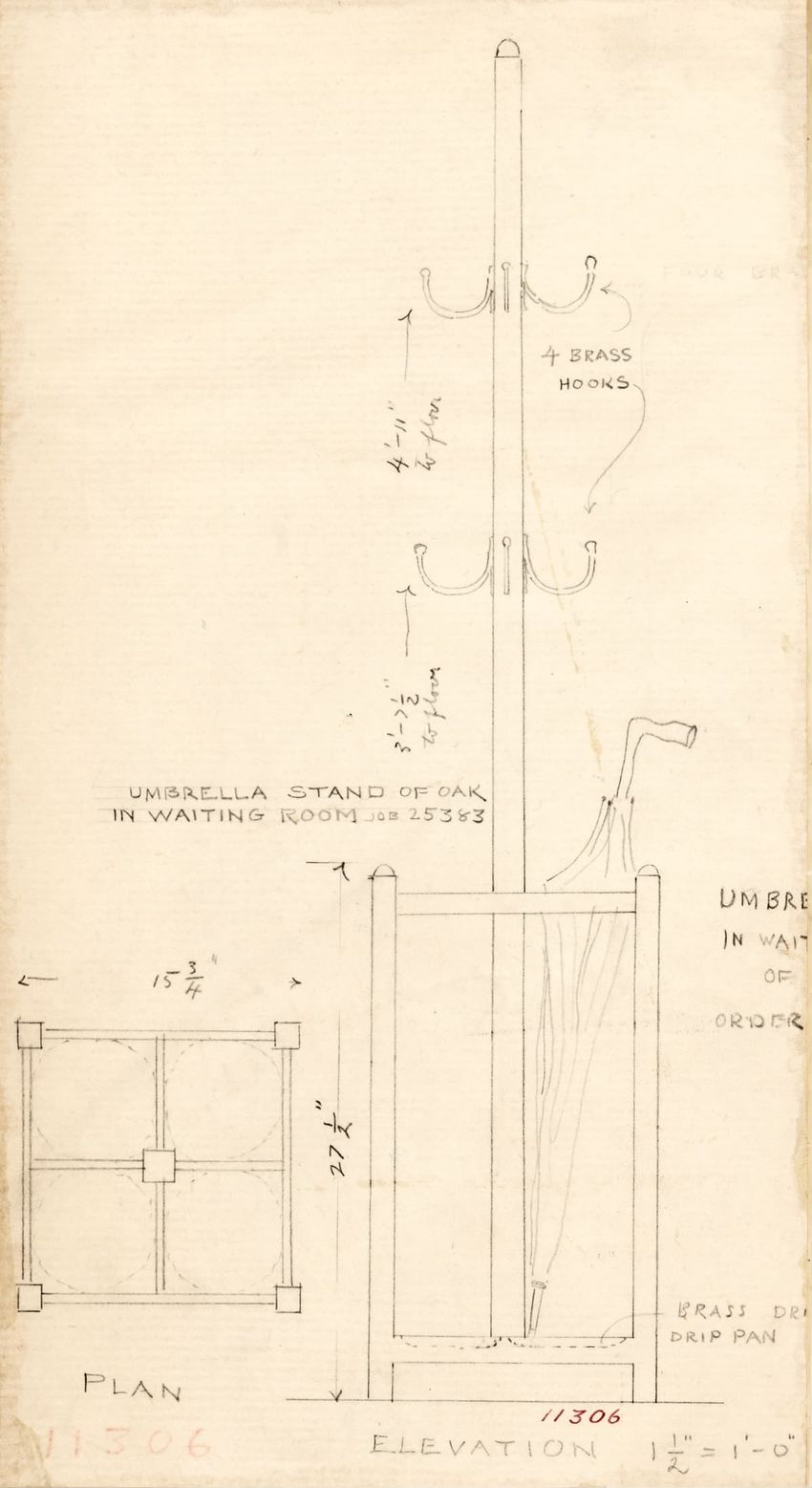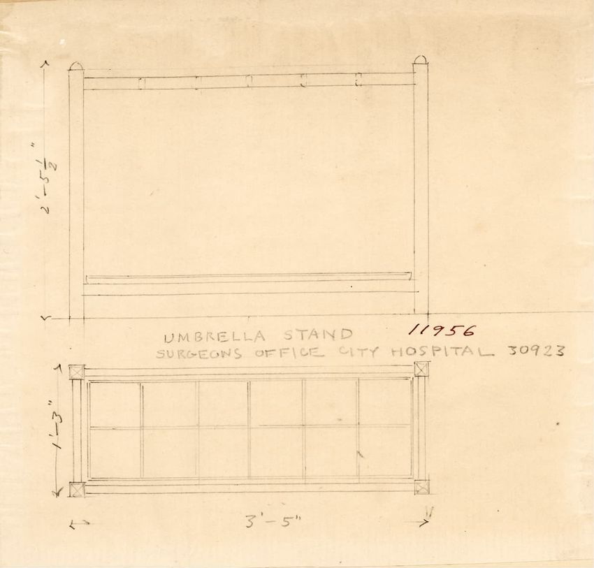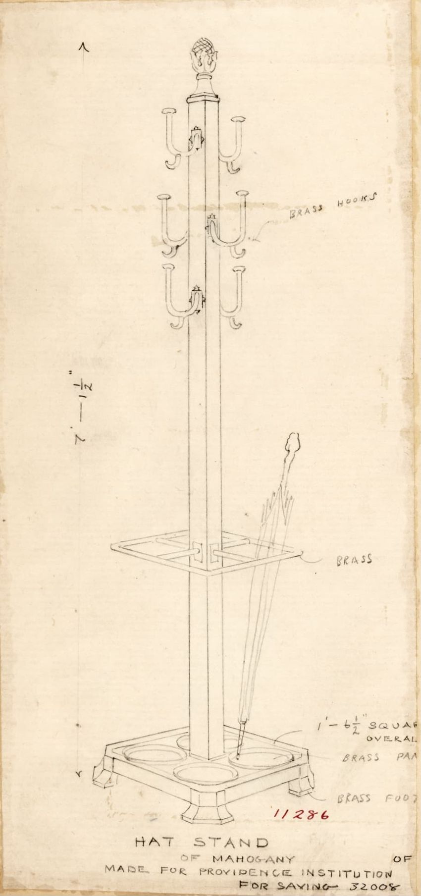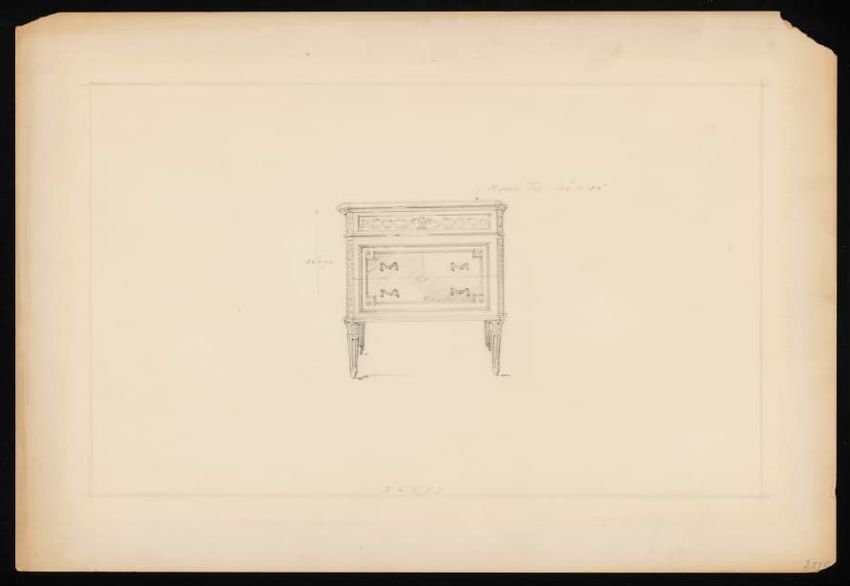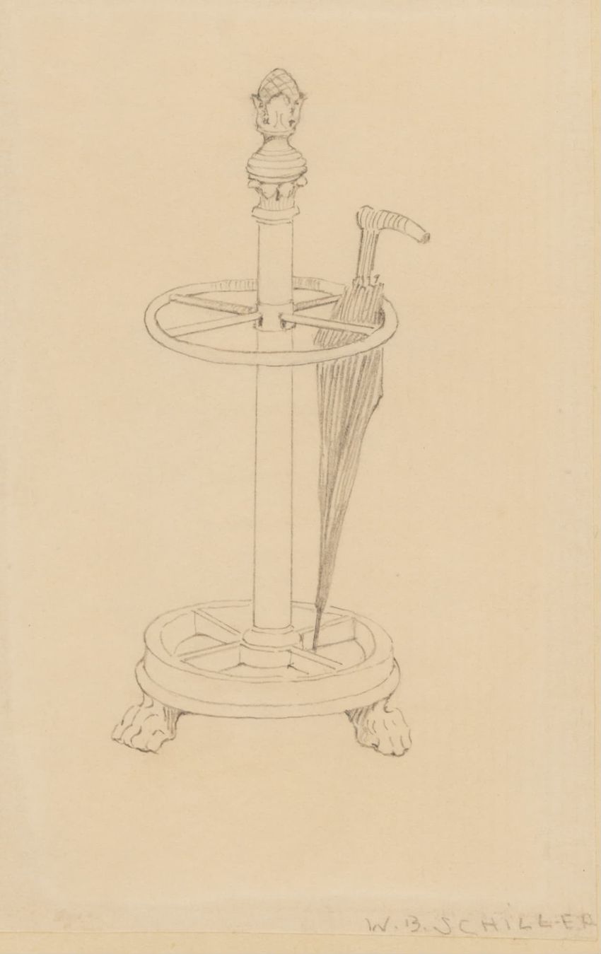 Design drawing titled "Kidney Desk" rendered in watercolor and pencil on board. Perspective view is shown. Double pedestal kidney-shaped desk has overhanging top with molded edge; one tier of three shallow drawers; two supporting pedestals with three drawers each; bail handles on all drawers; and ba...