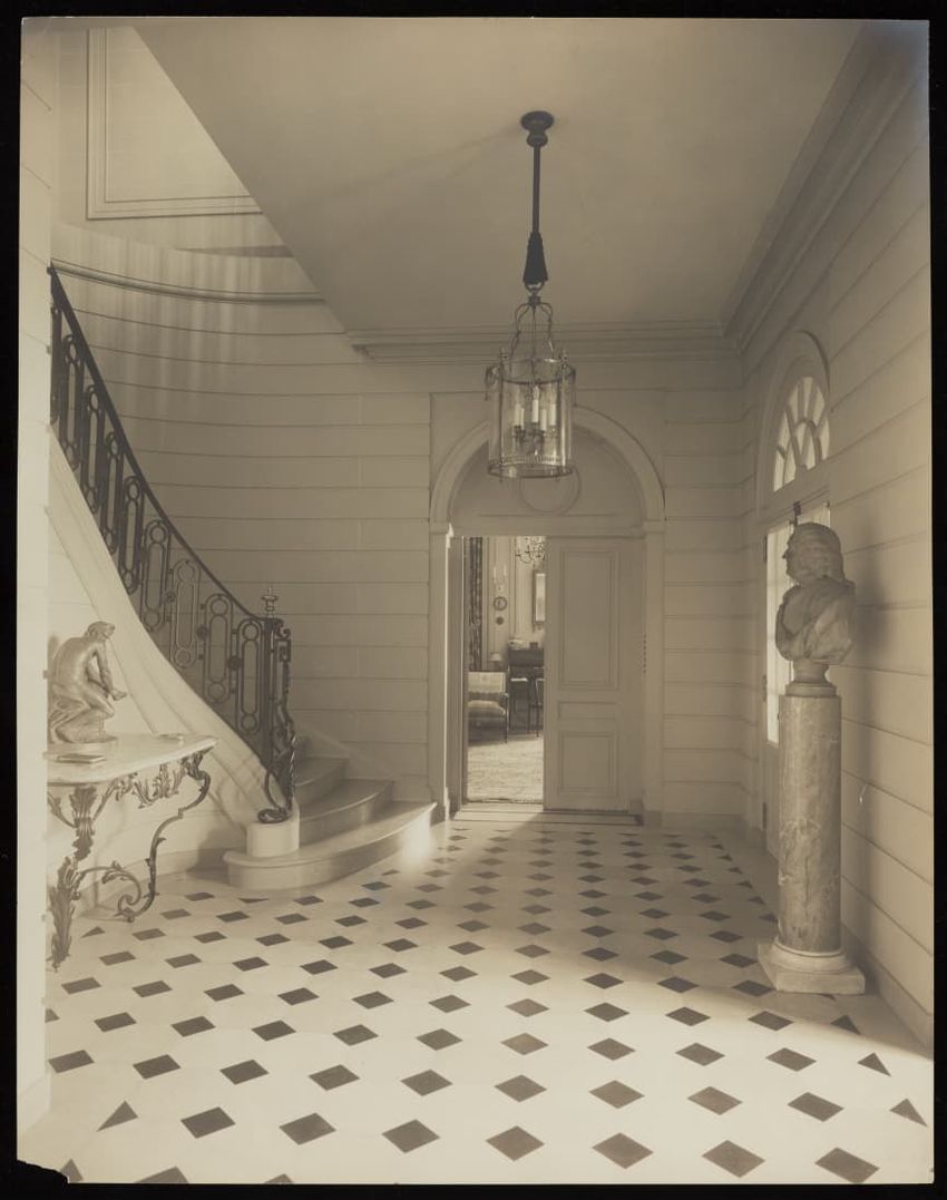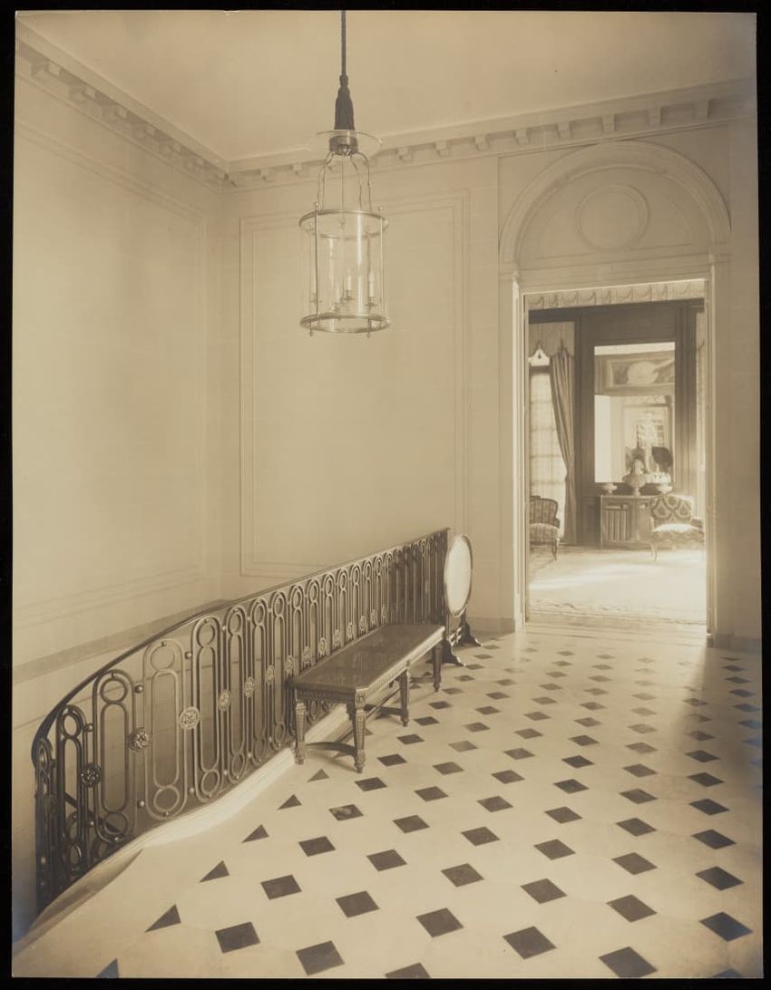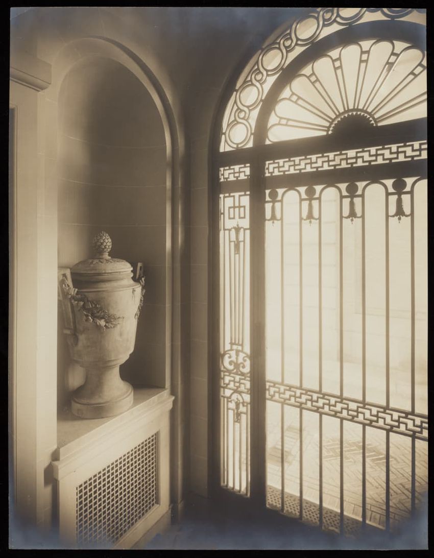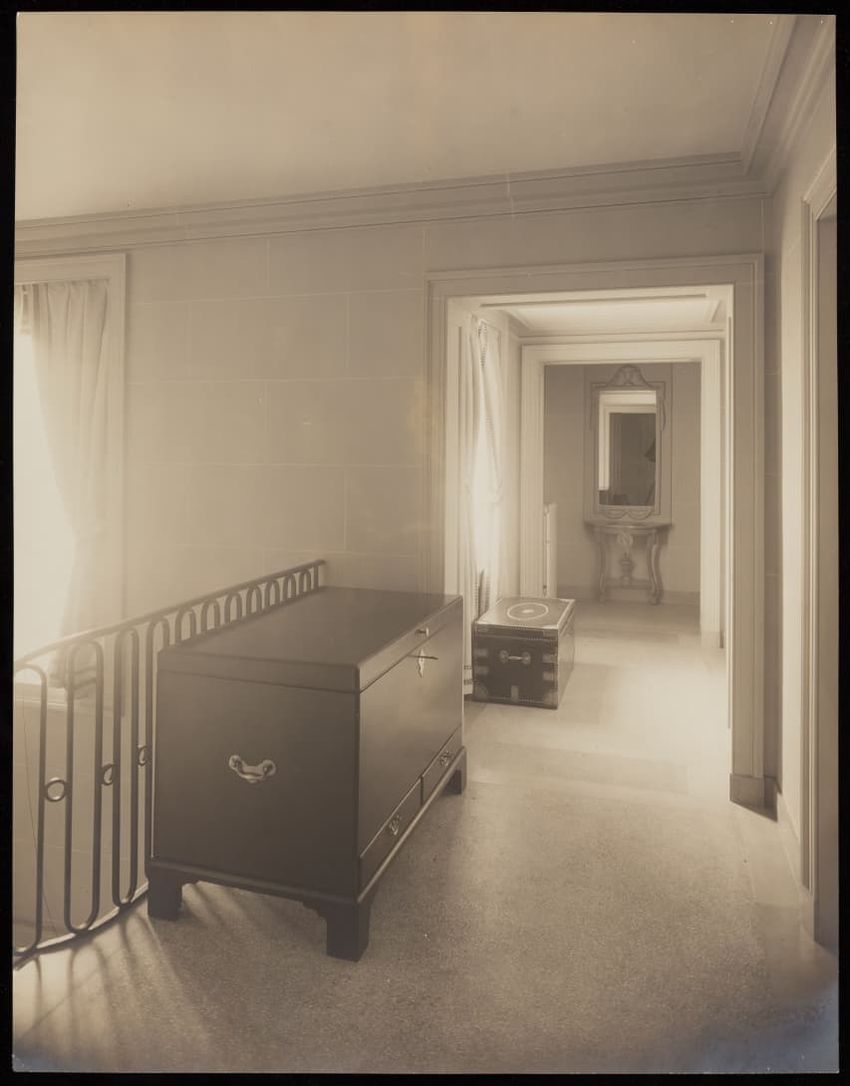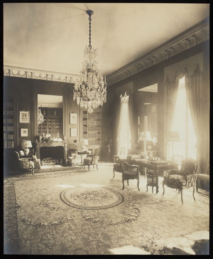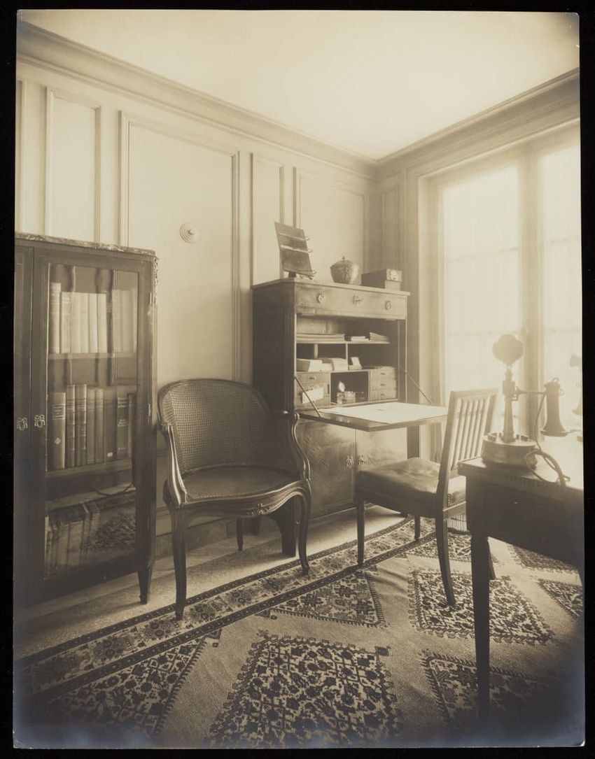 Design drawing titled "Kidney Desk" rendered in watercolor and pencil on board. Perspective view is shown. Double pedestal kidney-shaped desk has overhanging top with molded edge; one tier of three shallow drawers; two supporting pedestals with three drawers each; bail handles on all drawers; and ba...