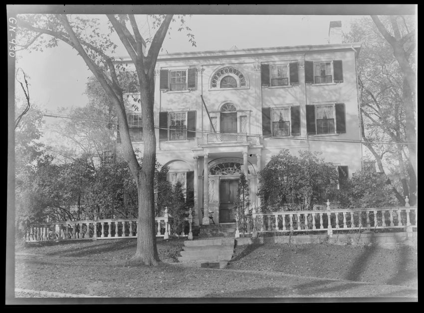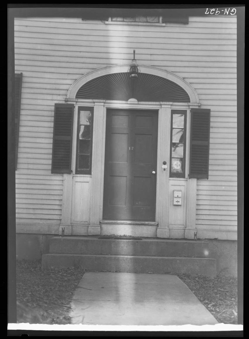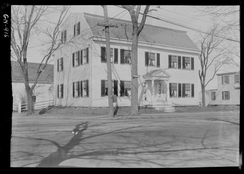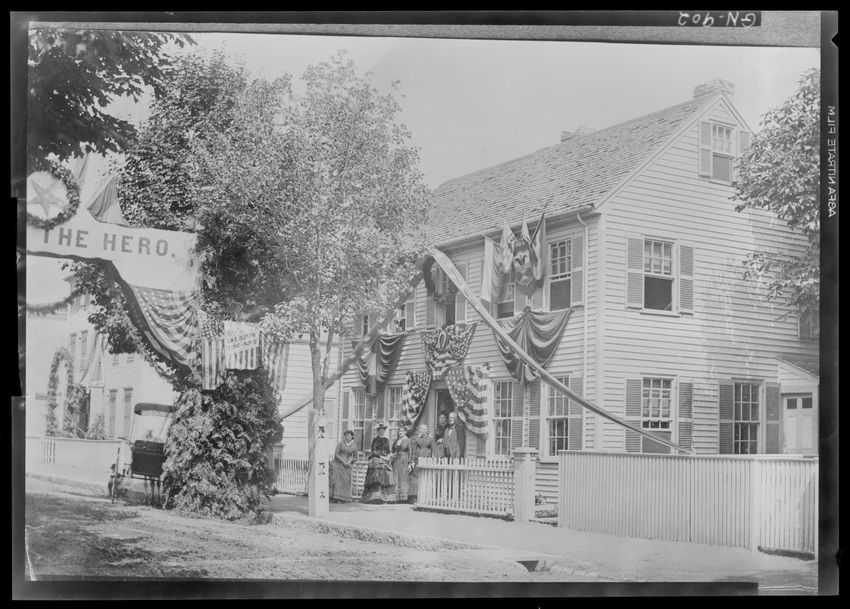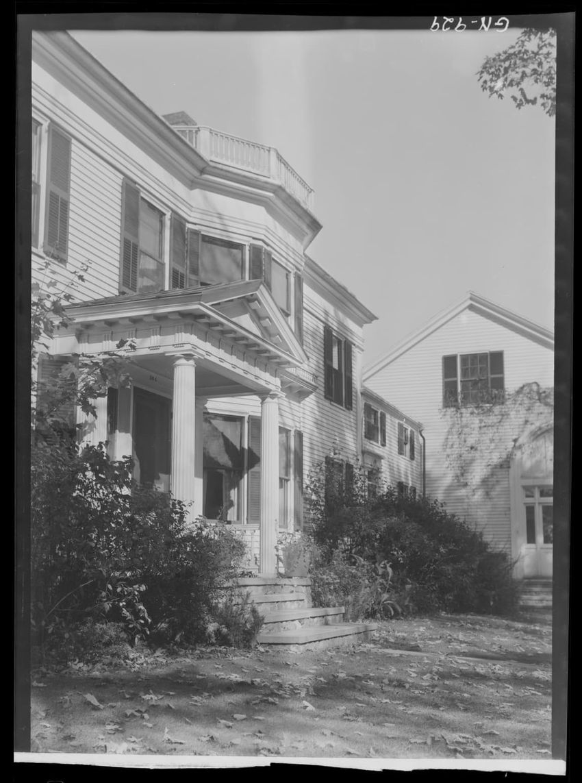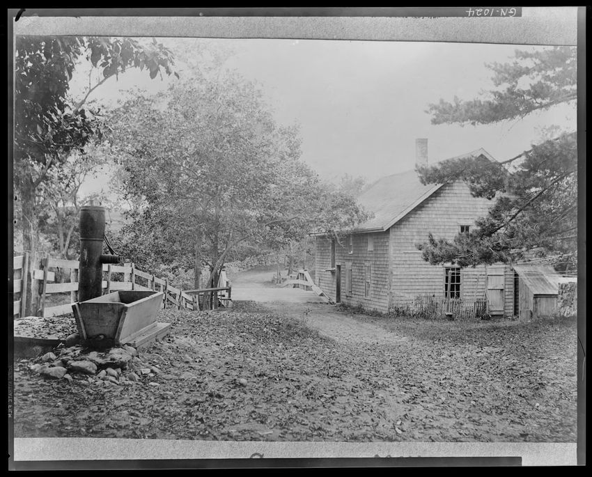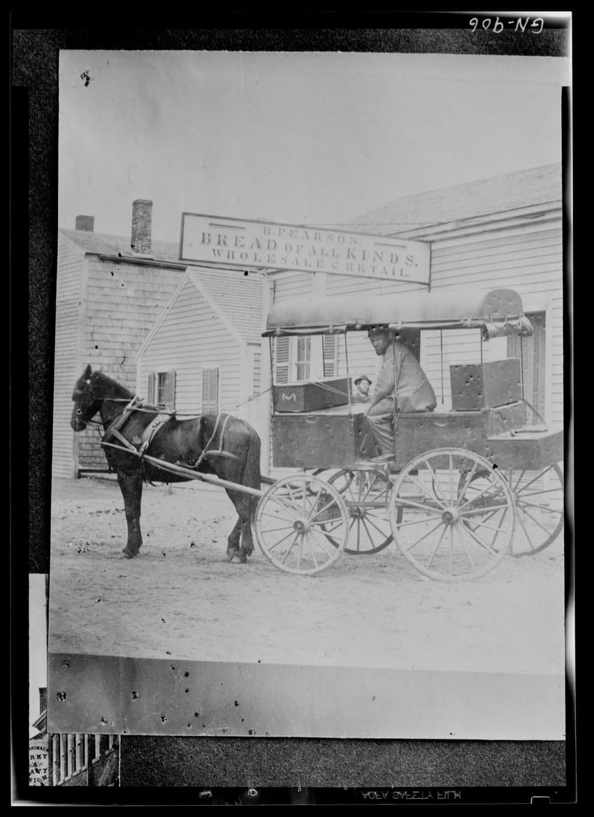 The image shows a horse-drawn bakery cart with signage for "H. Pearson, Bread of All Kinds, Wholesale & Retail." A man is seated on the driver's bench of the cart, which is stopped in front of a clapboard building. There is another person visible behind him. The cart has large wheels and is covered ...