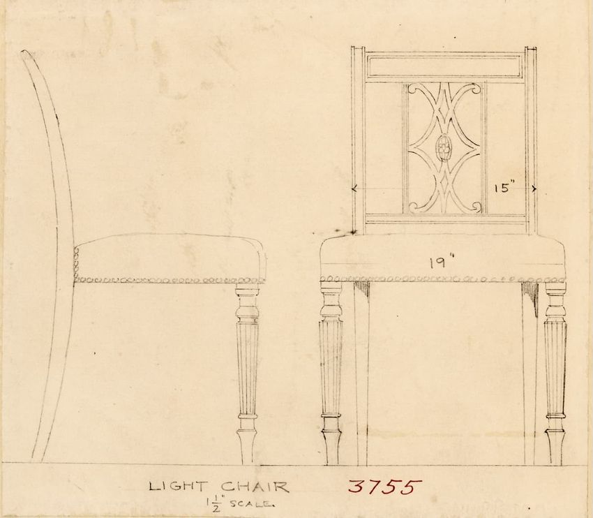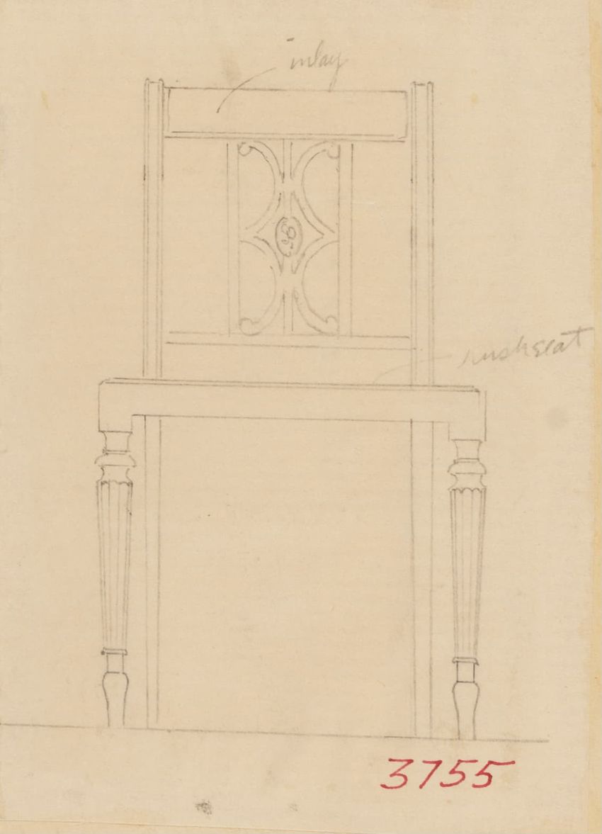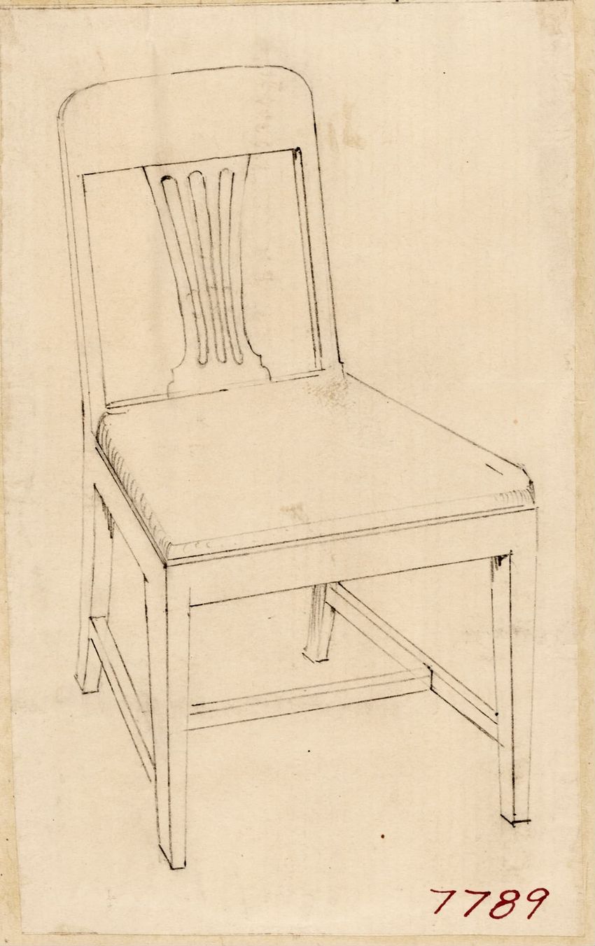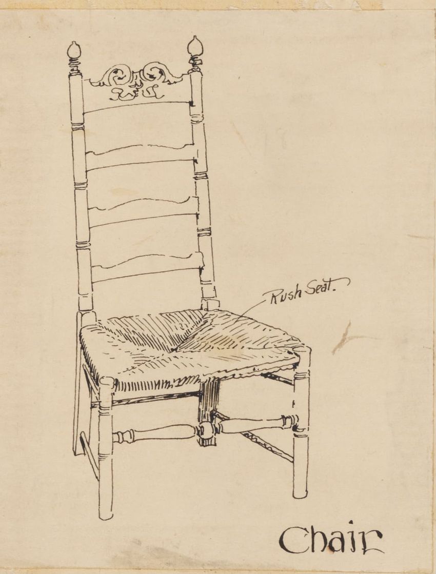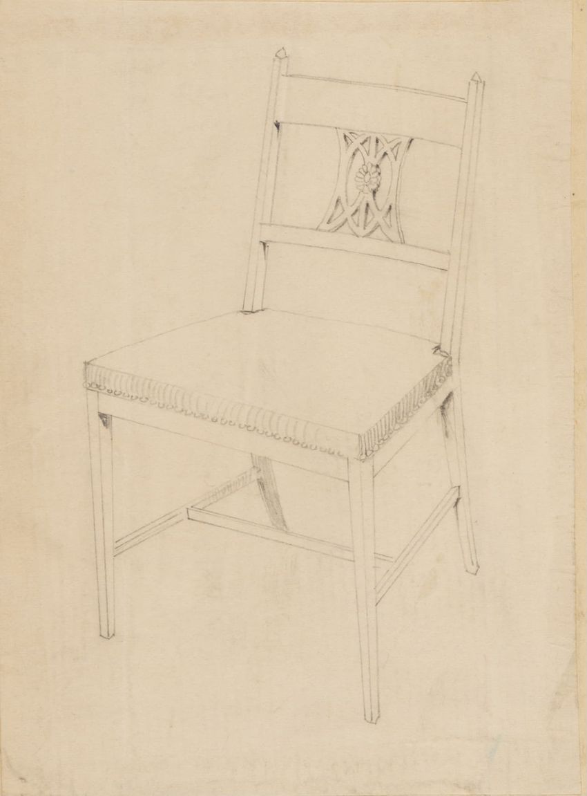 Design drawing titled "Chair" rendered in pencil on trace. Perspective view is shown. Side chair has back withshaped arched crest rail, five vasiform turned spindles, and straight lower rail; stiles with block, ring and vasiform turnings and ball finials; rush seat; legs with block, ring and vasifor...