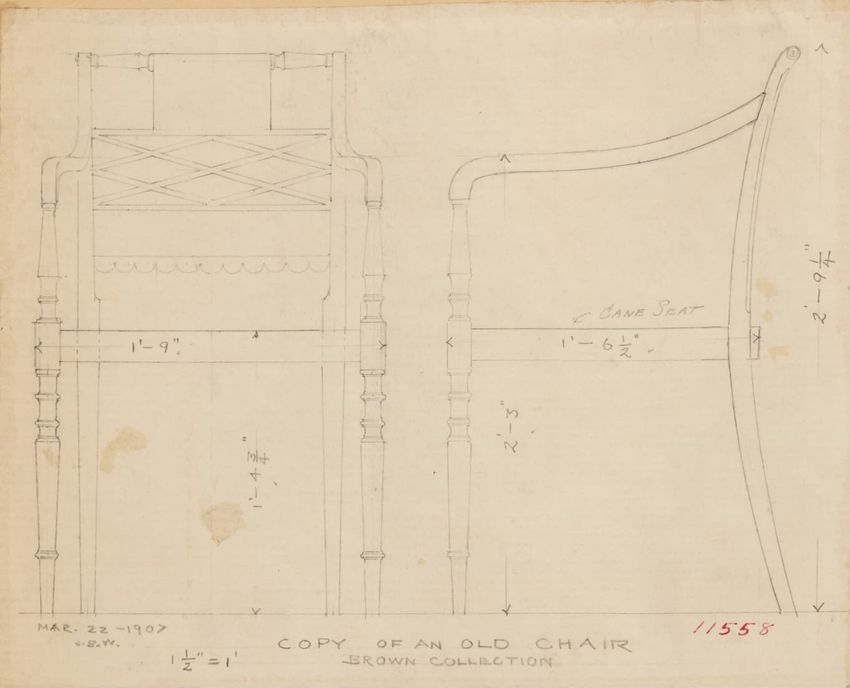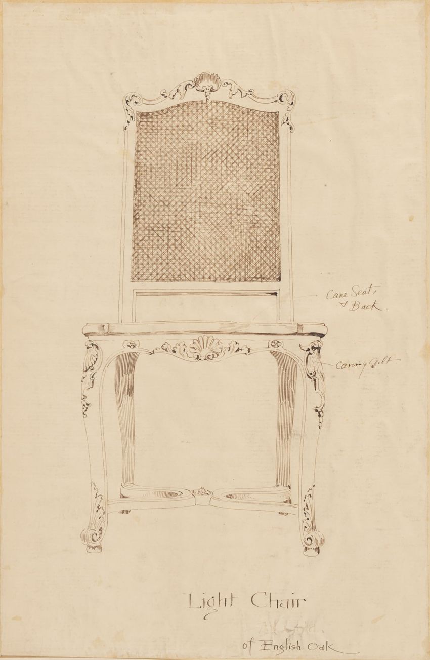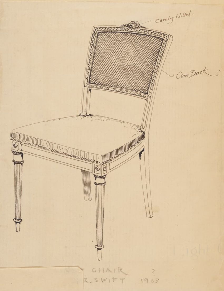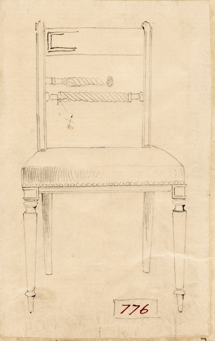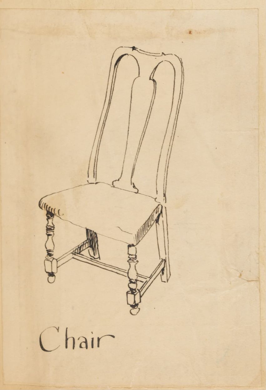 Design drawing titled "Chair" rendered in pencil on trace. Perspective view is shown. Side chair has back withshaped arched crest rail, five vasiform turned spindles, and straight lower rail; stiles with block, ring and vasiform turnings and ball finials; rush seat; legs with block, ring and vasifor...