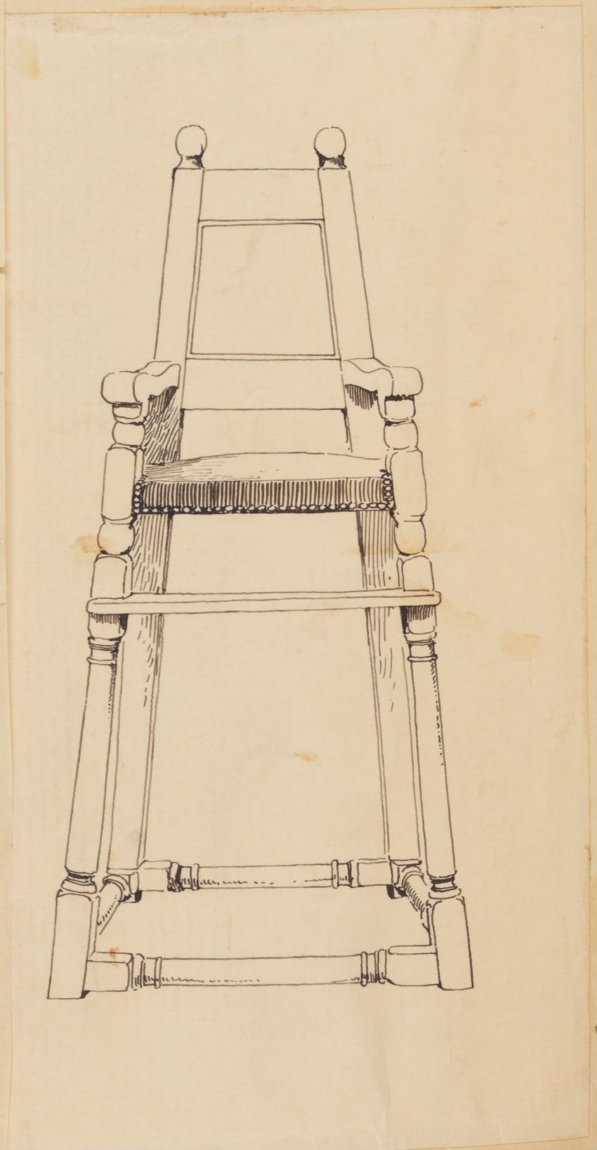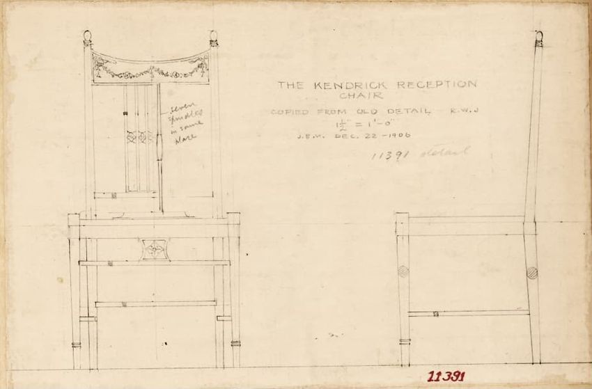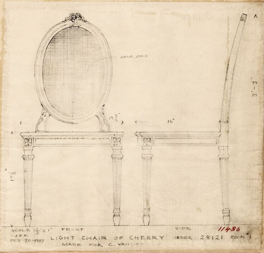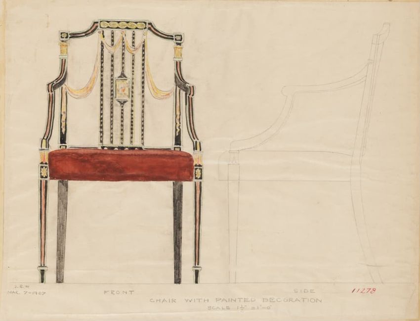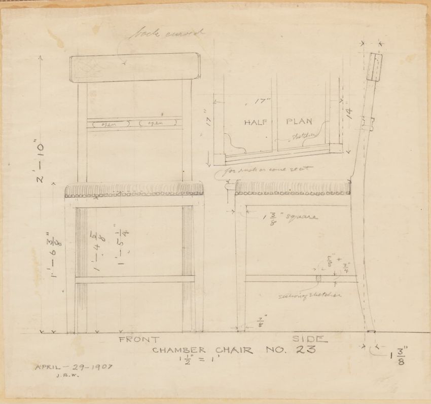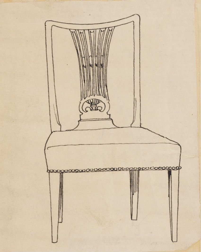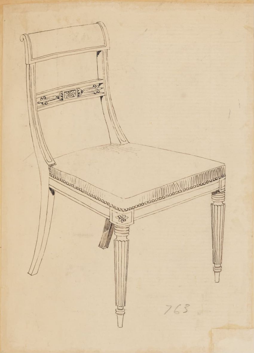 Design drawing titled "Chair" rendered in pencil on trace. Perspective view is shown. Side chair has back withshaped arched crest rail, five vasiform turned spindles, and straight lower rail; stiles with block, ring and vasiform turnings and ball finials; rush seat; legs with block, ring and vasifor...