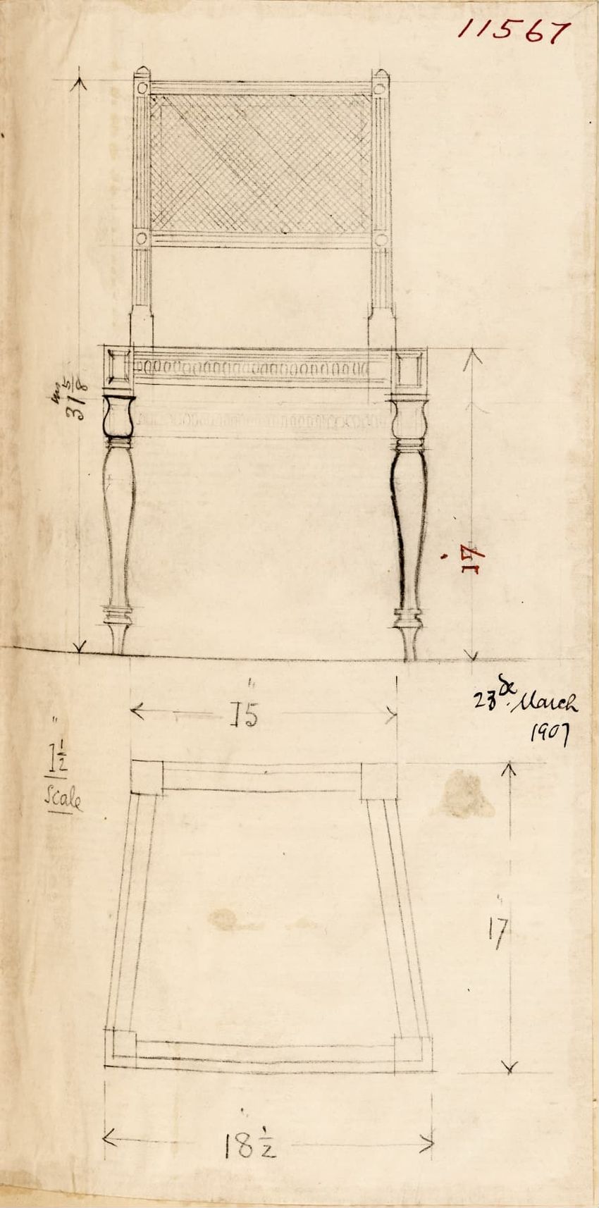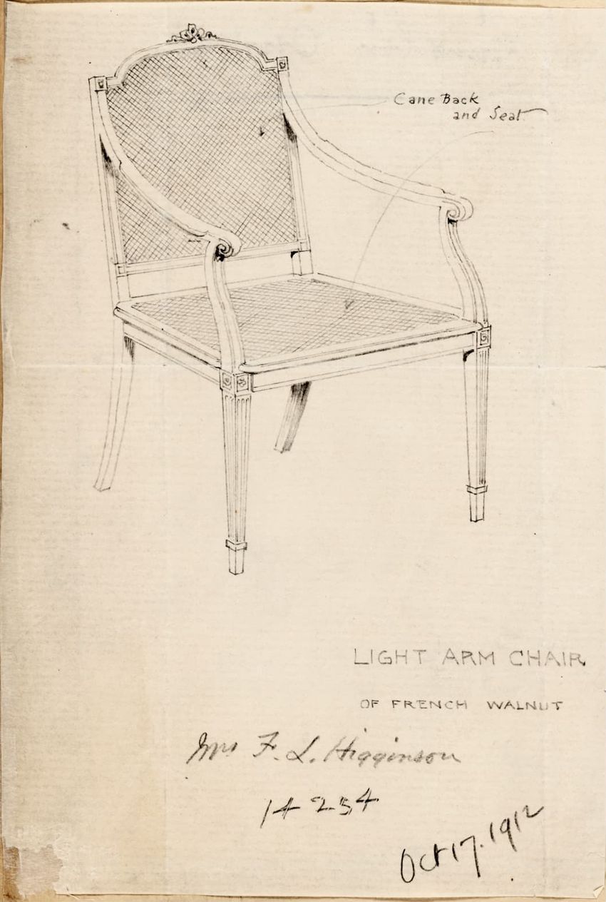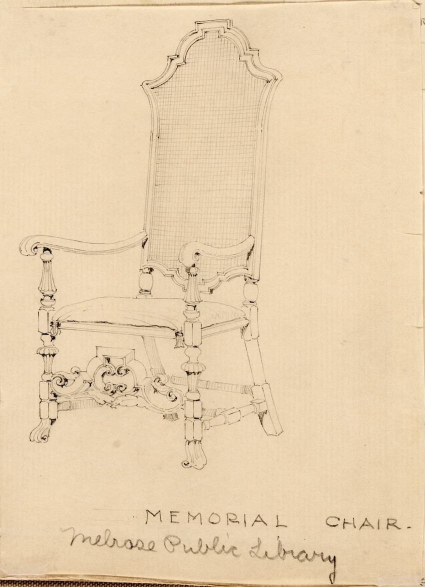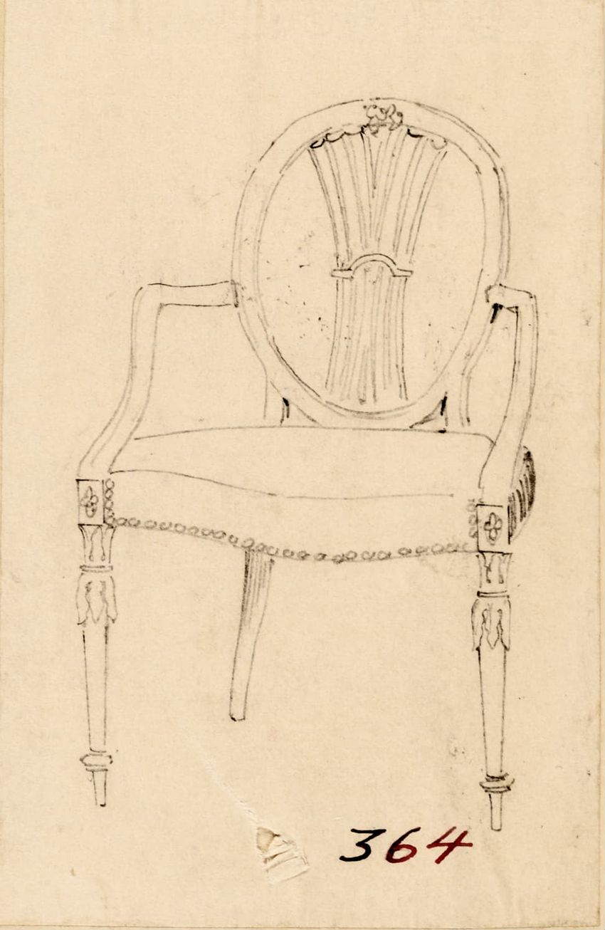 Design drawing titled "Chair" rendered in pencil on trace. Perspective view is shown. Side chair has back withshaped arched crest rail, five vasiform turned spindles, and straight lower rail; stiles with block, ring and vasiform turnings and ball finials; rush seat; legs with block, ring and vasifor...