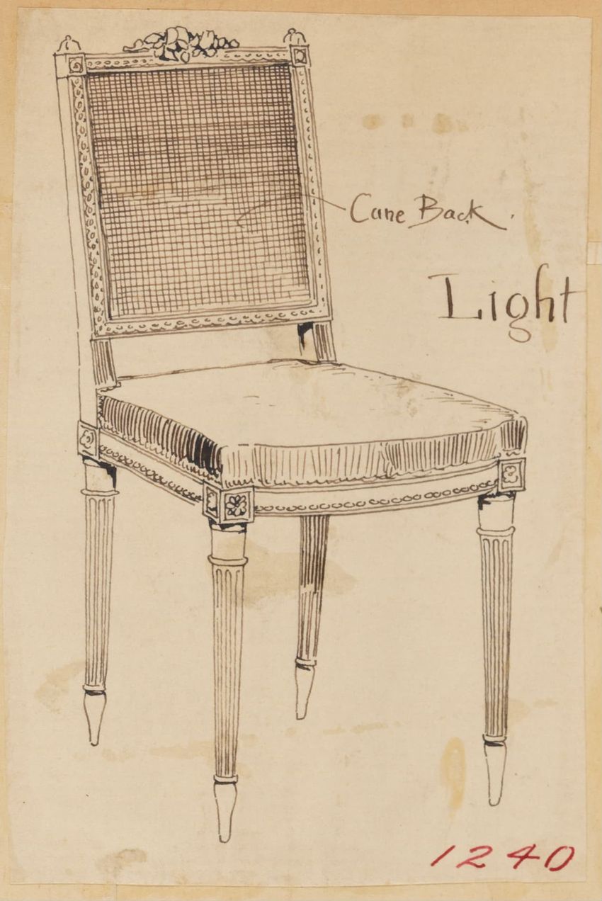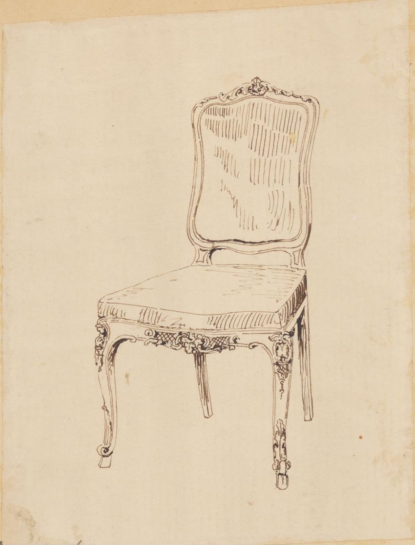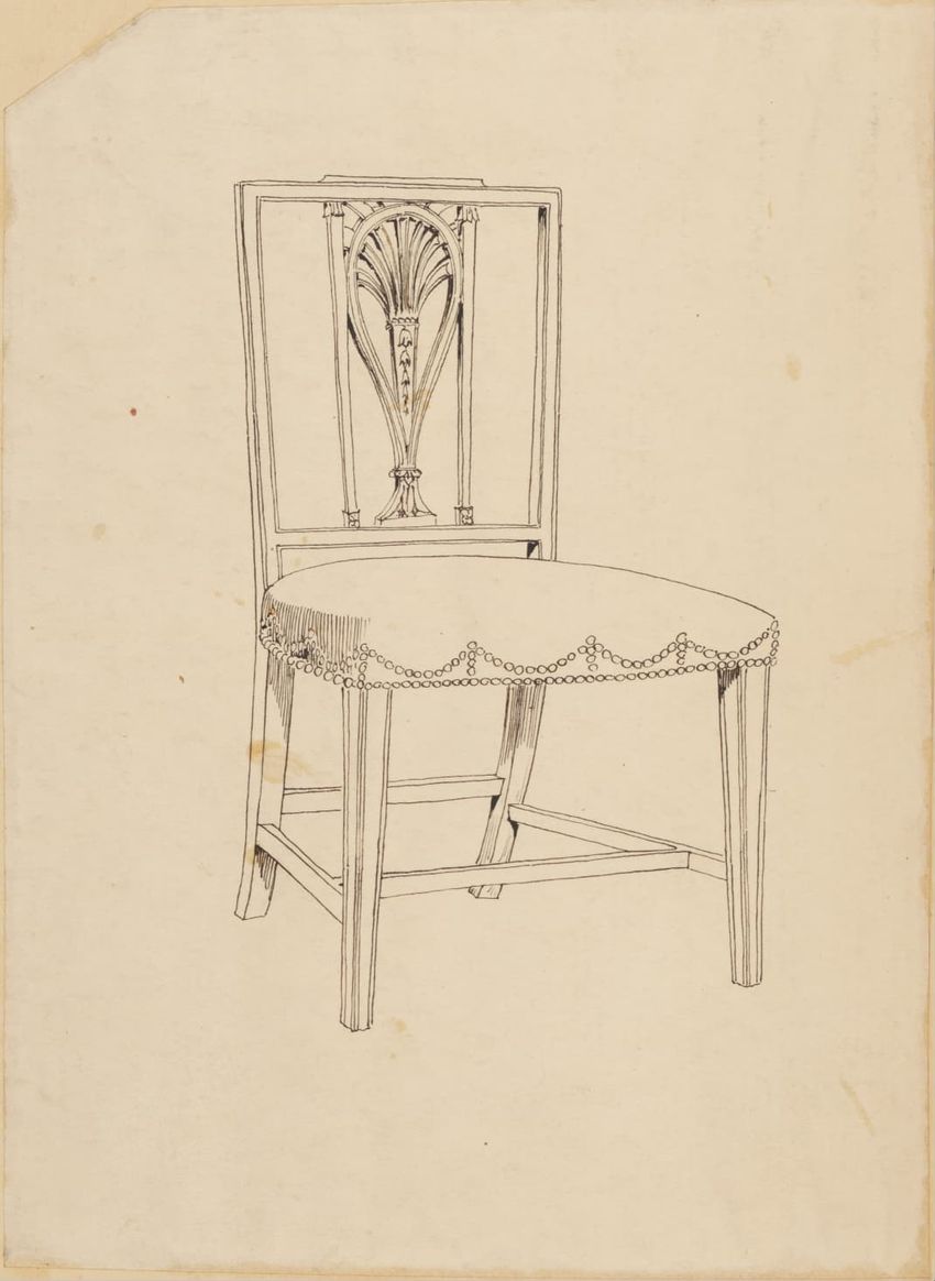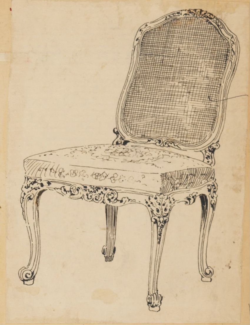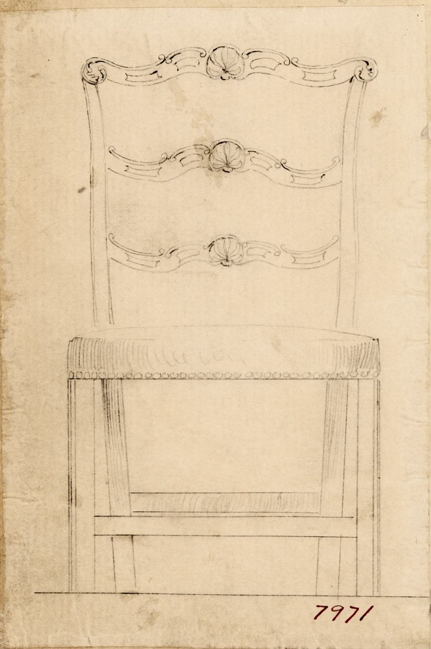 Untitled design drawing endered in pencil on trace. Front view is shown. Chippendale-style slat-back side chair has curved pierced crest rail with carved scrolls, center carved shell, and carved volutes at ends; two conforming slats; shaped stiles; seat with over-the-rail upholstery and single row o...