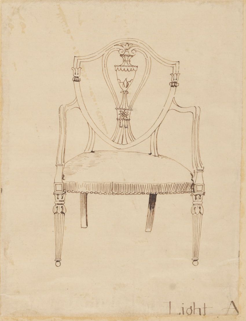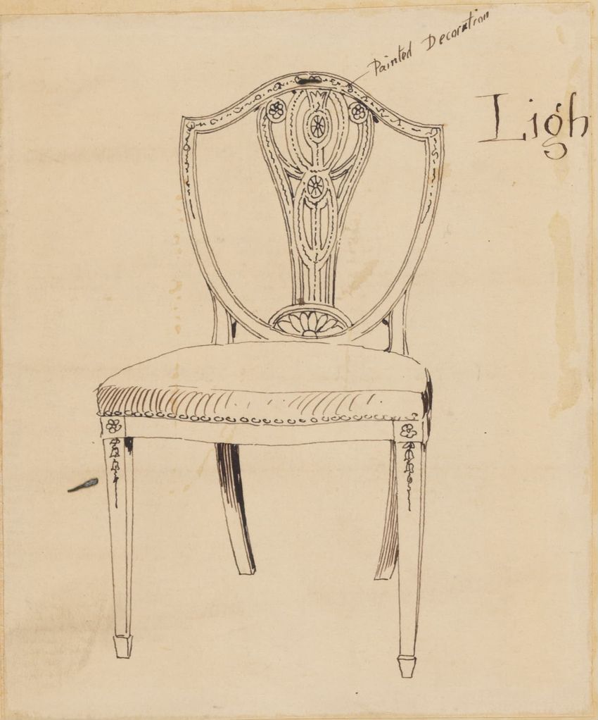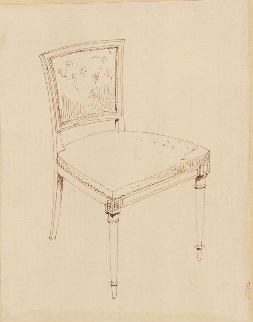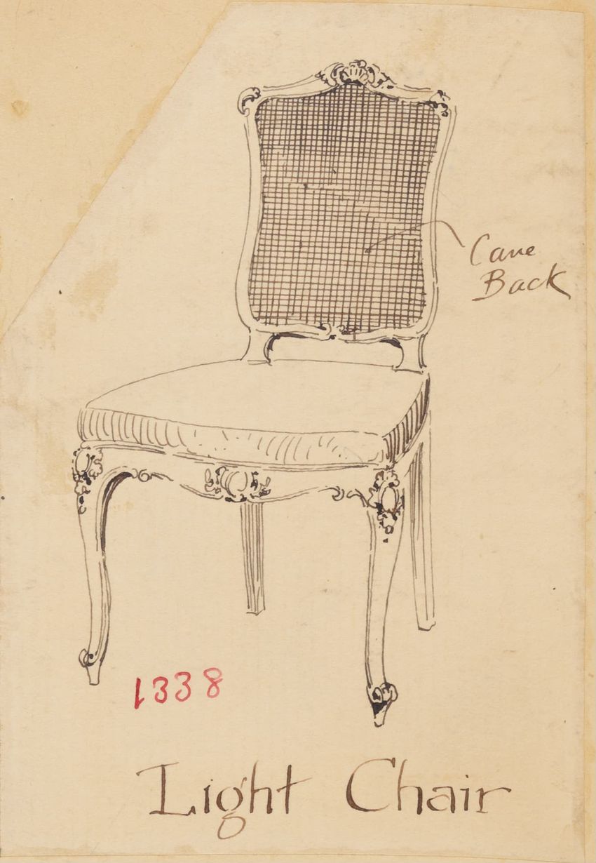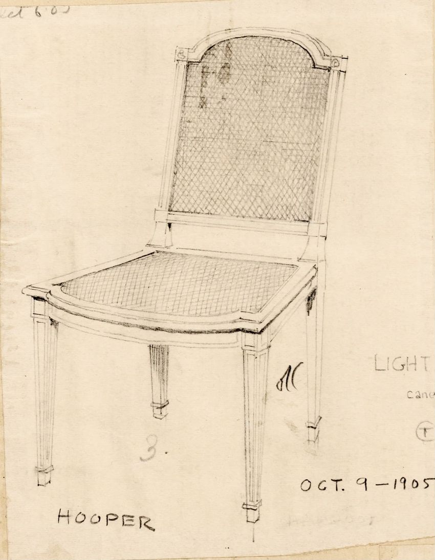 Untitled design drawing endered in pencil on trace. Front view is shown. Chippendale-style slat-back side chair has curved pierced crest rail with carved scrolls, center carved shell, and carved volutes at ends; two conforming slats; shaped stiles; seat with over-the-rail upholstery and single row o...