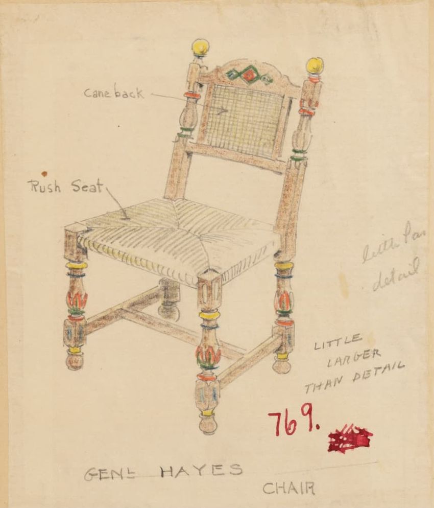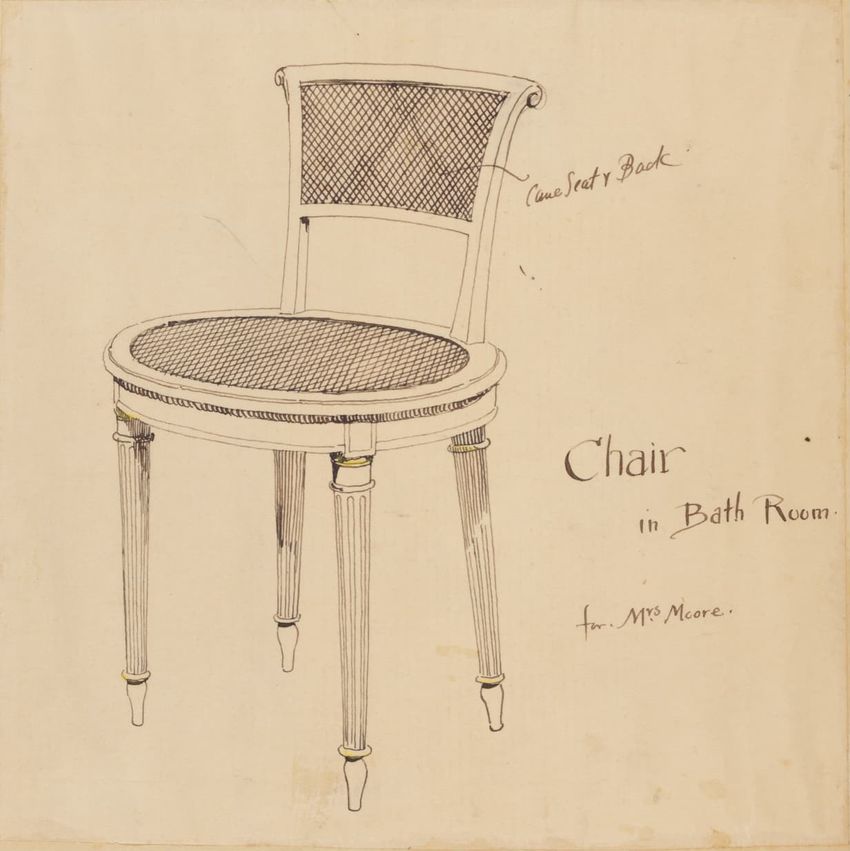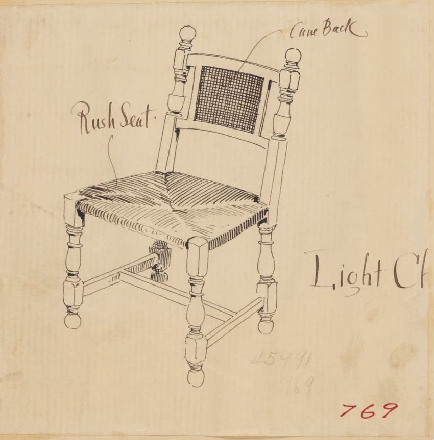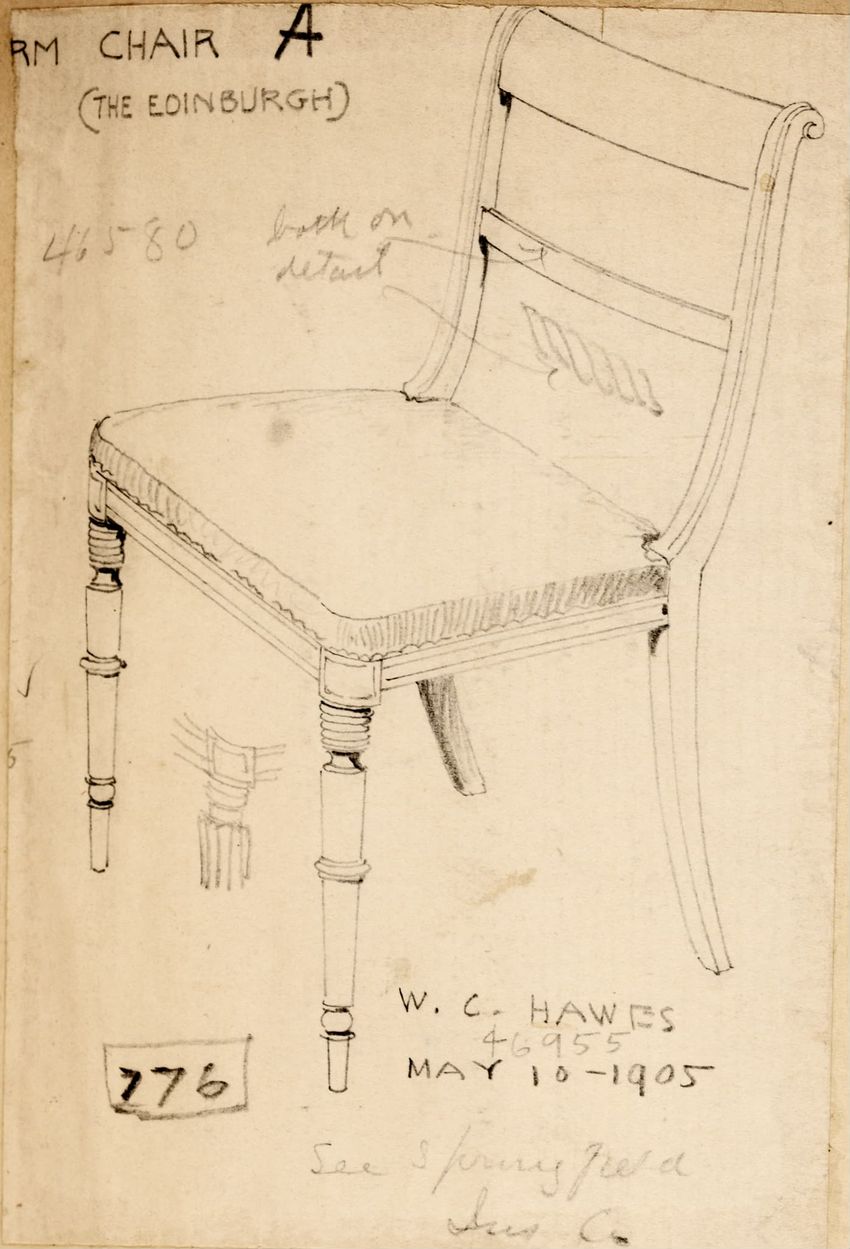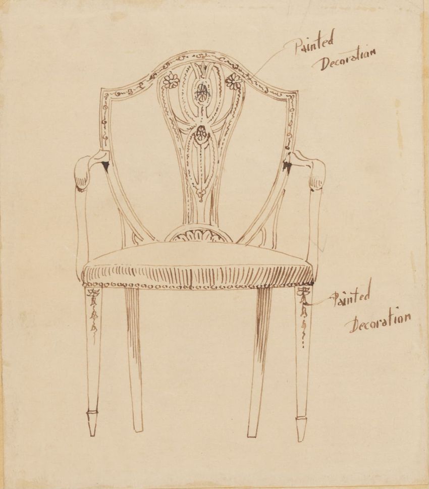 Untitled design drawing endered in pencil on trace. Front view is shown. Chippendale-style slat-back side chair has curved pierced crest rail with carved scrolls, center carved shell, and carved volutes at ends; two conforming slats; shaped stiles; seat with over-the-rail upholstery and single row o...