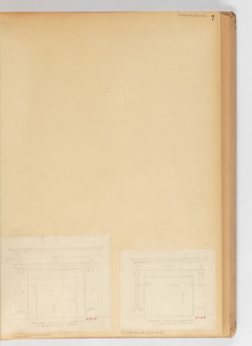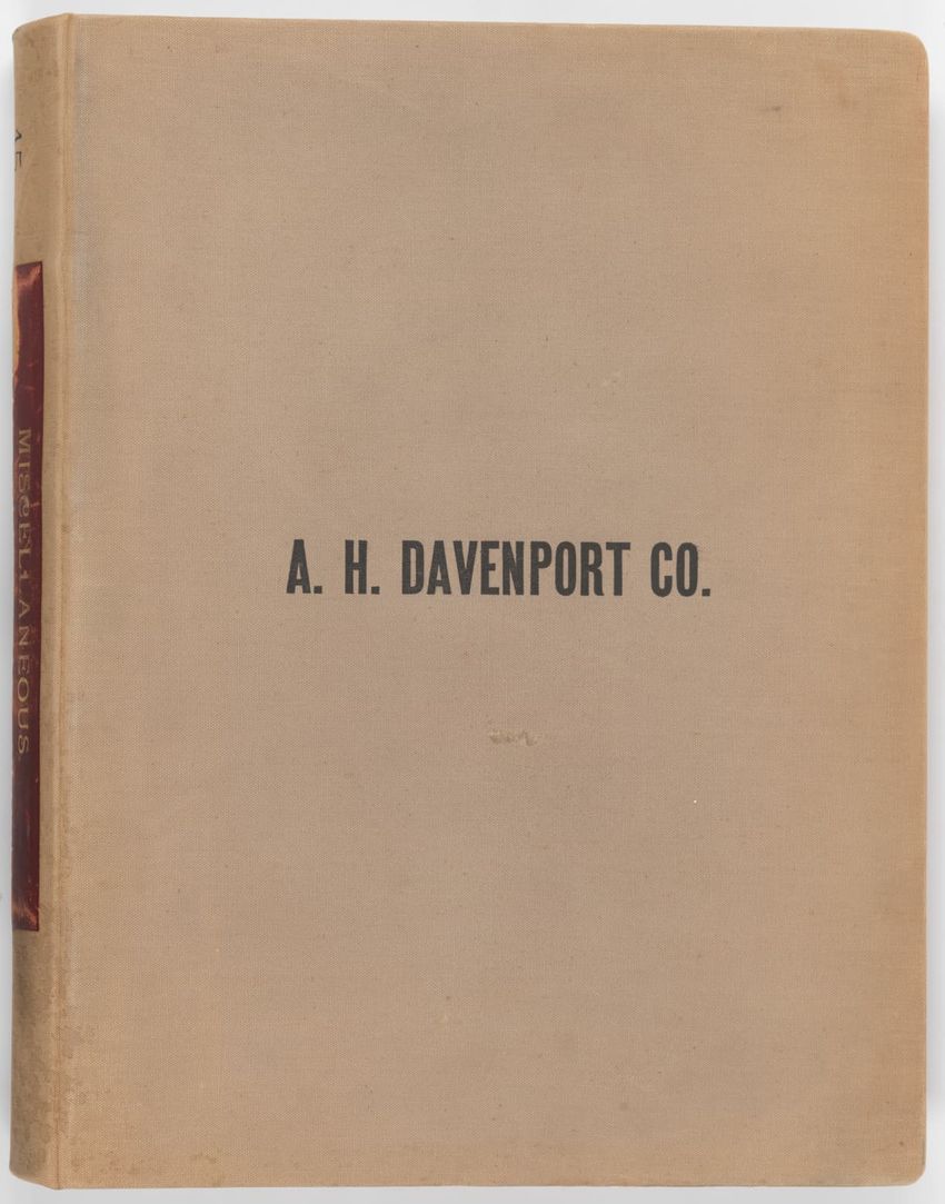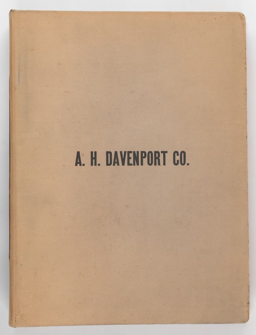 Album of design drawings produced by A. H. Davenport Co. titled: "Beds." The title is printed on the spine in gold on a red leather label. The company name is printed in black on the front cover; the volume number "11" is also printed in black on the spine. Album has a beige fabric covering and 204 ...