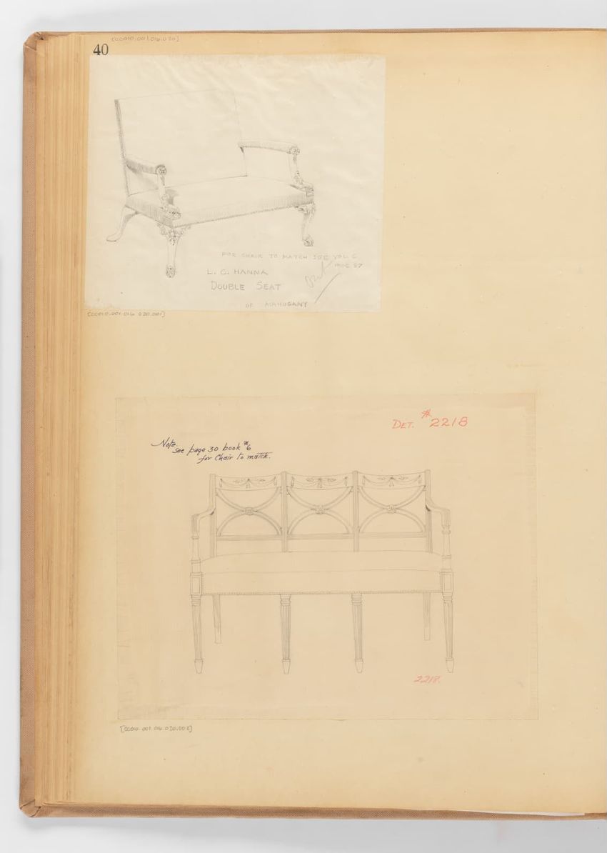 Design drawing titled "Sofa" rendered in pencil and ink. Perspective view is shown. Rococo Revival or Louis XV-style sofa has serpentine crest rail and arm rails; C-scroll arm supports; upholstered seat, back and sides, serpentine curved skirt; two cabriole front legs terminating in C-scrolls atop p...