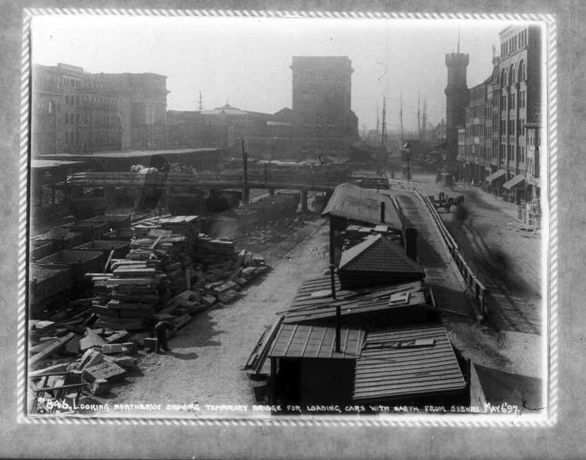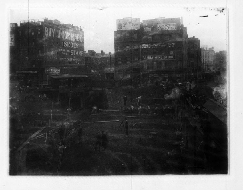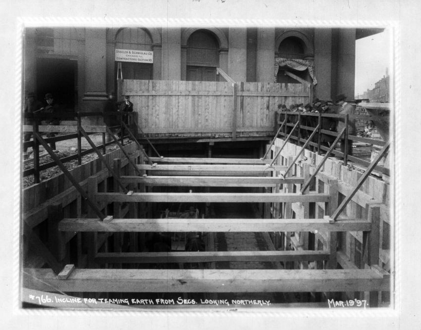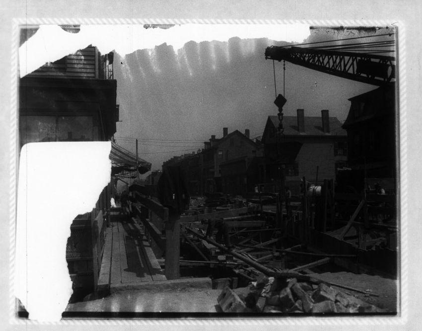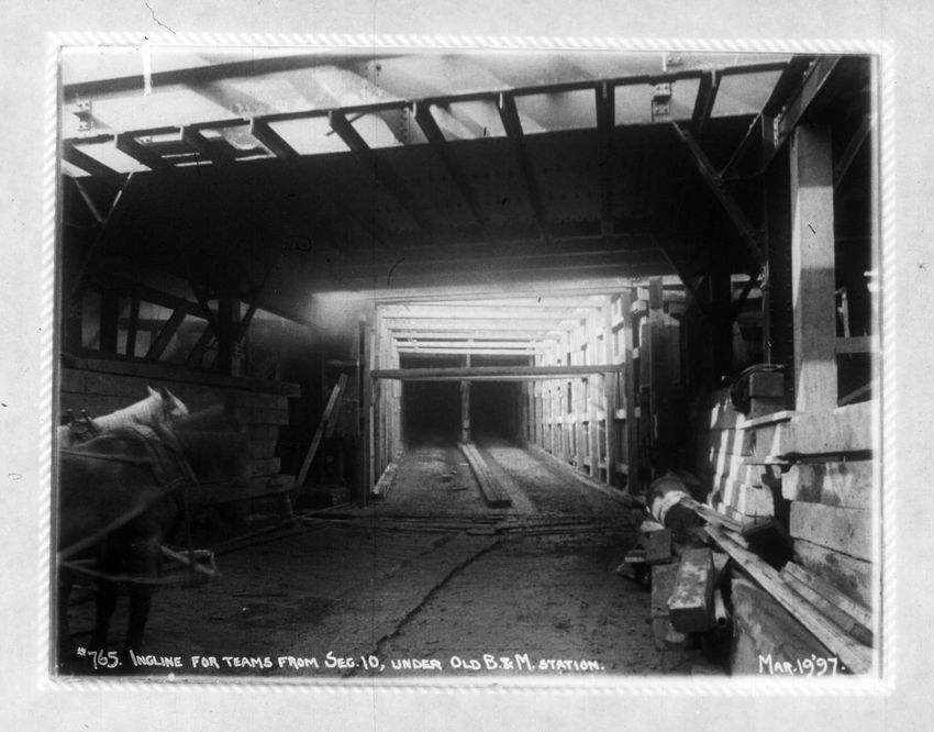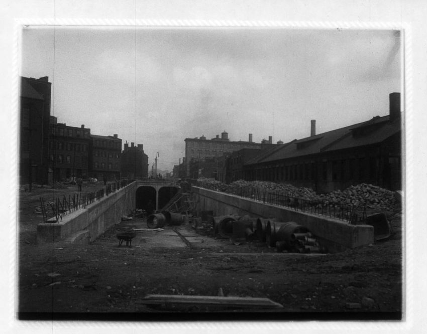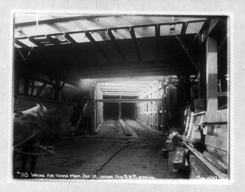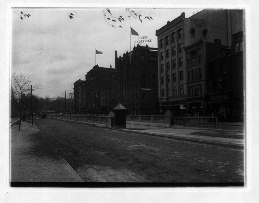 The incline taking the streetcar line underground on Boylston Street can be seen. The Hotel Thorndike is on the right and the Public Garden is on the left in the image.