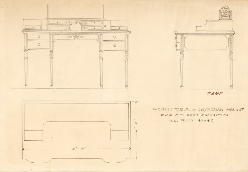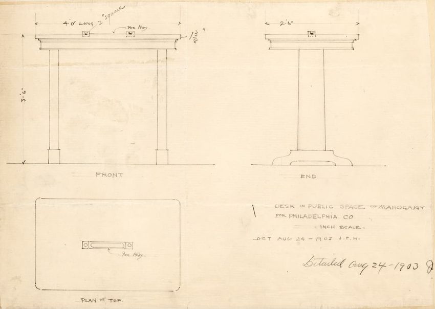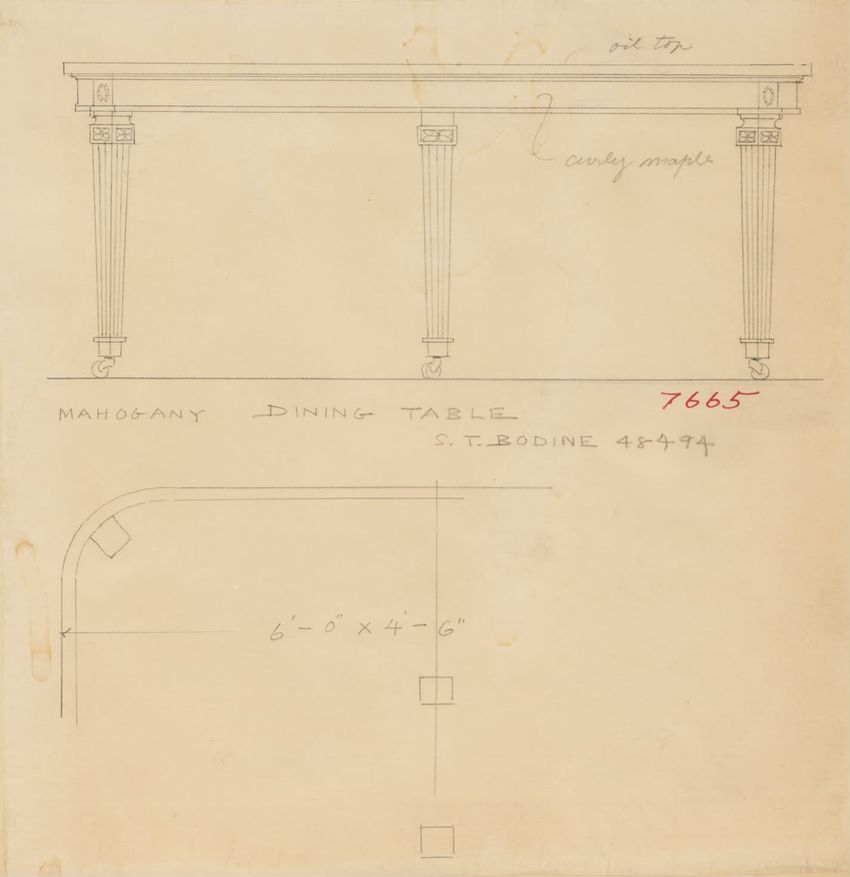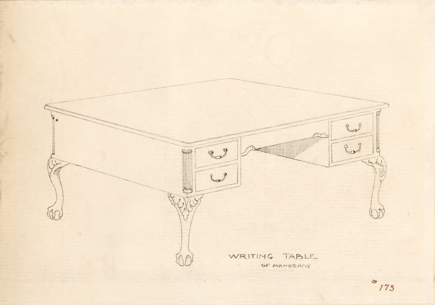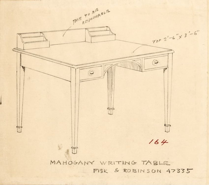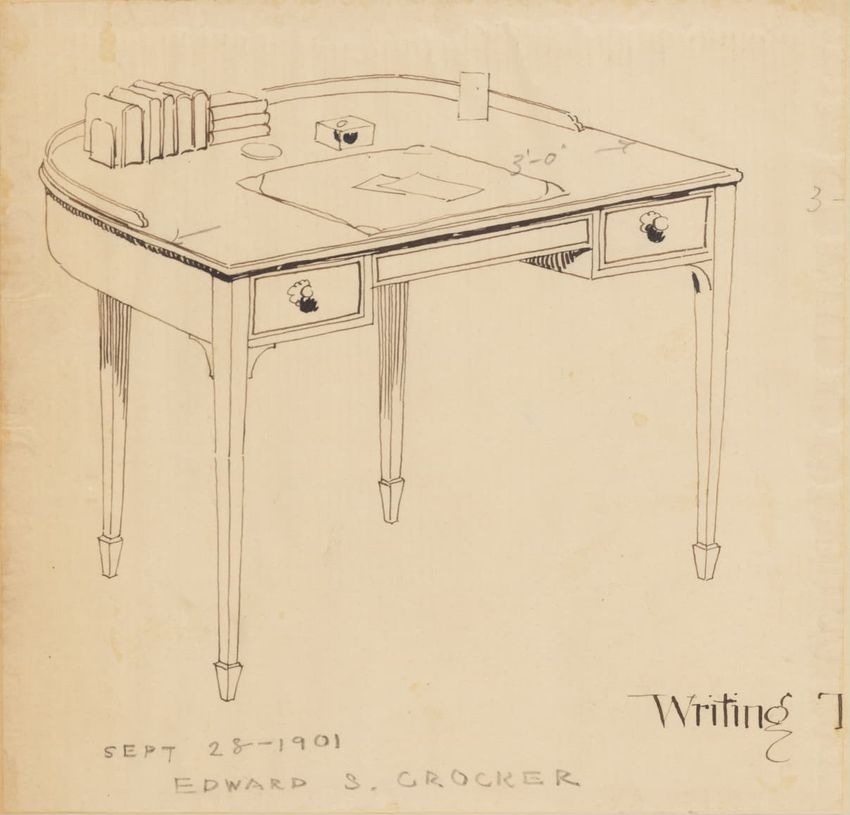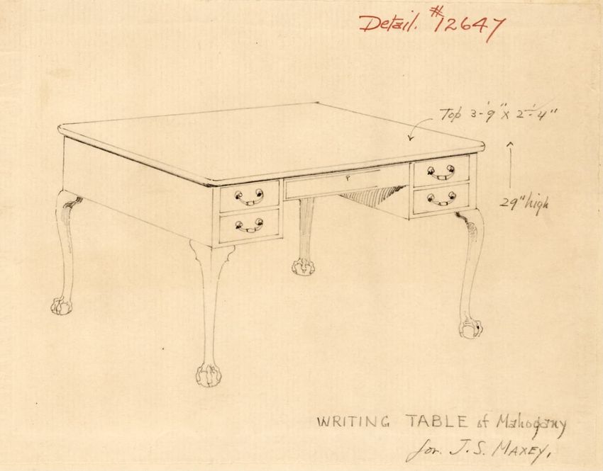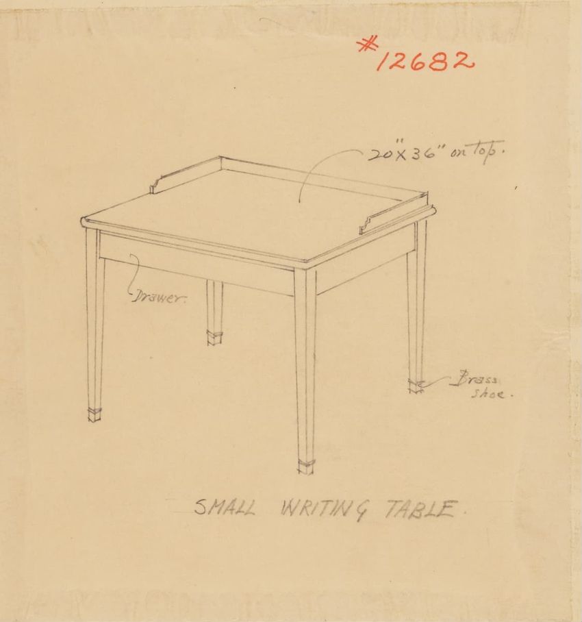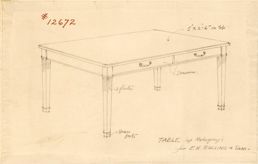 Design drawing titled "Table of Mahogany" rendered in pencil on trace. Perspective view is shown. Rectangular writing table has overhanging top with molded edge; two shallow drawers with bail handles; and tapered fluted square legs with brass feet. Title, design notes, "for E. H. Rollins & Sons" and...