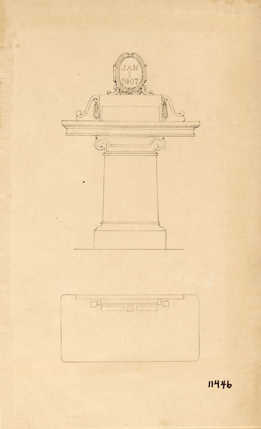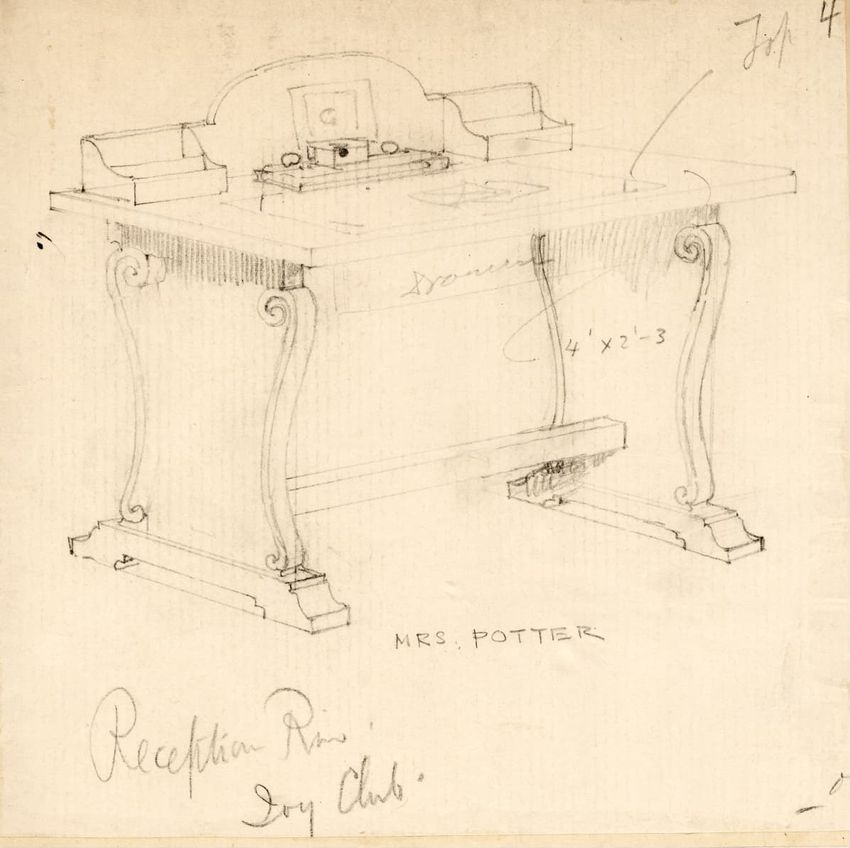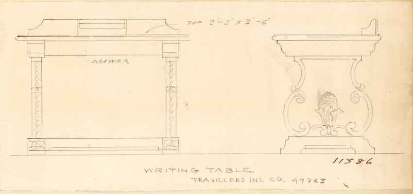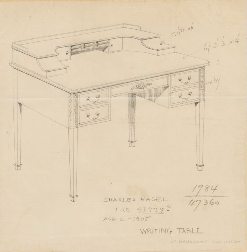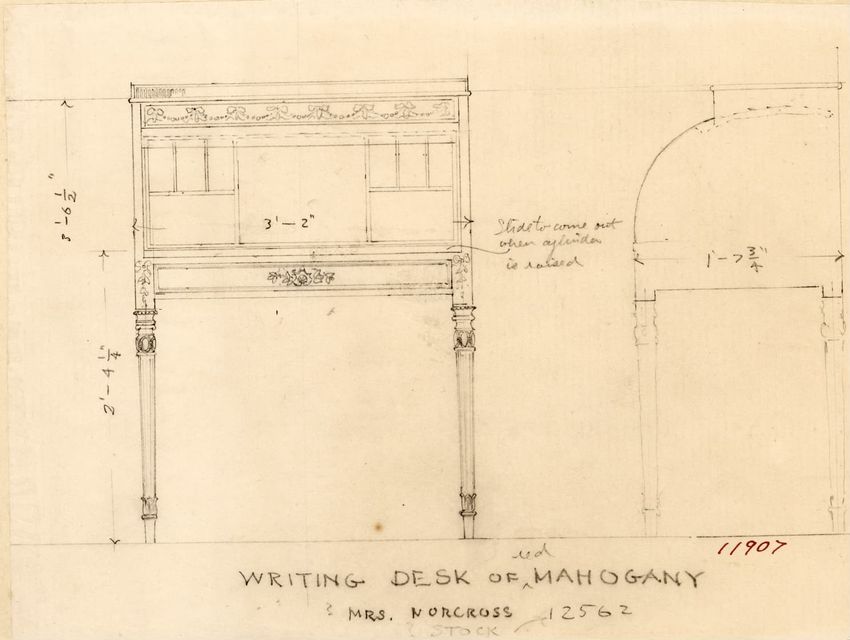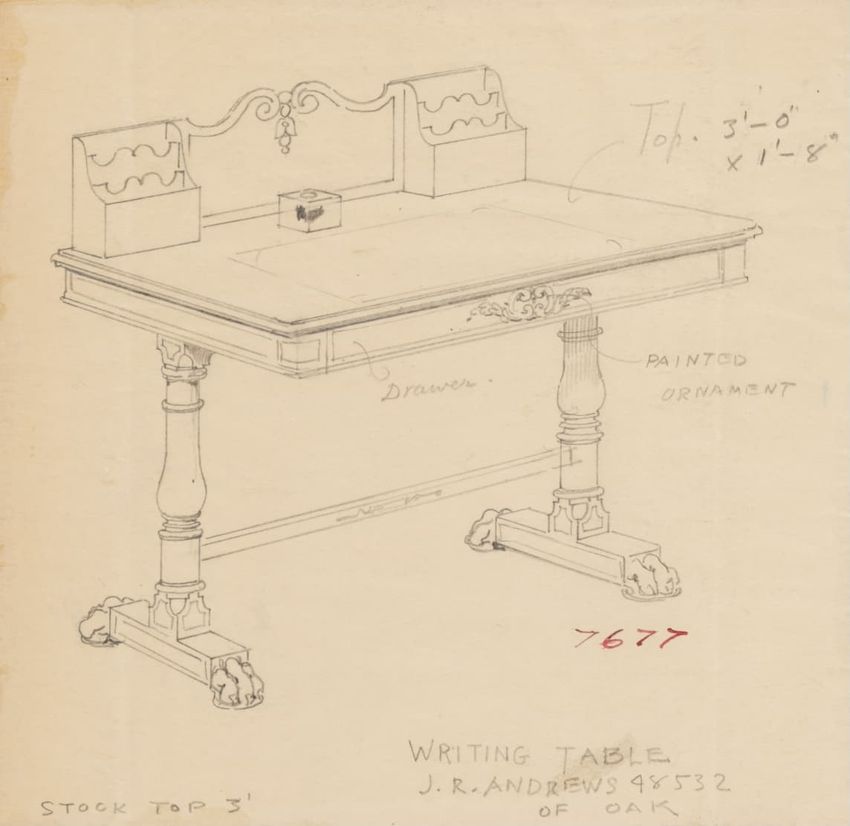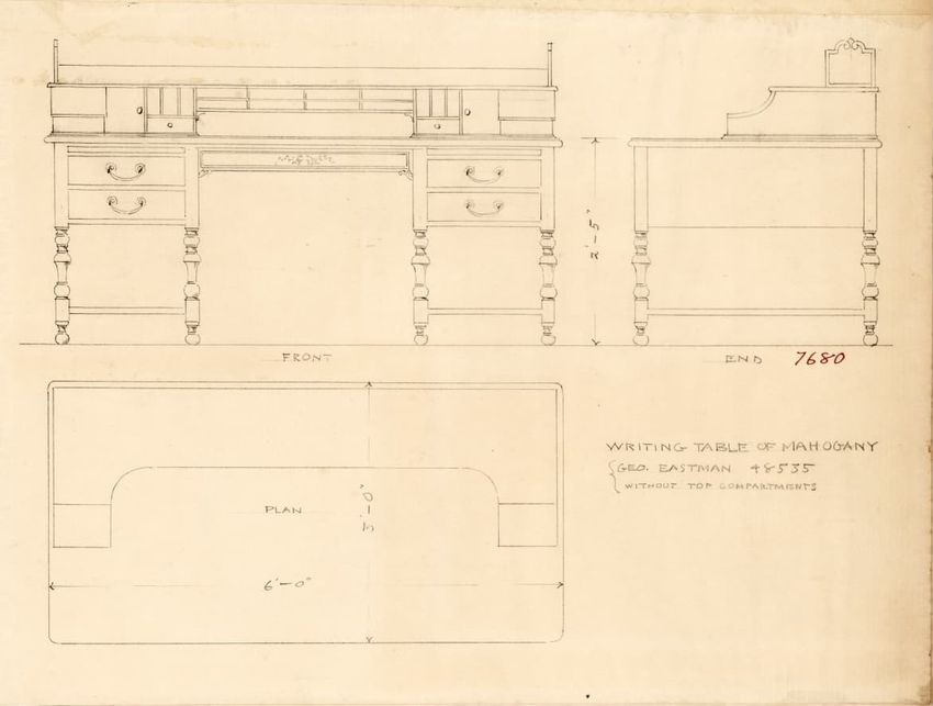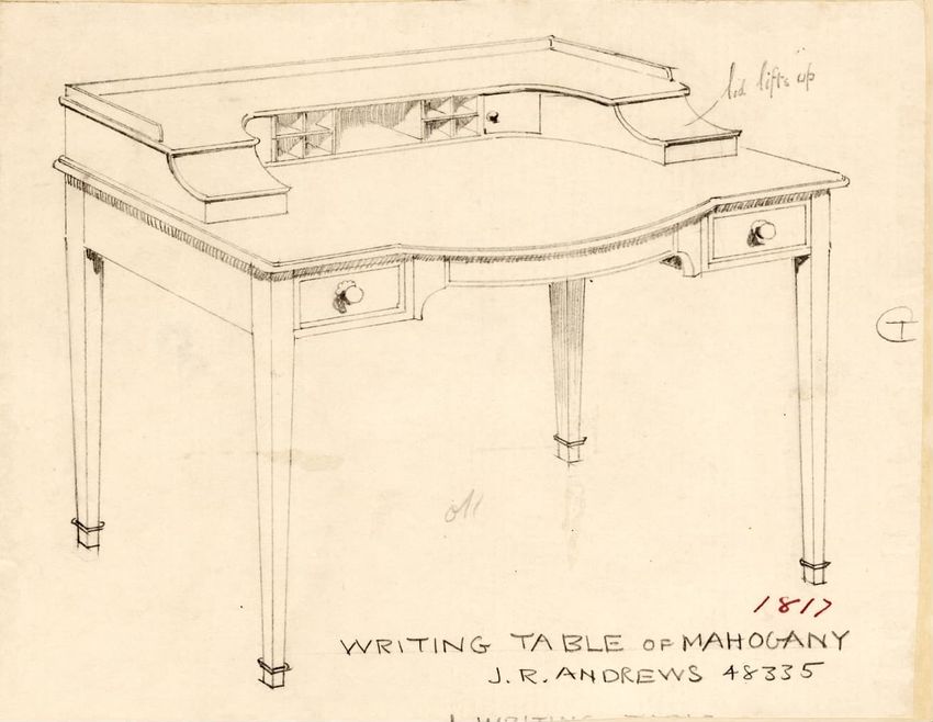 Design drawing titled "Table of Mahogany" rendered in pencil on trace. Perspective view is shown. Rectangular writing table has overhanging top with molded edge; two shallow drawers with bail handles; and tapered fluted square legs with brass feet. Title, design notes, "for E. H. Rollins & Sons" and...