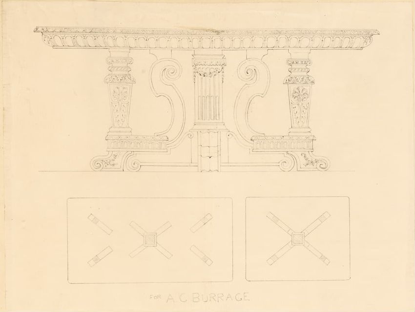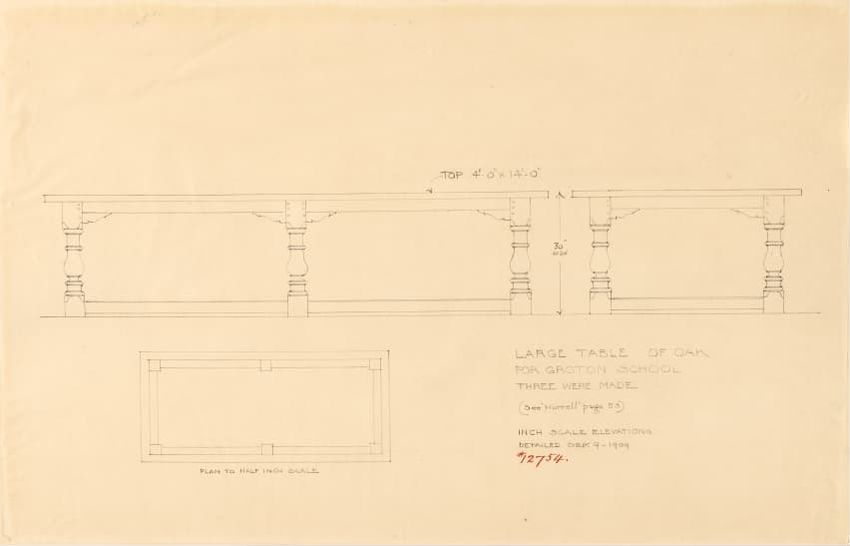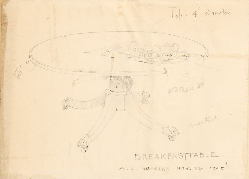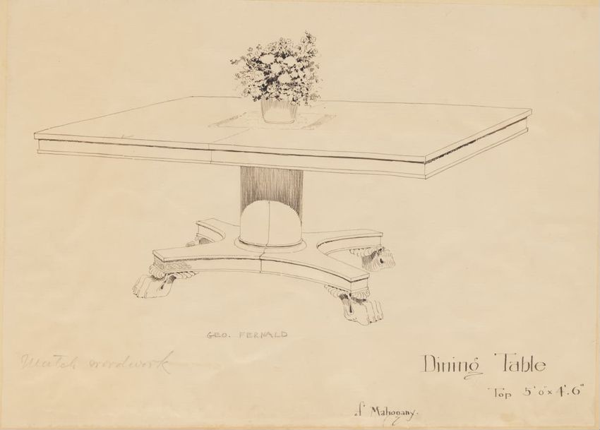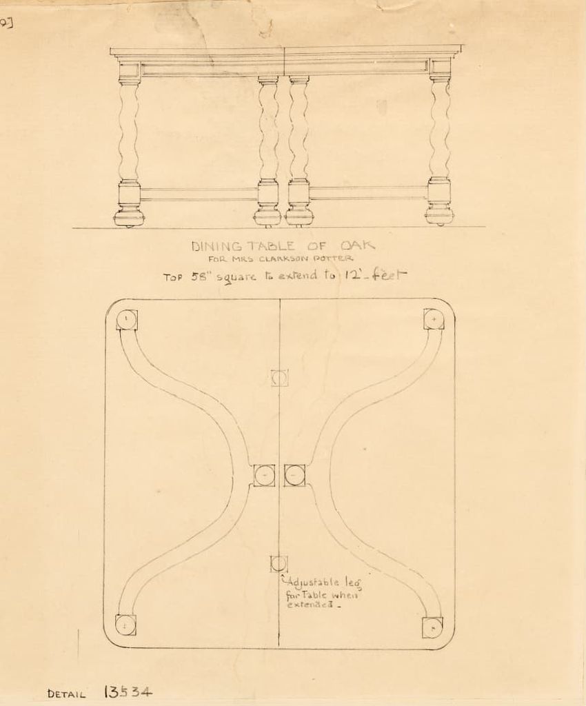 Untitled design drawing rendered in pencil on trace. Perspective view is shown. Round gate-leg dining table has overhanging top with molded edge; shaped apron; four stationary and four swing legs with ring, vasiform, cup and block turnings; and ovoid feet. "9581" is handwritten on drawing.