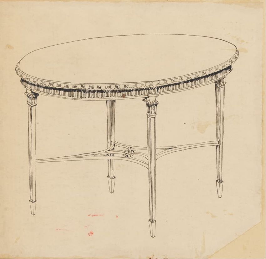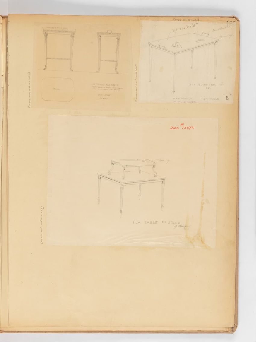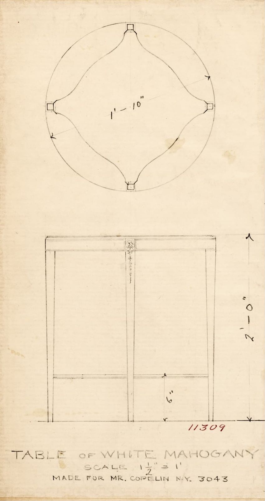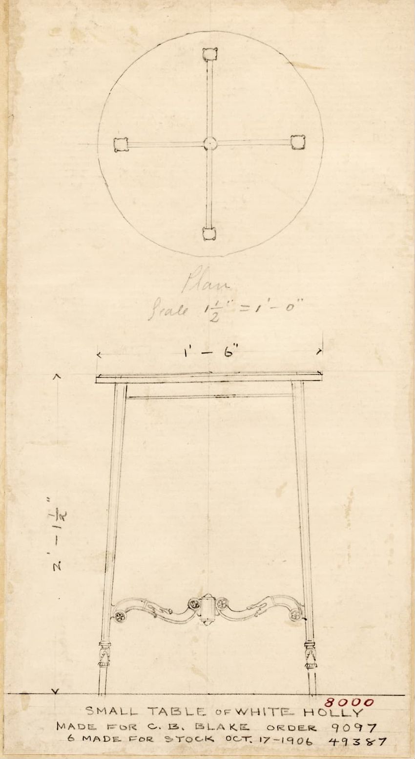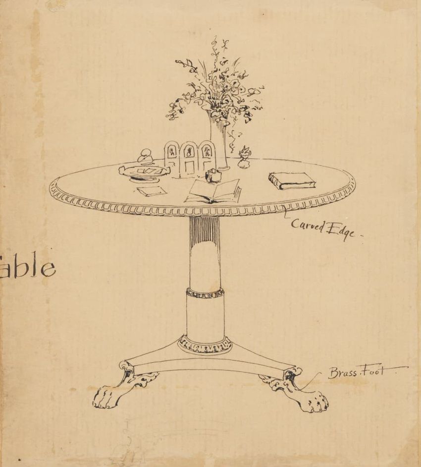 Design drawing titled "Small Table" rendered in pencil on trace. Perspective view is shown. Table has round top with molded edge; slender faceted columnar support that flares at bottom; flat tripod base with inlaid or painted stringing and floral motifs; and bun feet. Title, design notes, "Hapgood,"...