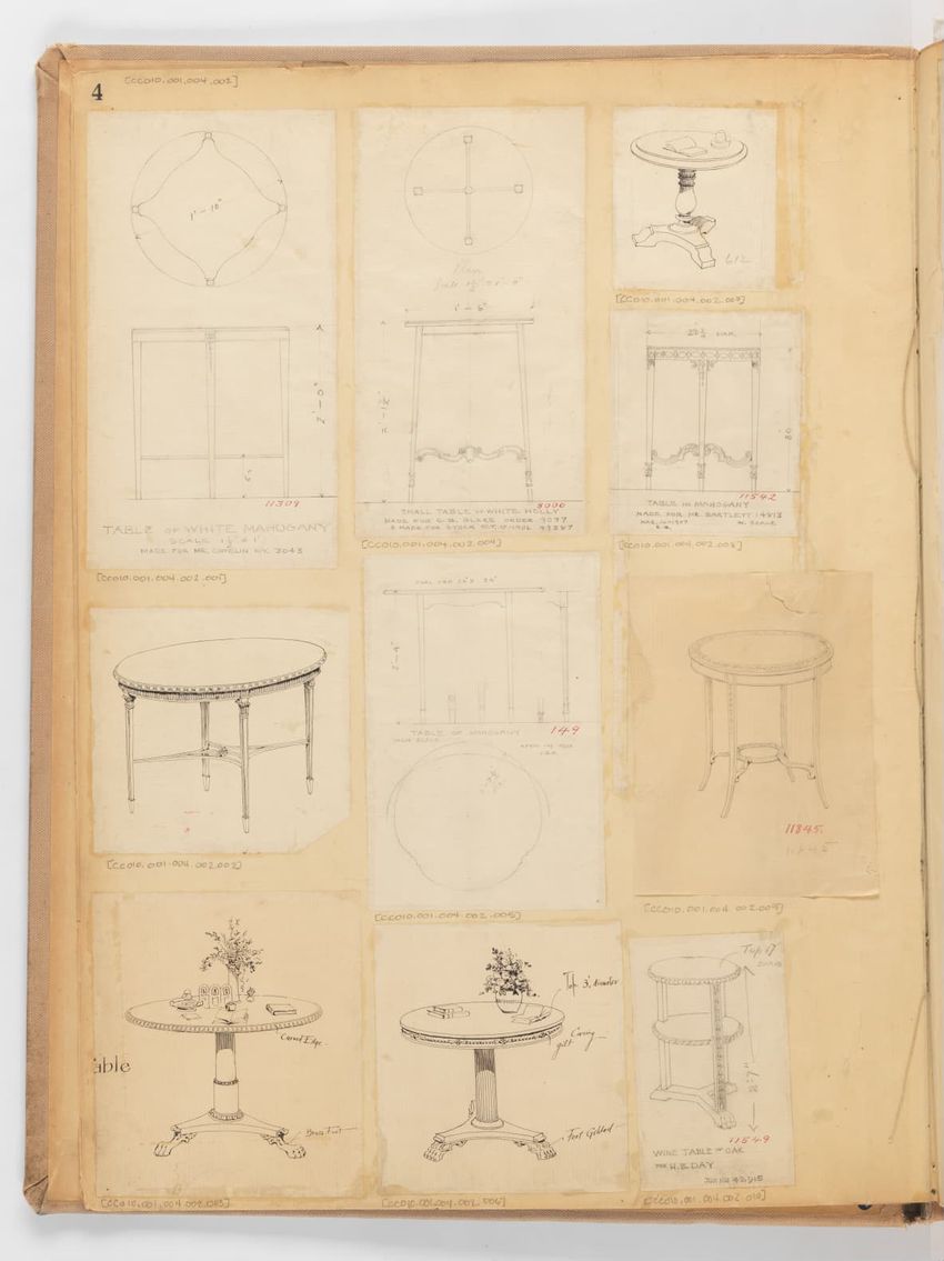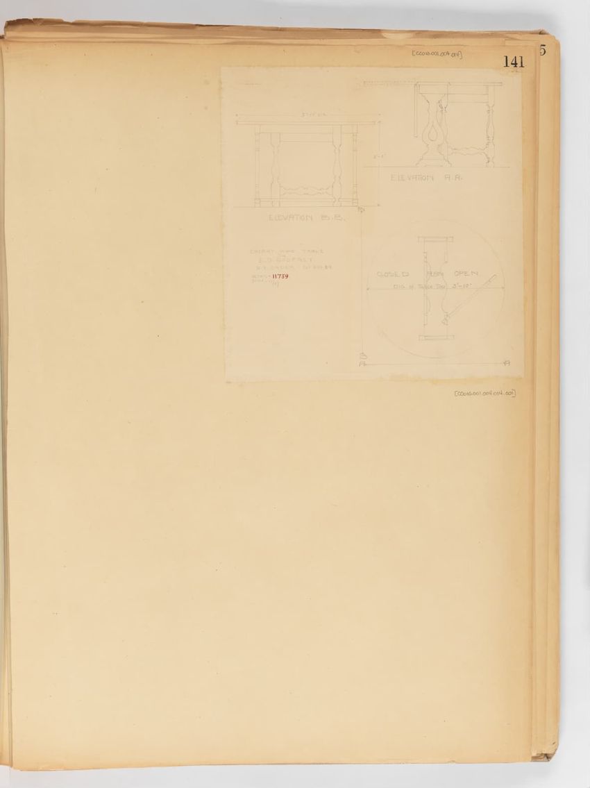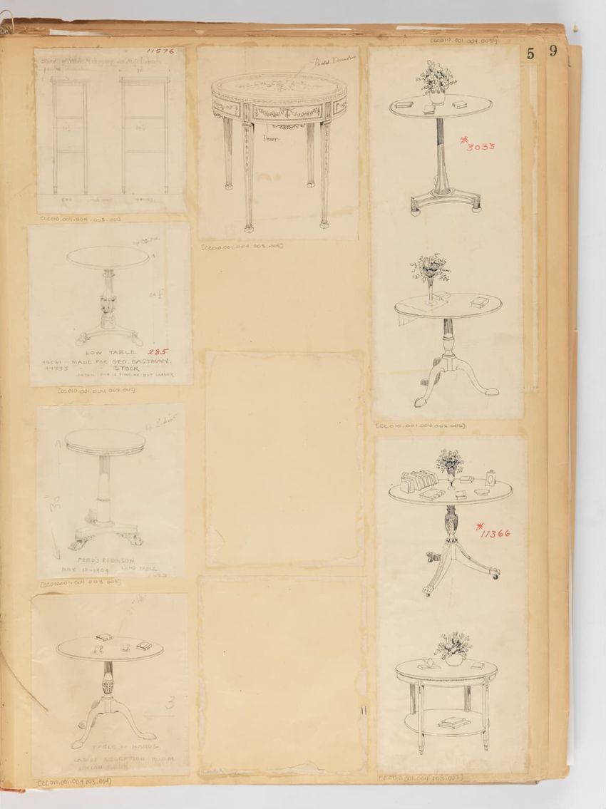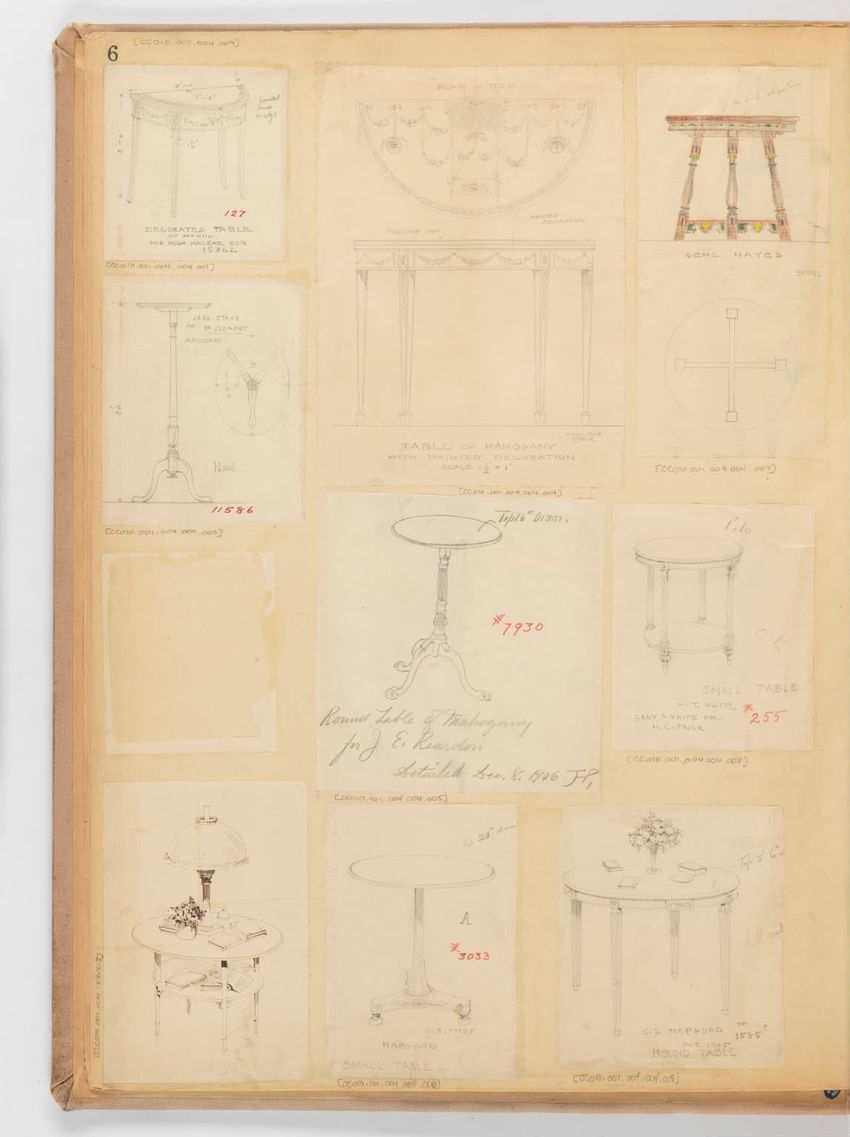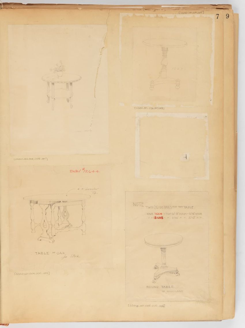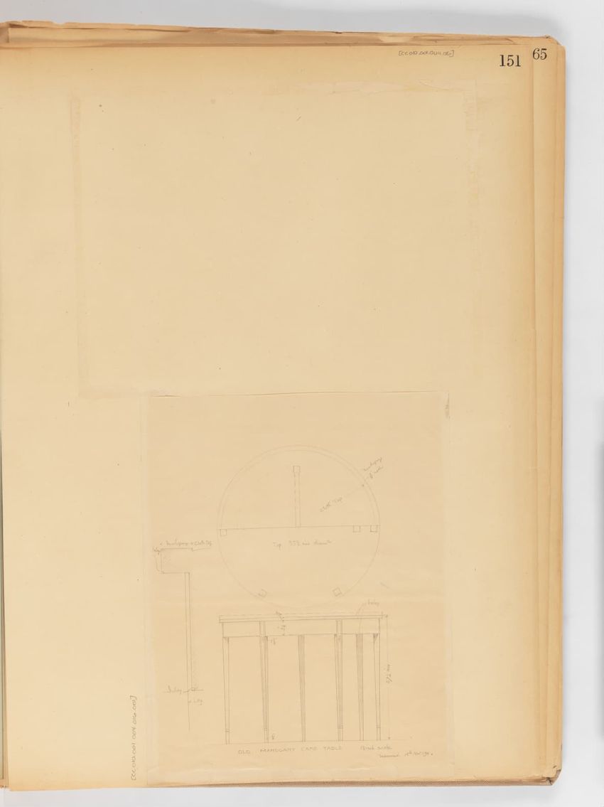Design drawing titled "Small Table" rendered in pencil on trace. Perspective view is shown. Table has round top with molded edge; slender faceted columnar support that flares at bottom; flat tripod base with inlaid or painted stringing and floral motifs; and bun feet. Title, design notes, "Hapgood,"...