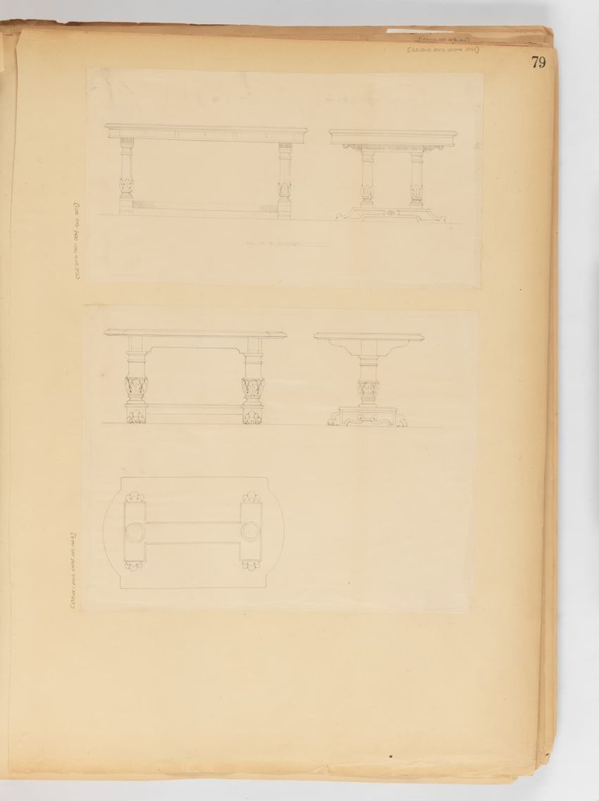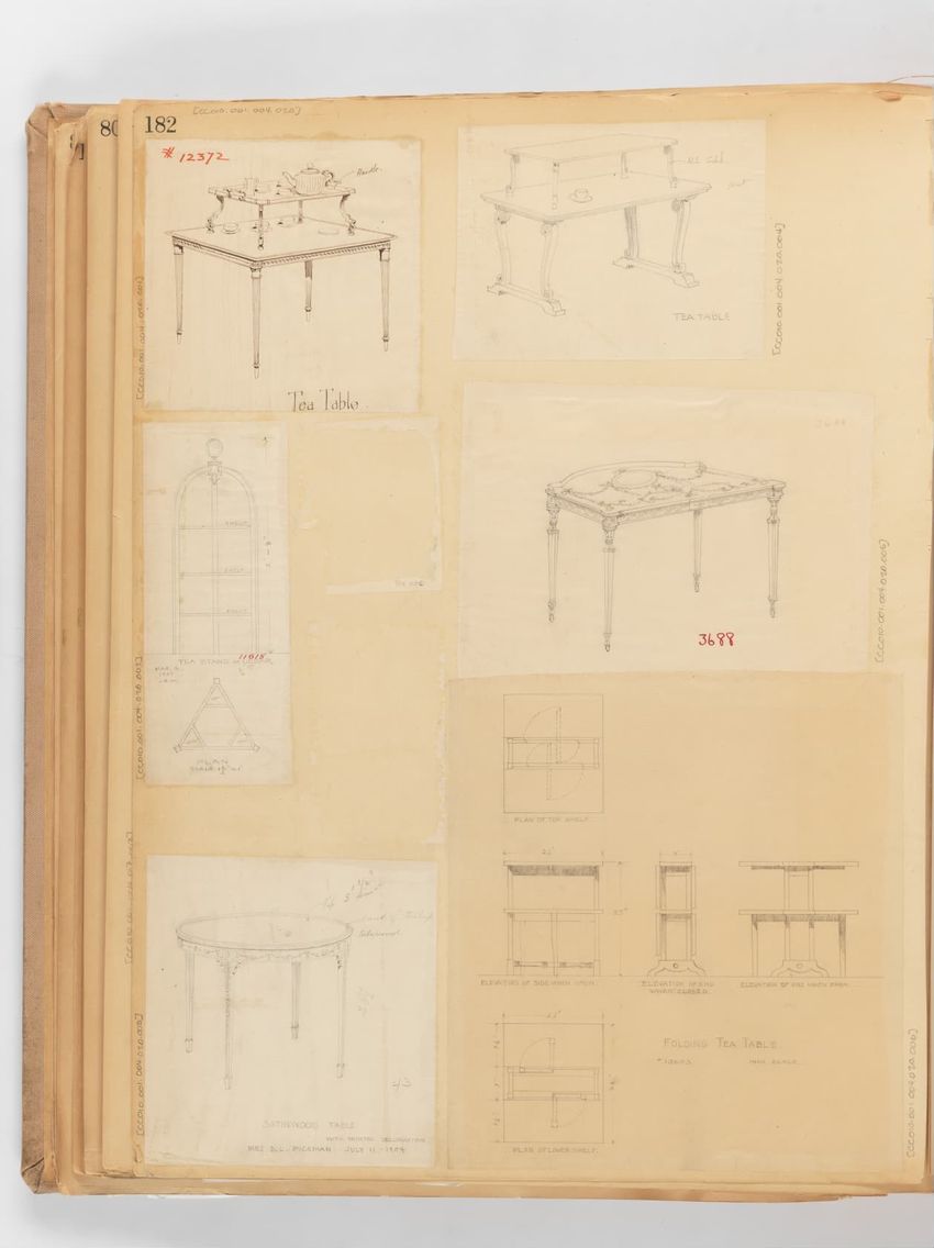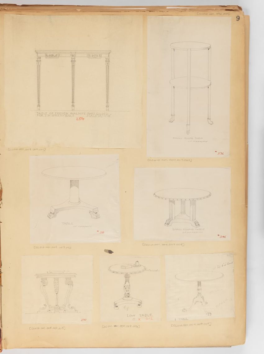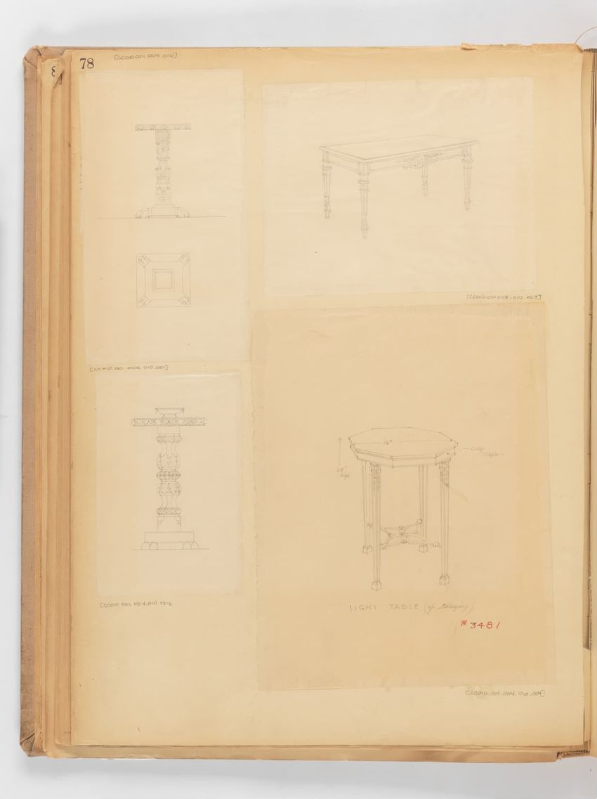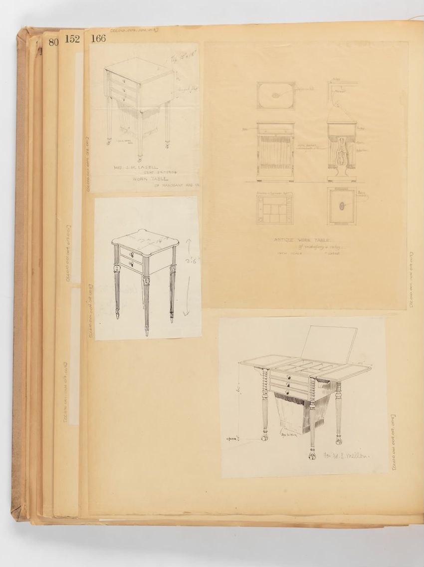 Design drawing titled "Small Table" rendered in pencil on trace. Perspective view is shown. Table has round top with molded edge; slender faceted columnar support that flares at bottom; flat tripod base with inlaid or painted stringing and floral motifs; and bun feet. Title, design notes, "Hapgood,"...