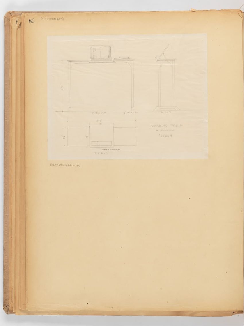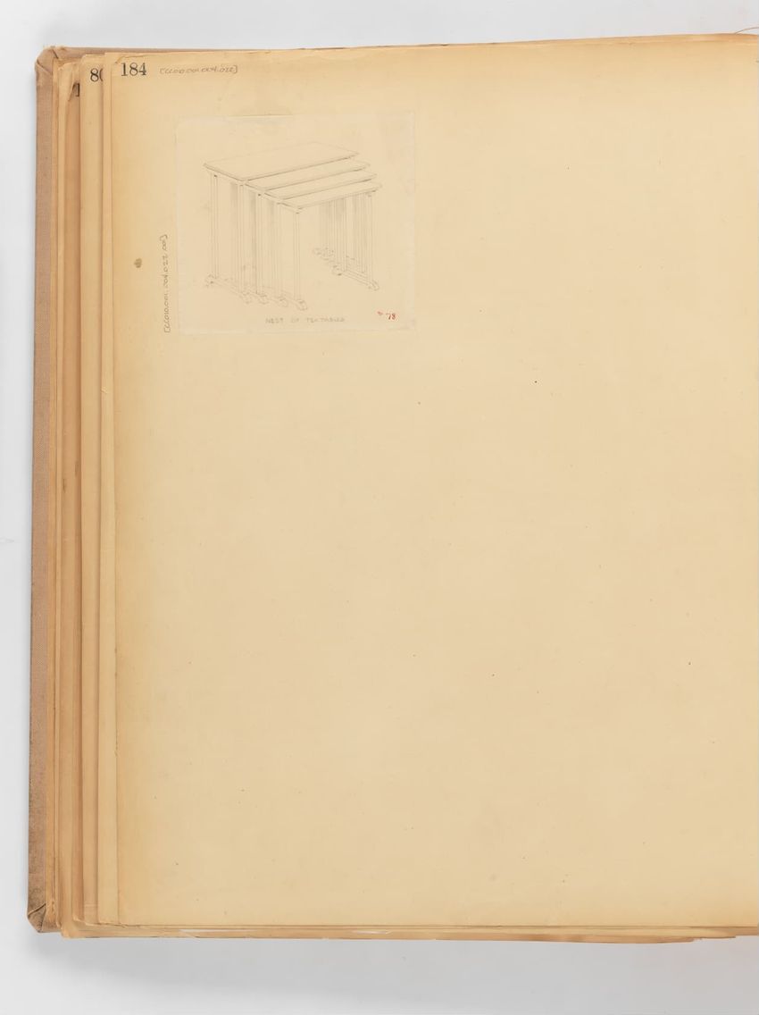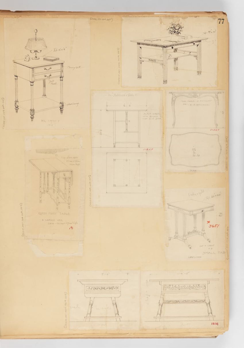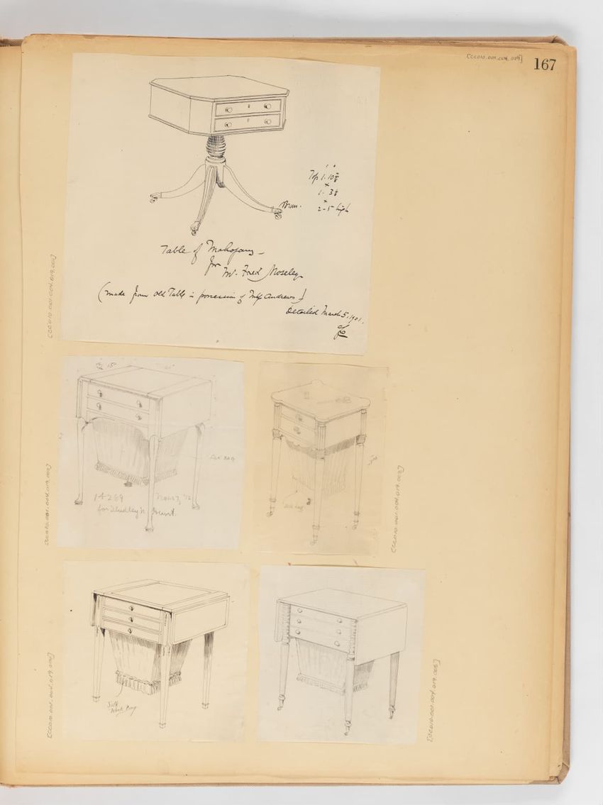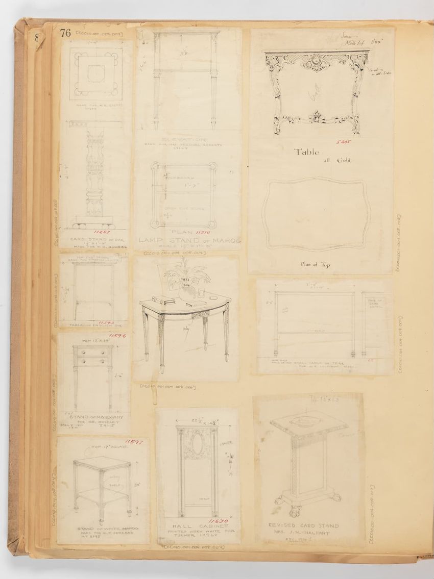 Design drawing titled "Small Table" rendered in pencil on trace. Perspective view is shown. Table has round top with molded edge; slender faceted columnar support that flares at bottom; flat tripod base with inlaid or painted stringing and floral motifs; and bun feet. Title, design notes, "Hapgood,"...