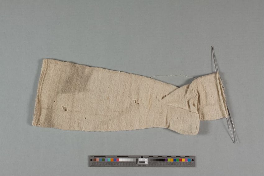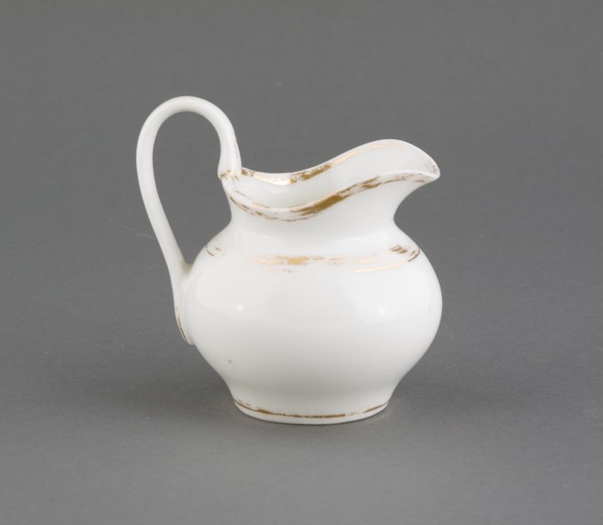Child-sized white porcelain sugar bowl, molded foliate handles, gold rim, and gold bands around body and base. Lid has foliate knop with gold accents and bands around knop and rim. Partial tea service of sugar bowl, cream pitcher, five plates, five saucers, and five cups.