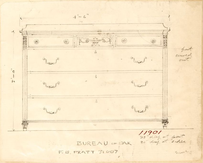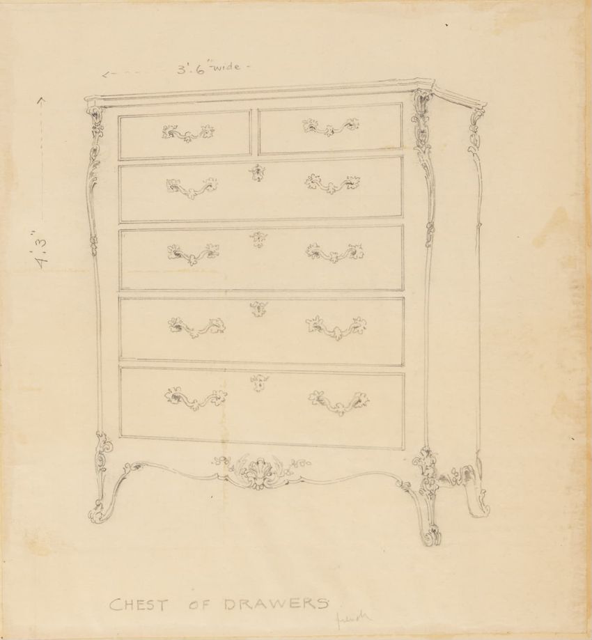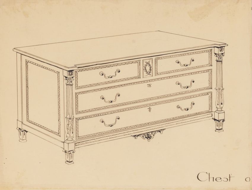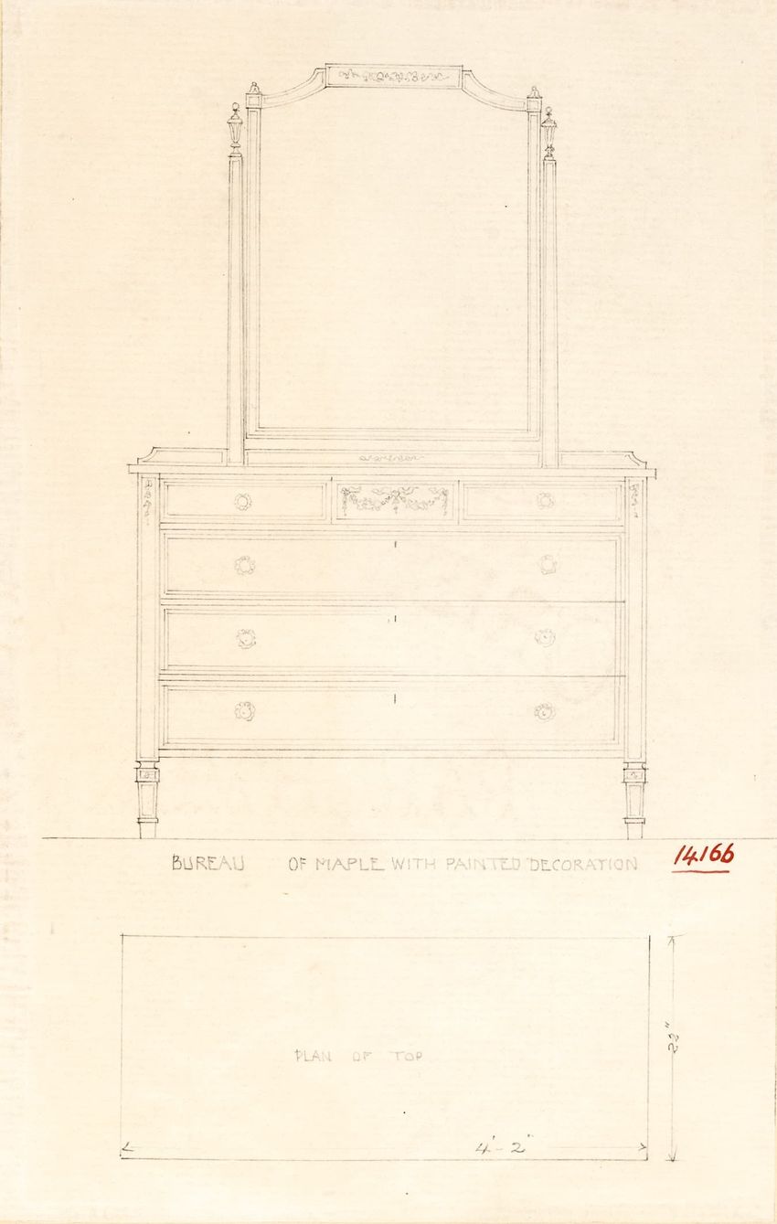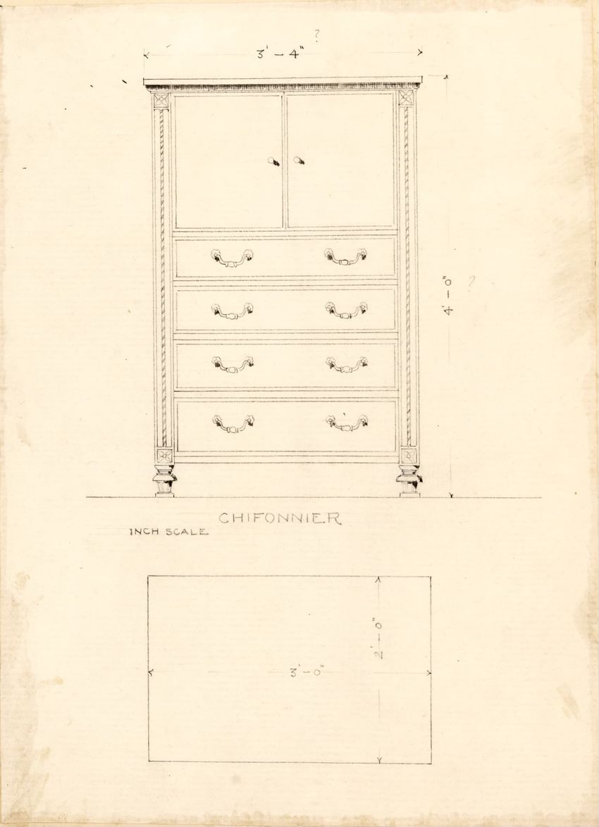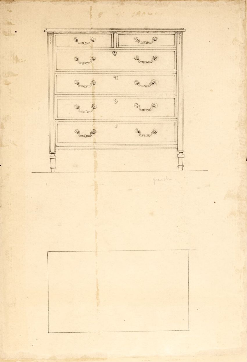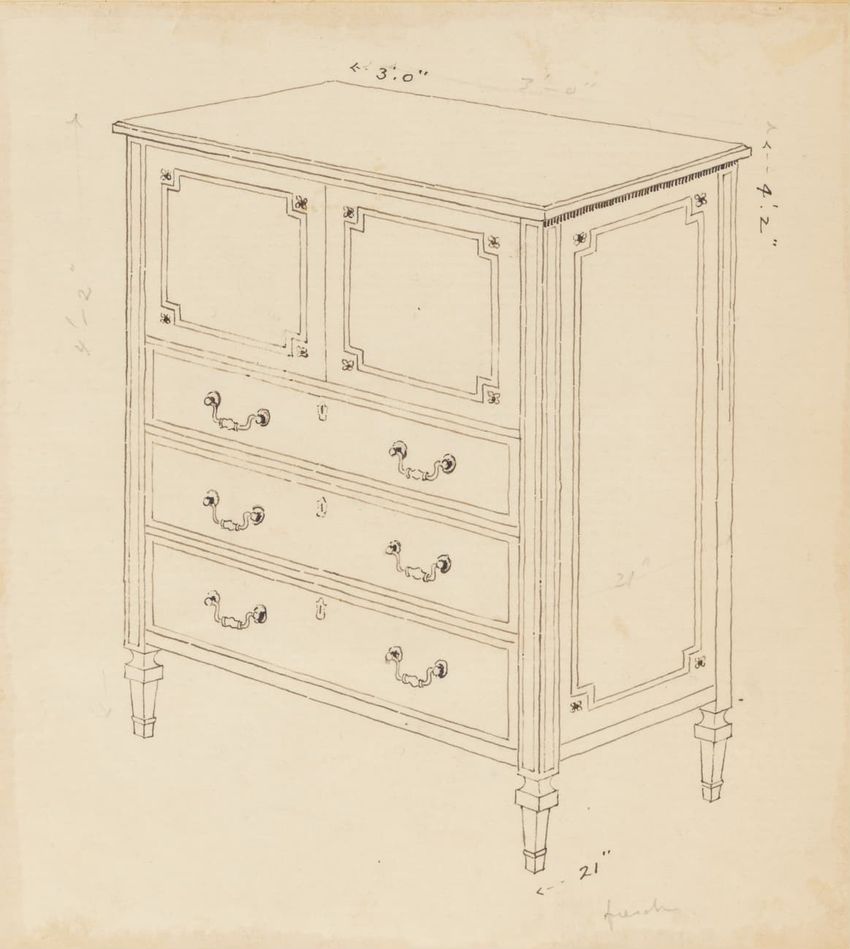 Untitled design drawing rendered in pencil on trace. Front and side views are shown. Rectangular bureau has overhanging top; four drawers with bail handles in a two-over-two arrangement; straight skirt; square stiles with carved, painted or inlaid trefoil motif and stringing; and tapered cylindrical...