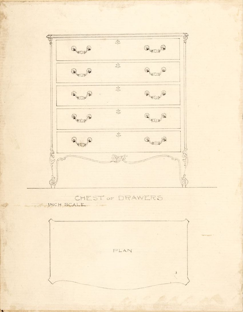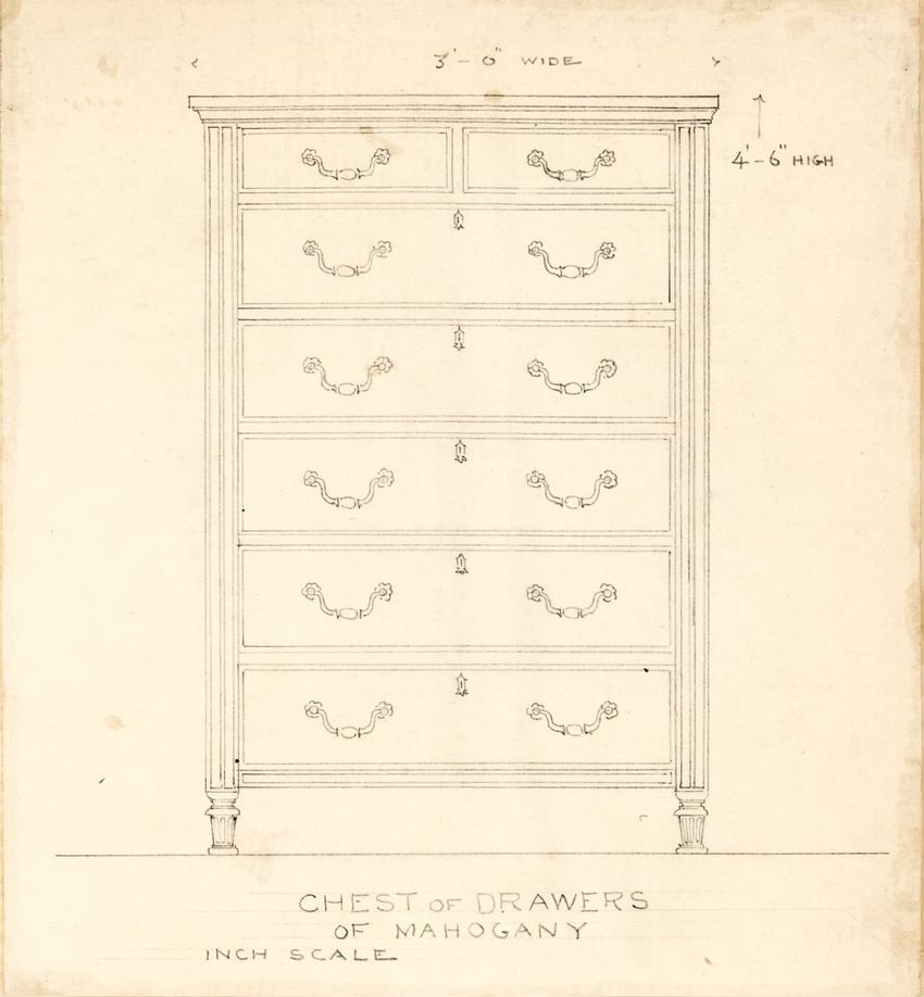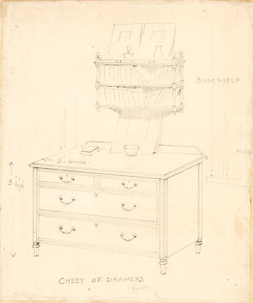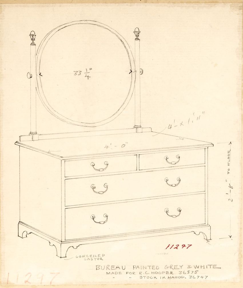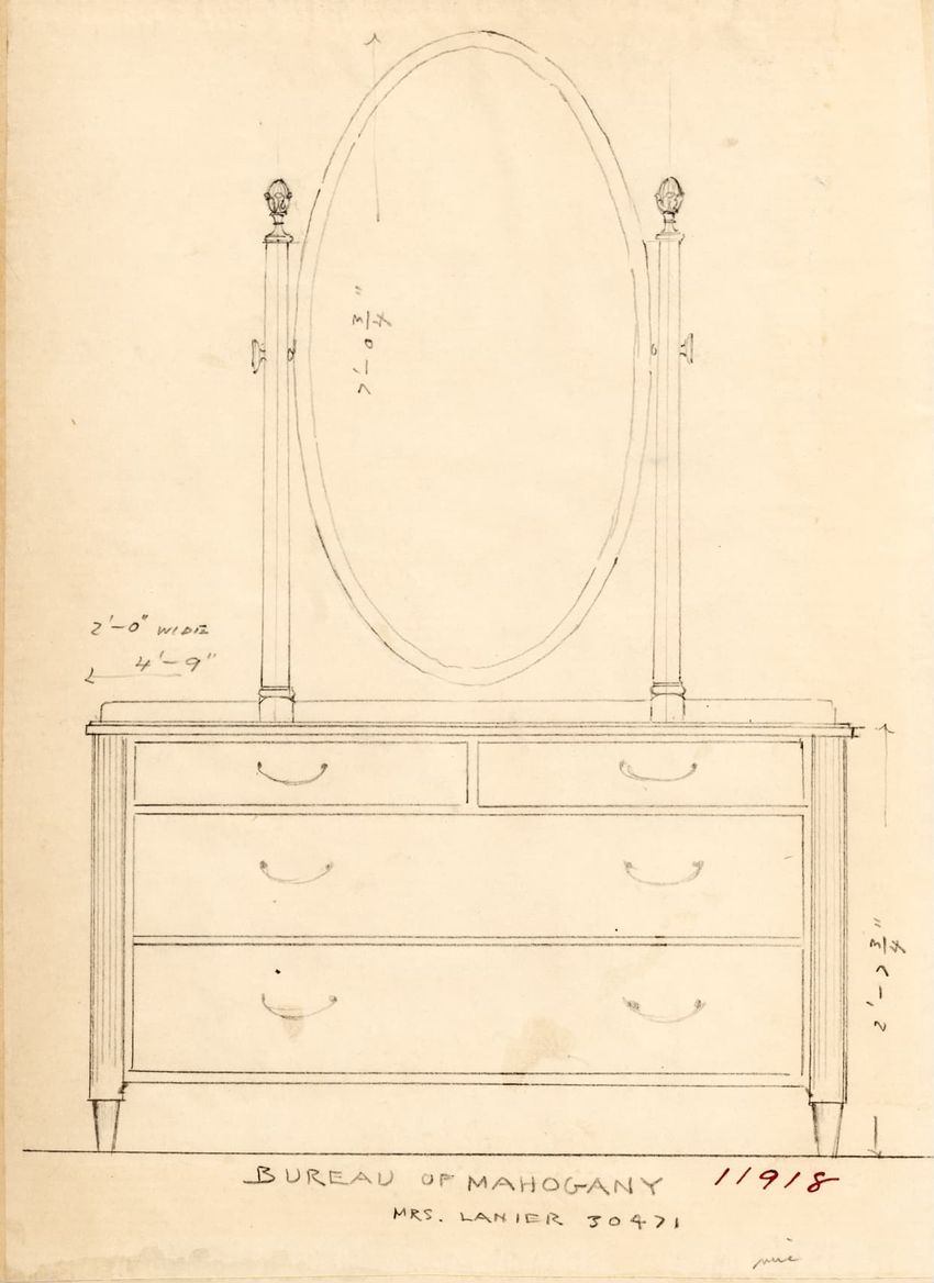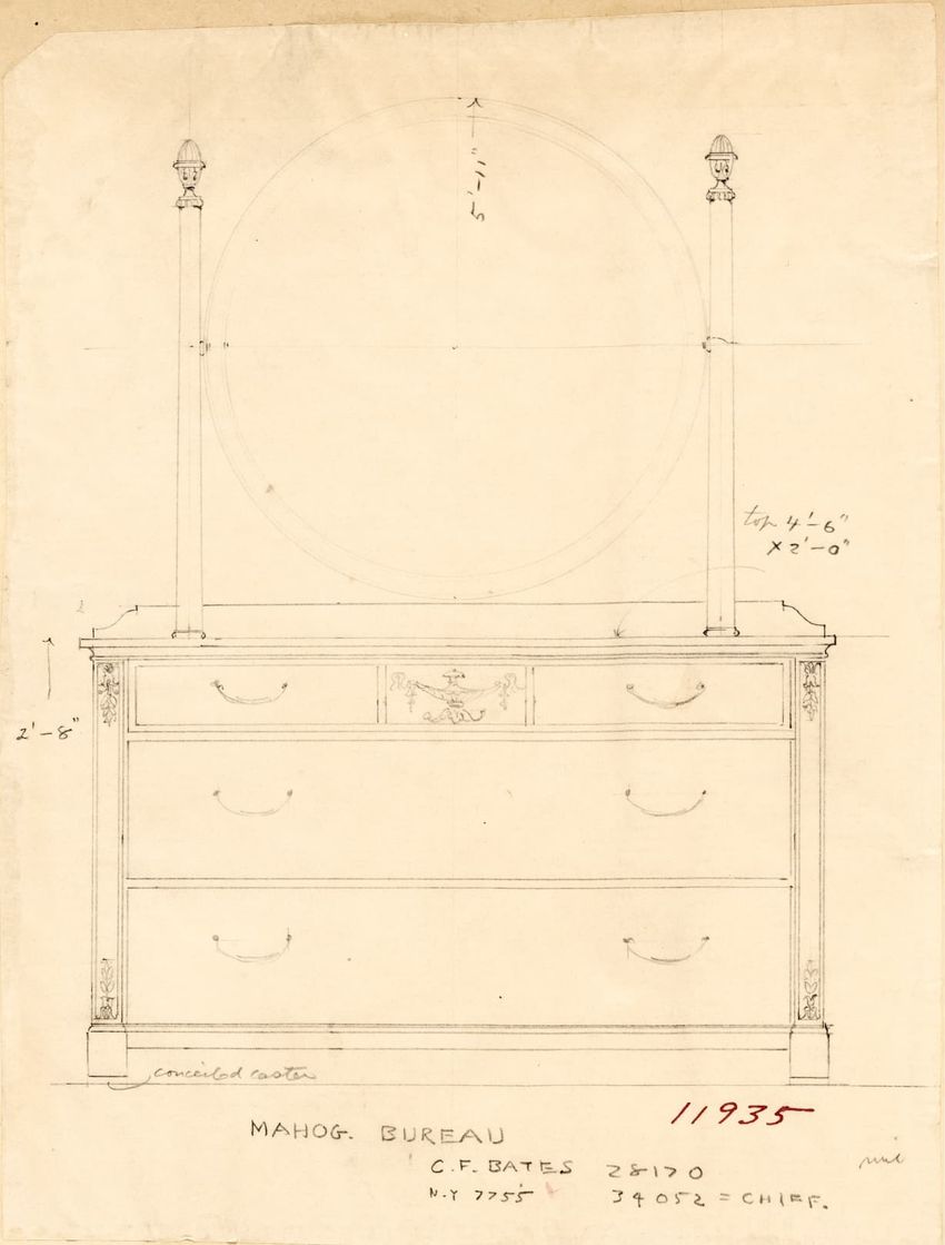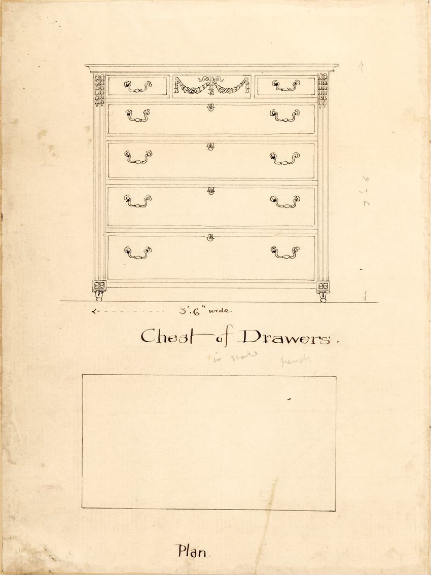 Untitled design drawing rendered in pencil on trace. Front and side views are shown. Rectangular bureau has overhanging top; four drawers with bail handles in a two-over-two arrangement; straight skirt; square stiles with carved, painted or inlaid trefoil motif and stringing; and tapered cylindrical...