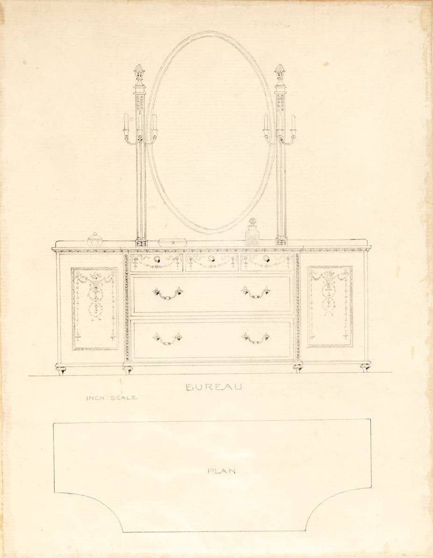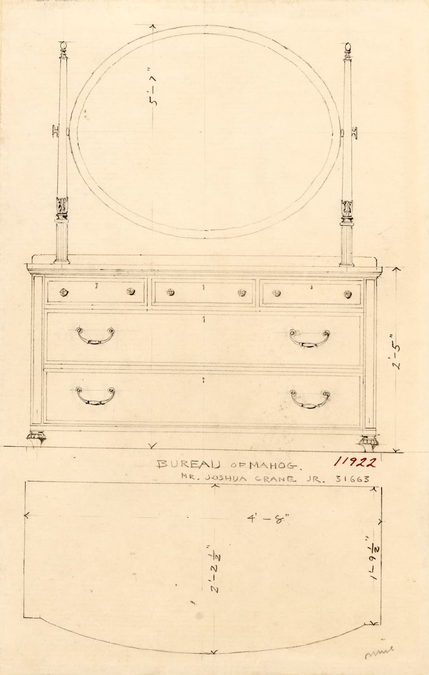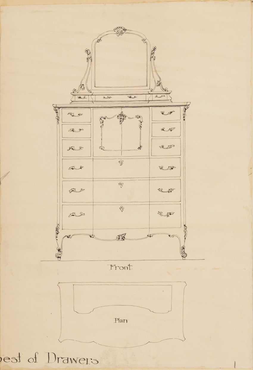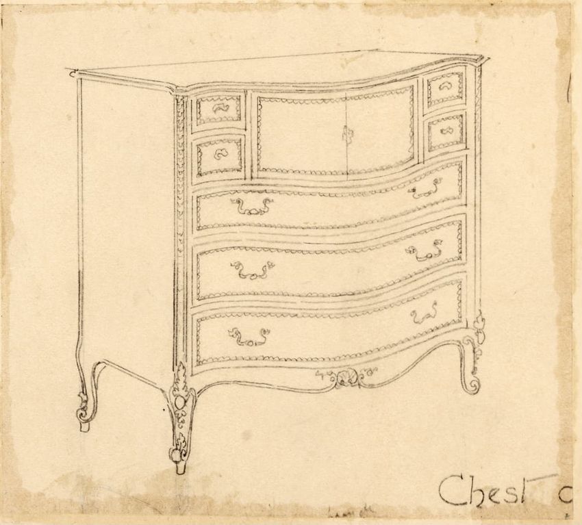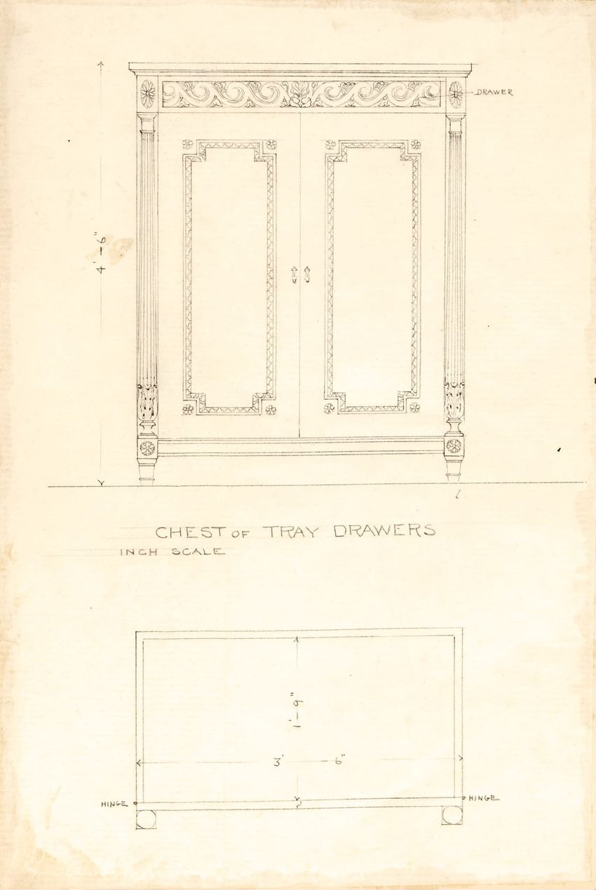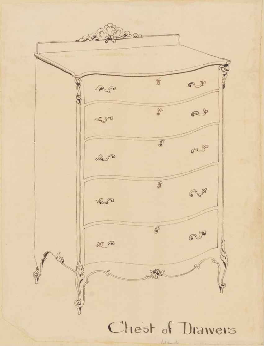 Untitled design drawing rendered in pencil on trace. Front and side views are shown. Rectangular bureau has overhanging top; four drawers with bail handles in a two-over-two arrangement; straight skirt; square stiles with carved, painted or inlaid trefoil motif and stringing; and tapered cylindrical...